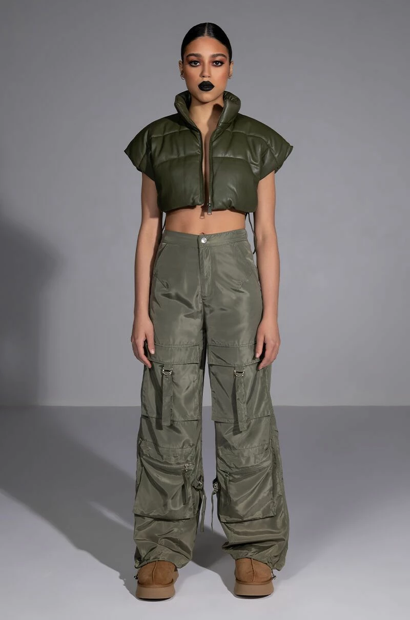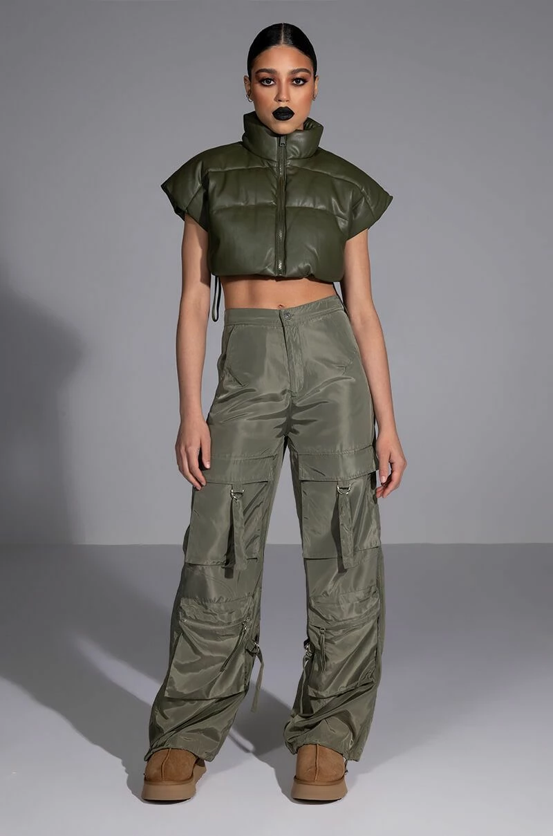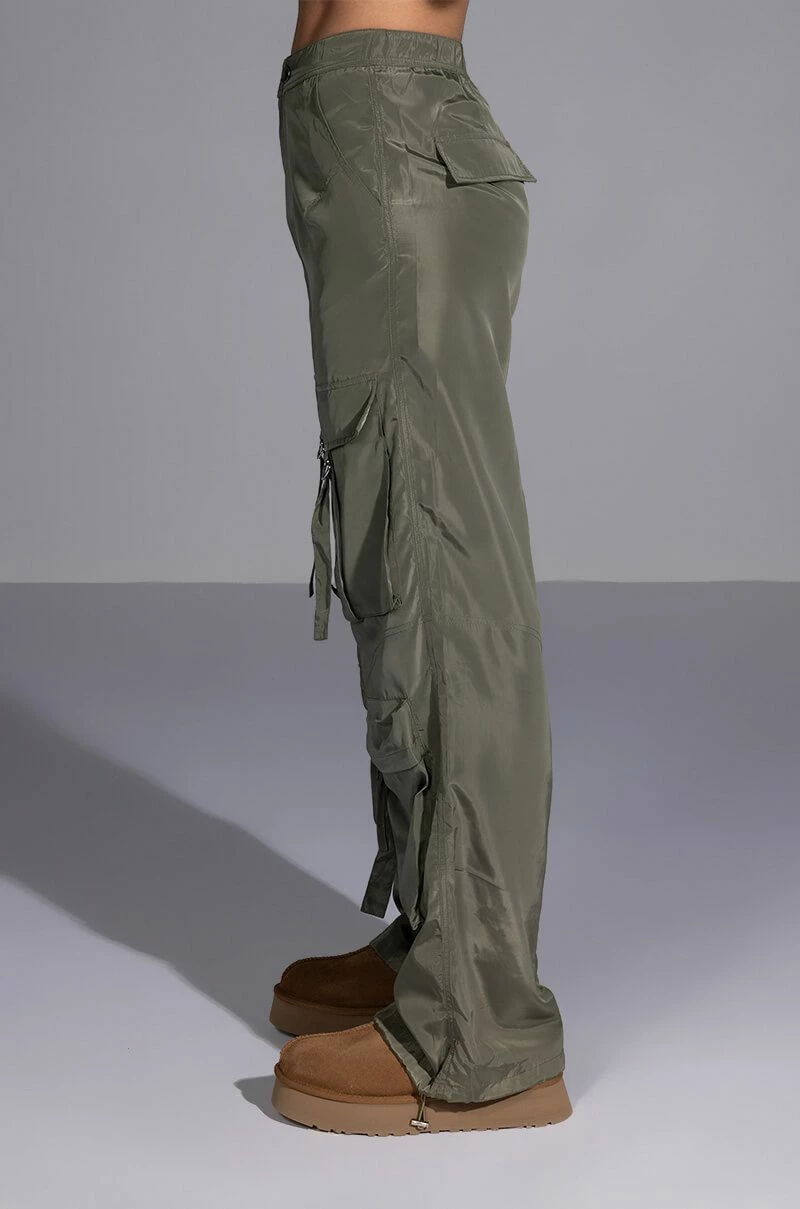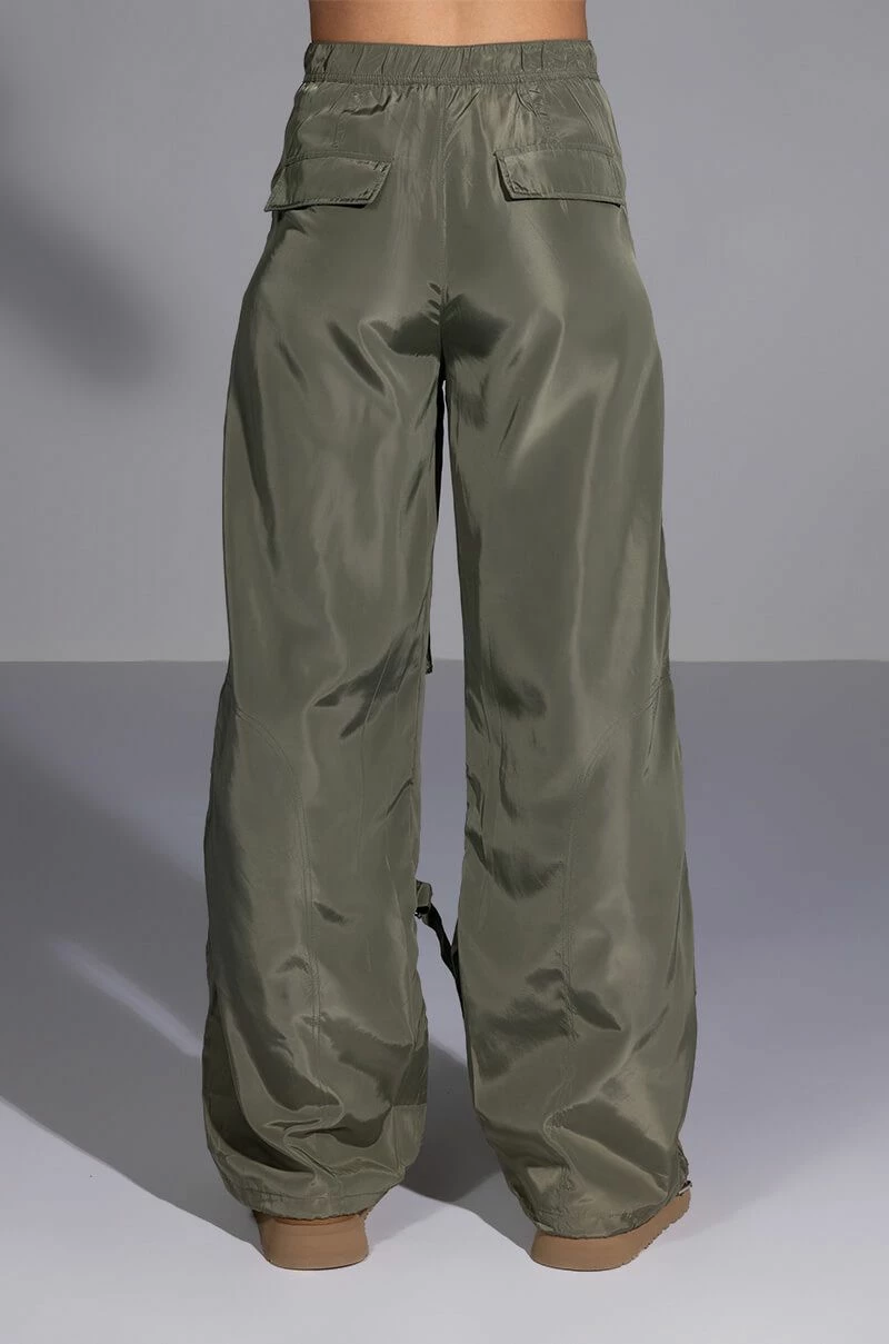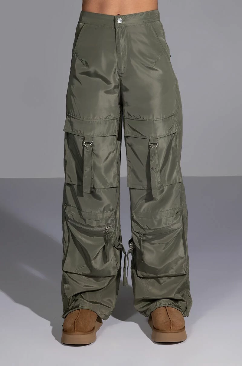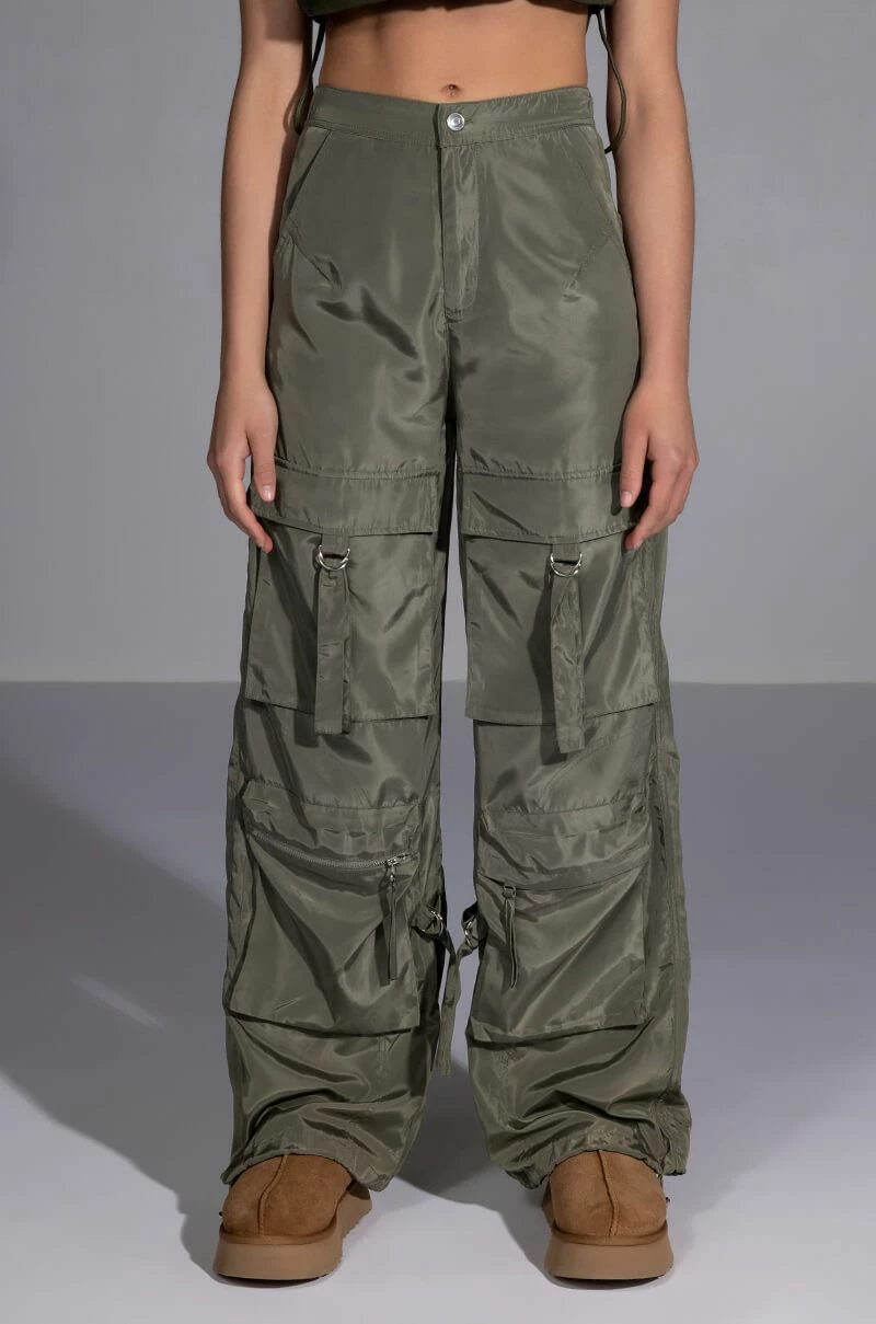 Add some edge to wardrobe with The AKIRA Label Alexa Cargo Pant. These wide leg pants feature a high waist rise, a slick nylon fabrication, slant side pockets, and two sets of cargo front pockets: one featuring a d-ring closure, and one featuring a zip tock closure. Complete with faux back pockets, strappy detailing, adjustable toggle-cinched hem detailing, and a zip front button closure. Top off your ensemble with a cropped graphic tee and chunky sneakers.