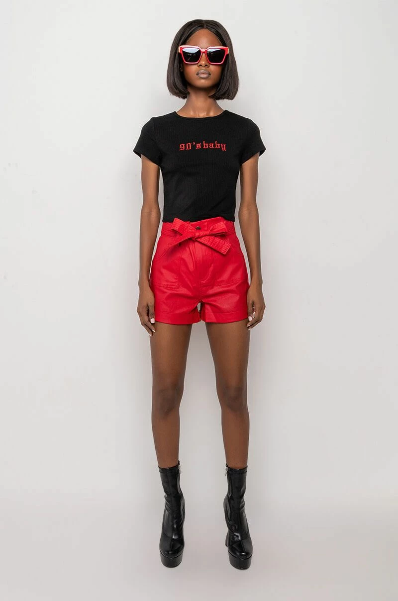 The AKIRA Label Alpha High Rise Pleather Shorts are cuffed shorts made from a vegan leather fabrication that are complete with a stretchy high rise waistline with paper bag backband detailing, four pockets, a self tie waist, and a snap button and zipper closure.