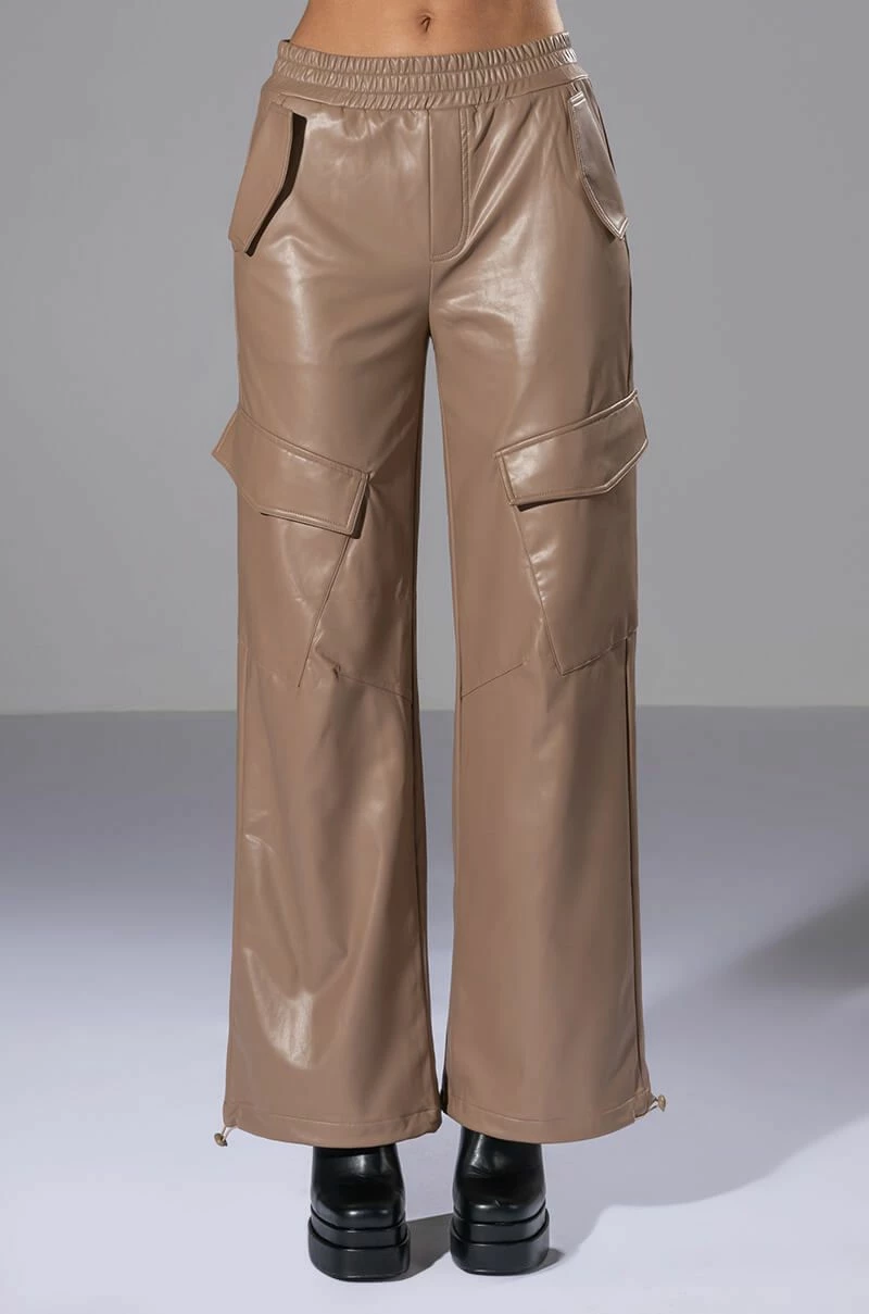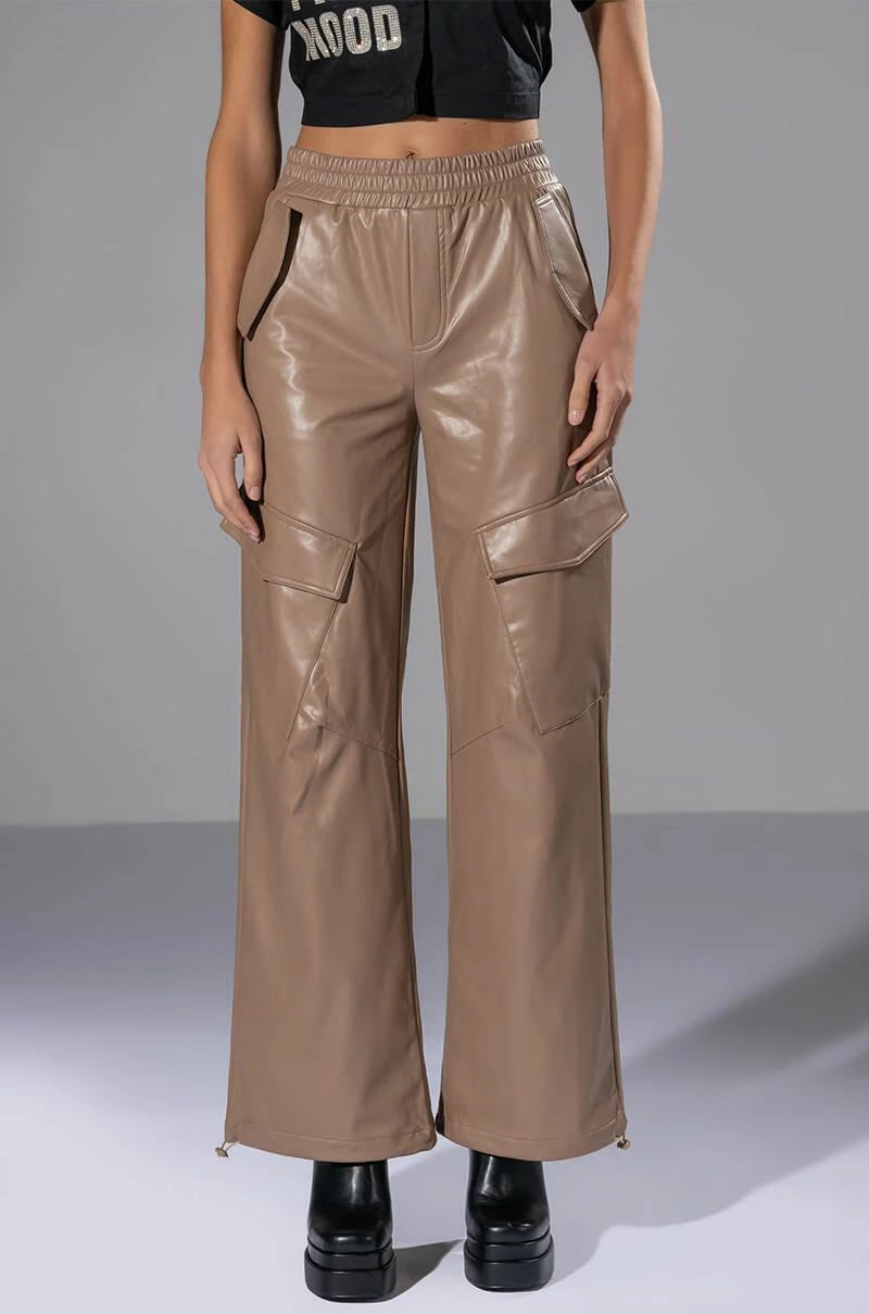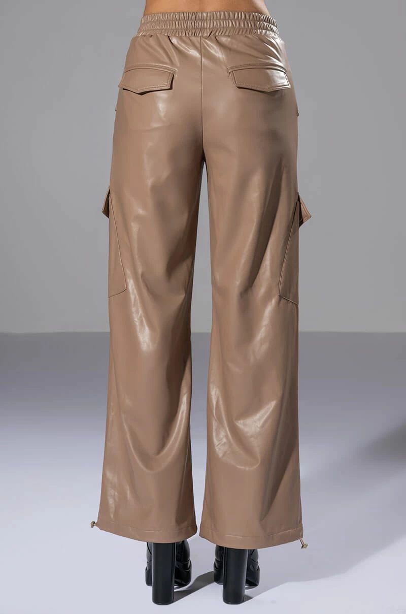 The AKIRA Label Always Winning Faux Leather Cargo Pants in Beige feature a stretchy vegan leather fabrication, a high rise silhouette, a wide elastic waistband, slant side pockets with pop button fold over flap detailing, pop button cargo thigh pockets, a wide leg silhouette, and drawstring hems. Complete with a zip button front closure and back pockets.