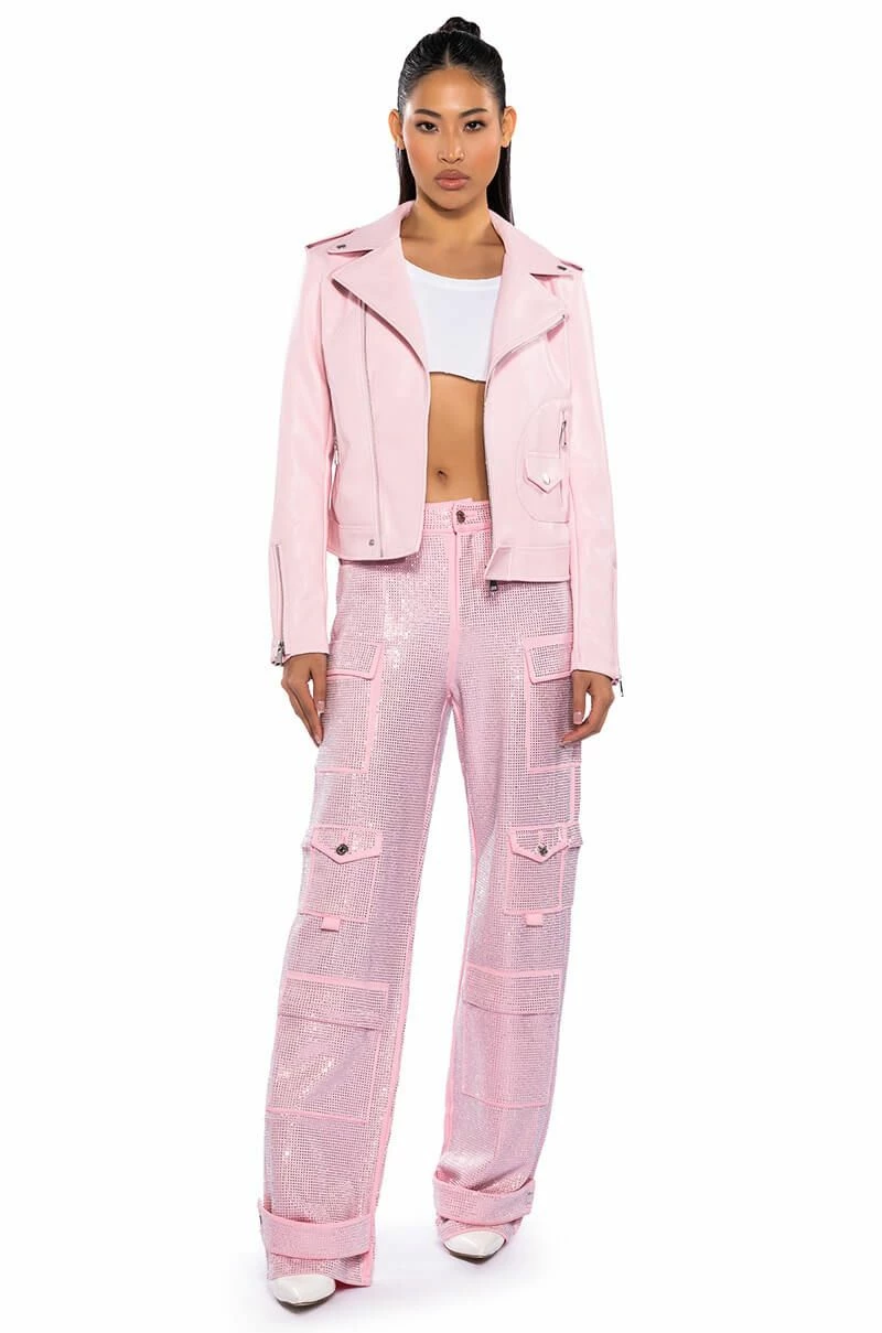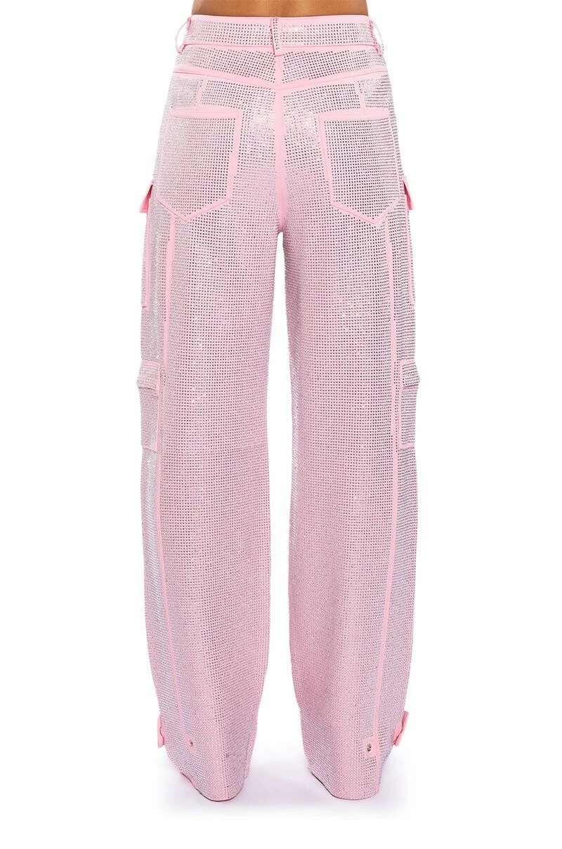 The AMMO Bonne Soiree Rhinestone Cargo Pants are made from a stretchy, cargo pant fabrication and features an all over rhinestone studded design, high rise waist, and classic zip-up button front closure. Complete with patch pockets, zipper cargo pockets, working back pockets, and a straight leg silhouette with adjustable snap closures at the hems. Pair with your fave baby tee and booties for your effortlessly glam soirée look!