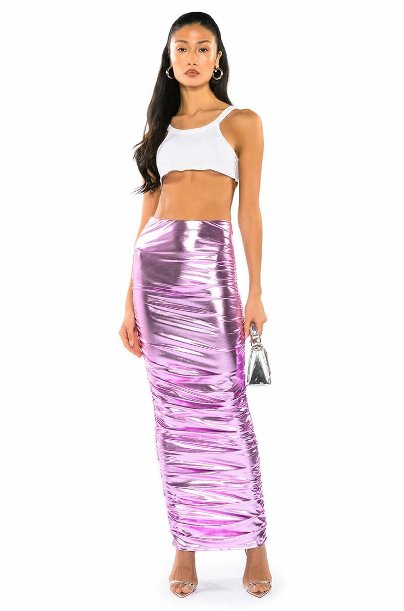 We think she fell from heaven, it’s The AKIRA Label Angel Energy Metallic Maxi Skirt! This ultra cute skirt is made from a stretchy, metallic base fabrication and features a high waist, sexy ruching at the sides, and a maxi length. Complete with a bodycon pull-on fit. Pair with cropped long sleeves and pumps or mesh bodysuits and booties for a finished intergalactic goddess look.