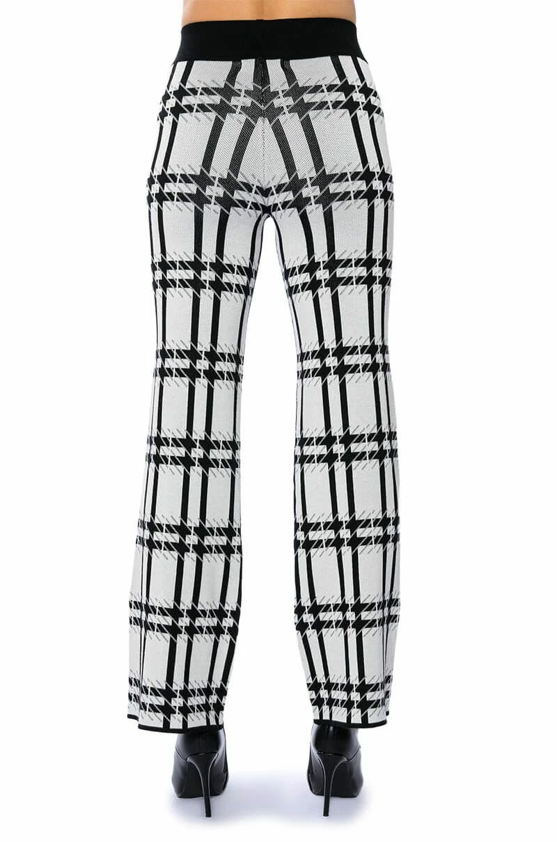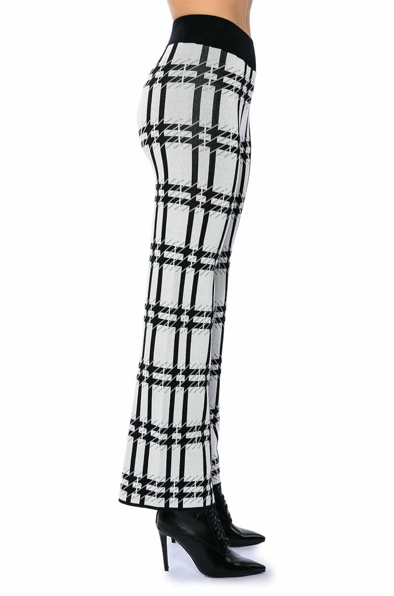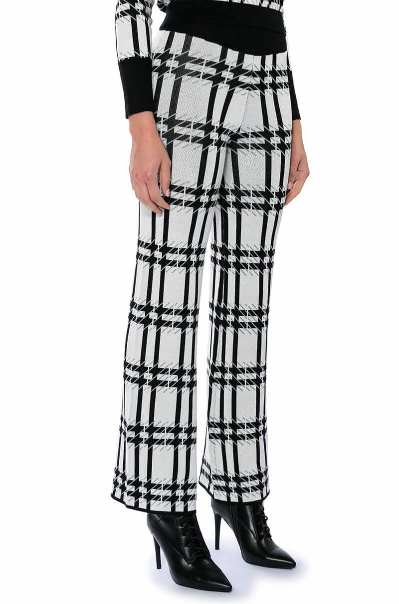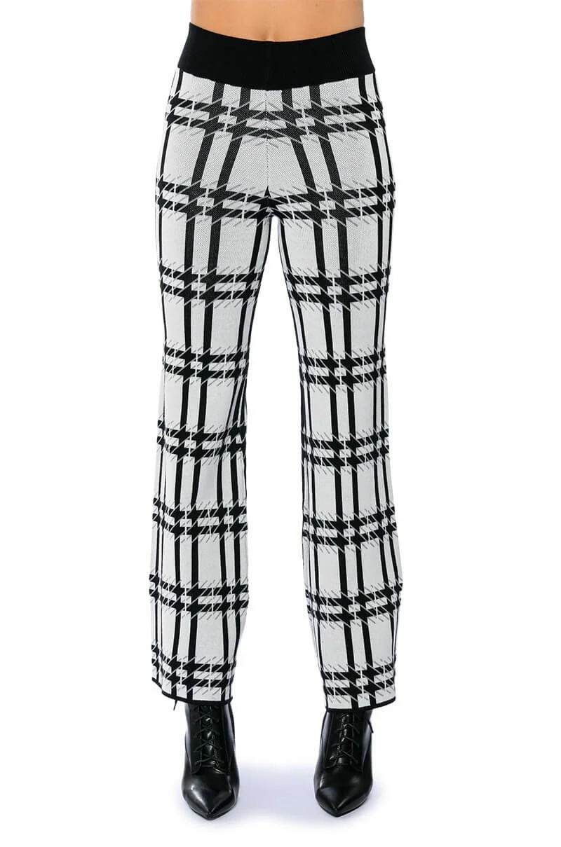 The AKIRA Label Aspen Vacay Sweater Pant is part of a two-piece set perfect for your winter slaycation! It features a stretch knit base fabrication with an abstract houndstooth knit design. Complete with a ribbed knit elastic waistband, wide leg silhouette, high waist, and slip-on fit. Style with the coordinating AKIRA Label Aspen Vacay Long Sleeve Sweater and heeled boots for a chic look.