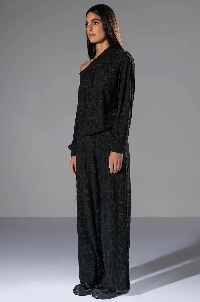 The AKIRA Label Be Here Textured Wide Leg Sweatpant is made from a cozy sweatpant fabrication and features terry-embossed clustered letter detailing, a high rise waist, a wide ribbed elastic drawstring waistband, slant side pockets, and a wide leg silhouette. Pair this piece with the matching AKIRA Label Be Here Textured Off Shoulder Sweatshirt to complete your look.