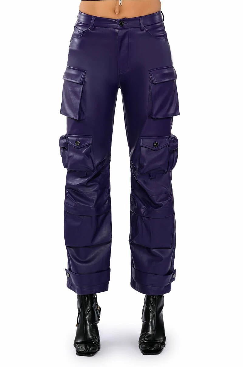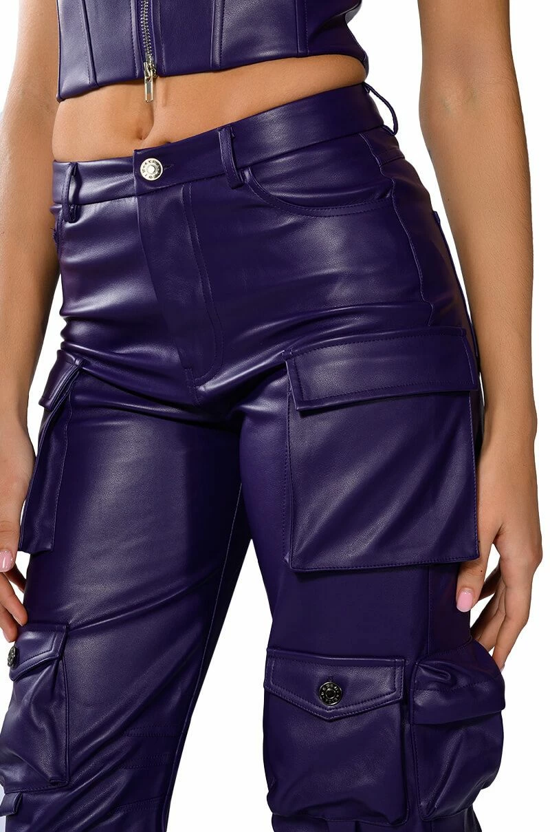 Check-in with the girls in The AKIRA Label Bonne Soiree Cargo Faux Leather Pants! These sexy and fresh pants feature a smooth vegan leather fabrication, a high rise silhouette, a classic zip-up button front closure, various side cargo pockets with button fold over flap detailing, flap pockets, and zippered pockets. Complete with a wide leg silhouette, adjustable strap bottom hems, utility seaming, and back pockets. Pair with a mesh long sleeved bodysuit and heels for a bonne soirée look!