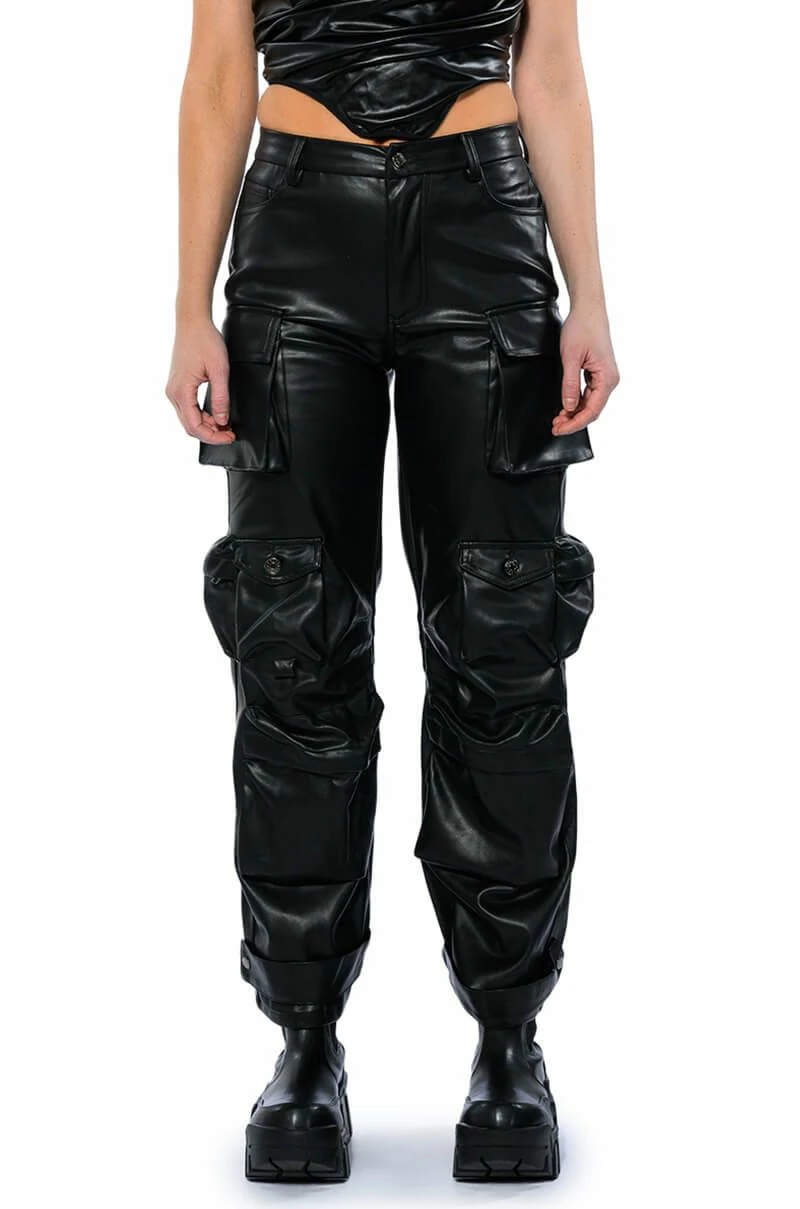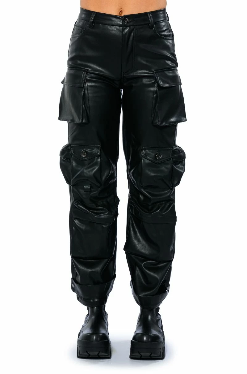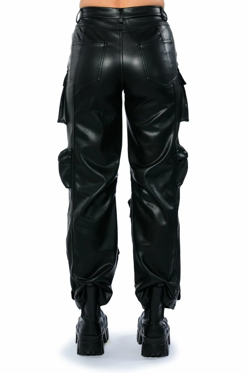 The AKIRA Label Bonne Soiree Cargo Faux Leather Pants are made from a pebbled faux leather fabrication and feature a high rise waist, a classic five-pocket design, and a zip-up button front closure. Complete with flap pockets, zipper cargo pockets, working back pockets, and a straight leg silhouette with adjustable snap closure at the hems. Pair with your fave cropped tee and booties for your effortless soiree look!