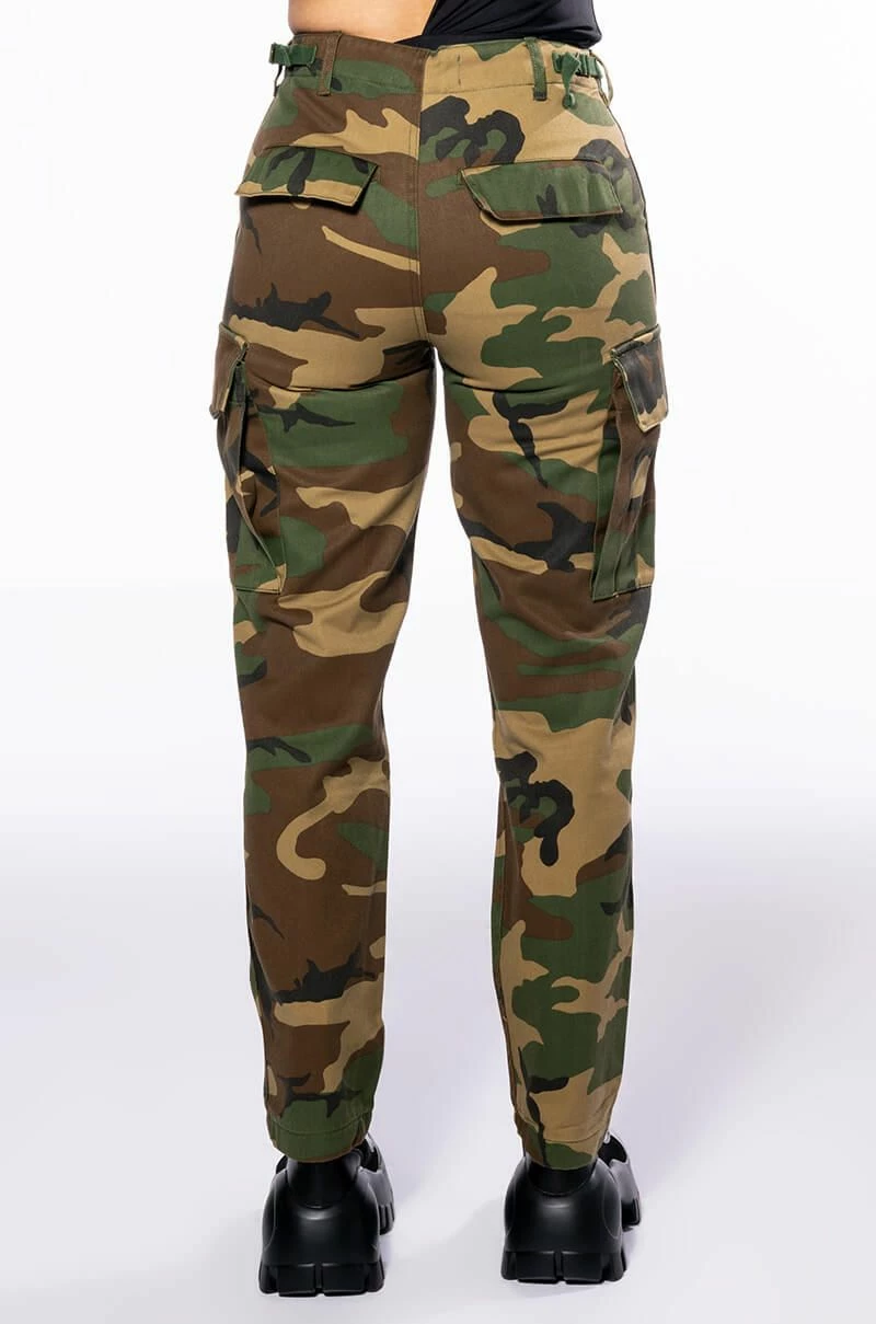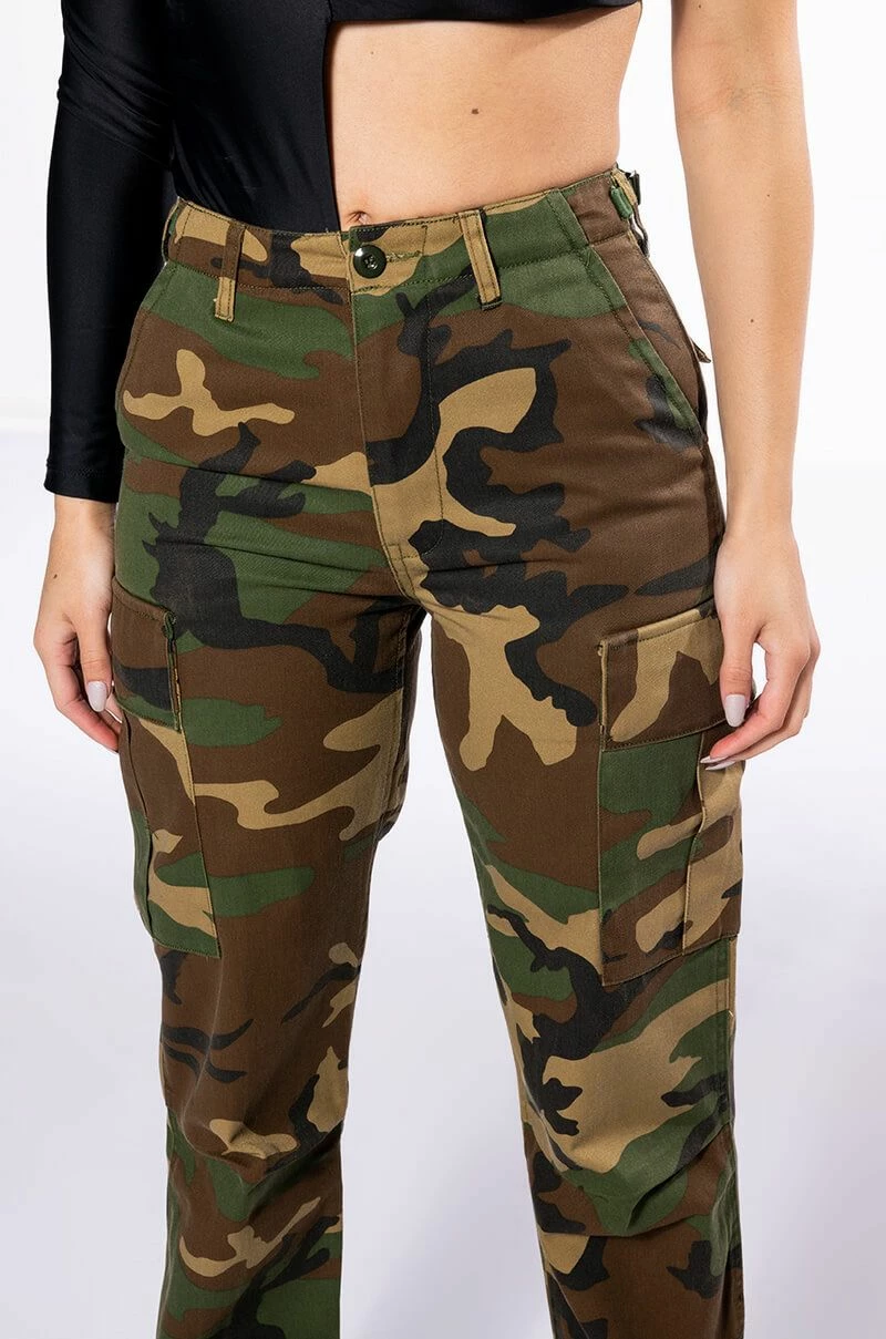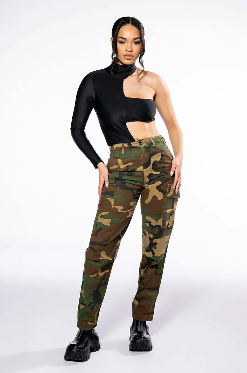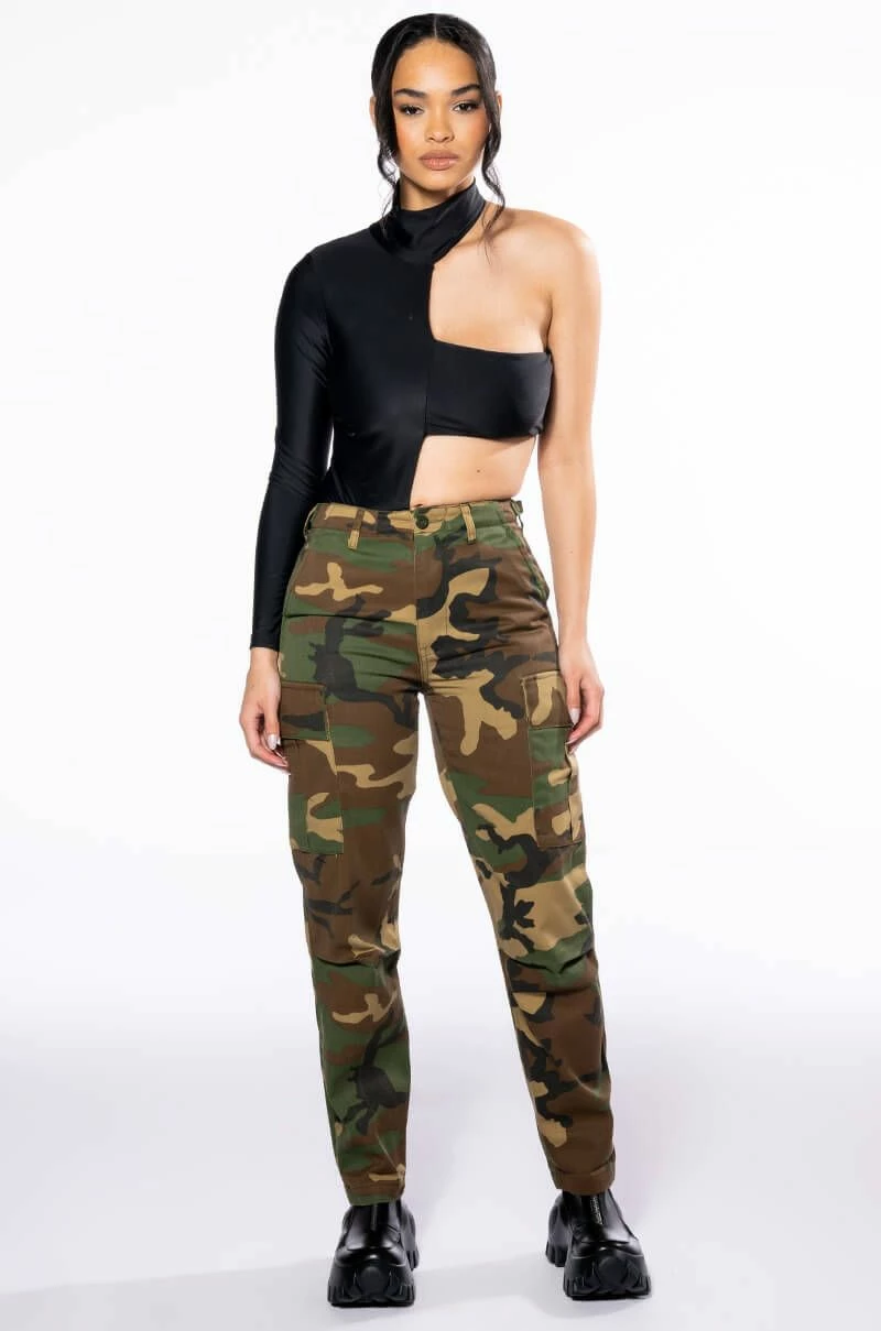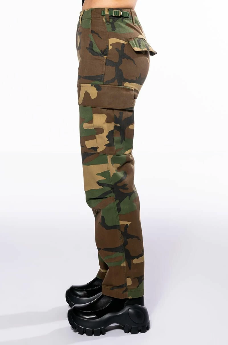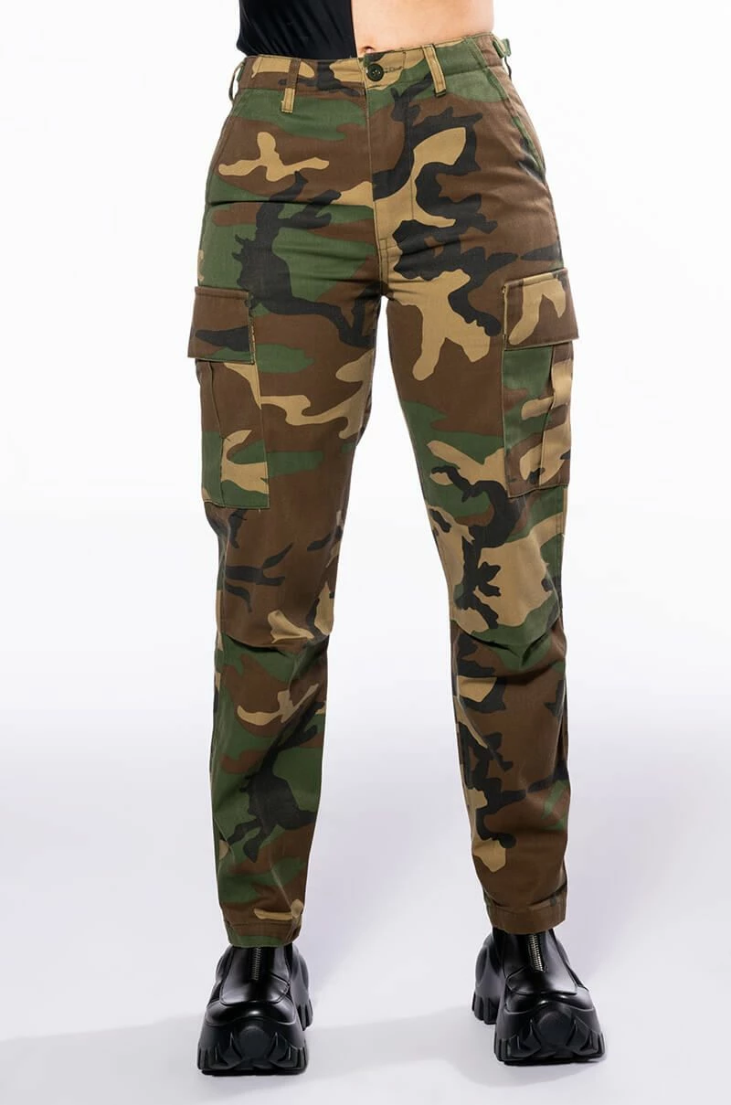 The AKIRA Label Break The Rules Straight Leg Cargo Pant features a high waist rise, a structured canvas fabrication, slant side pockets, button flap back pockets, and button flap front cargo pockets at the thigh. Complete with camo print patterning, a straight leg silhouette, adjustable pull tab side detailing, working belt loops, and a zip front button closure.