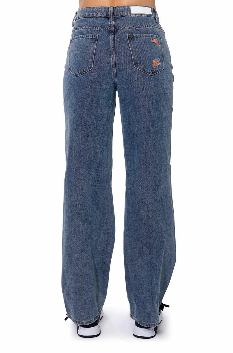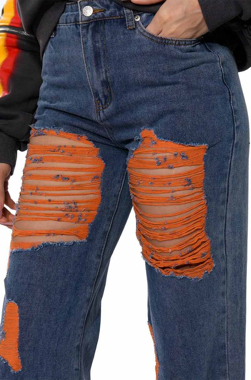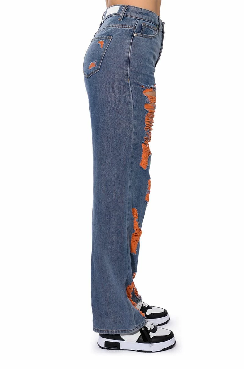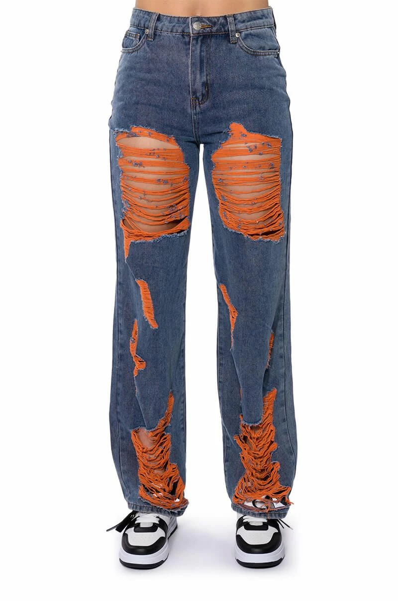 The AKIRA Label Carefree Distressed Color Relaxed Fit Jeans are made from a washed denim fabrication and feature a high rise waist, working belt loops, a classic five-pocket design, a relaxed leg silhouette, and a front button and zipper closure. Complete with colorful distressed body and back pocket detailing.