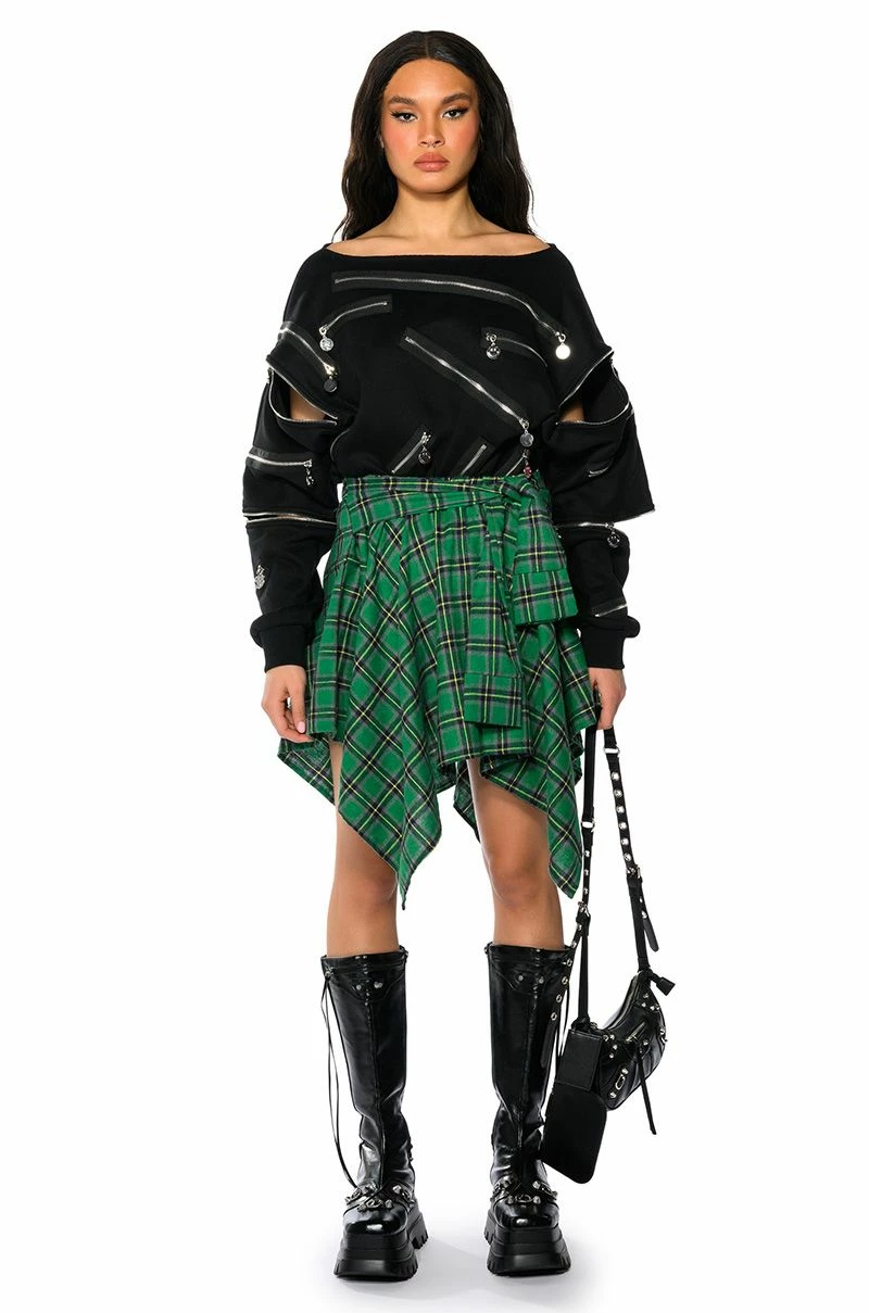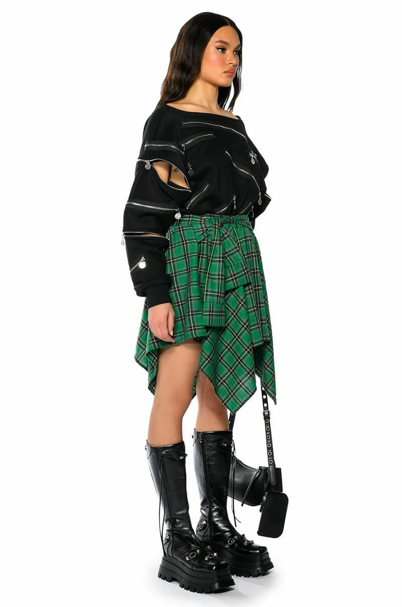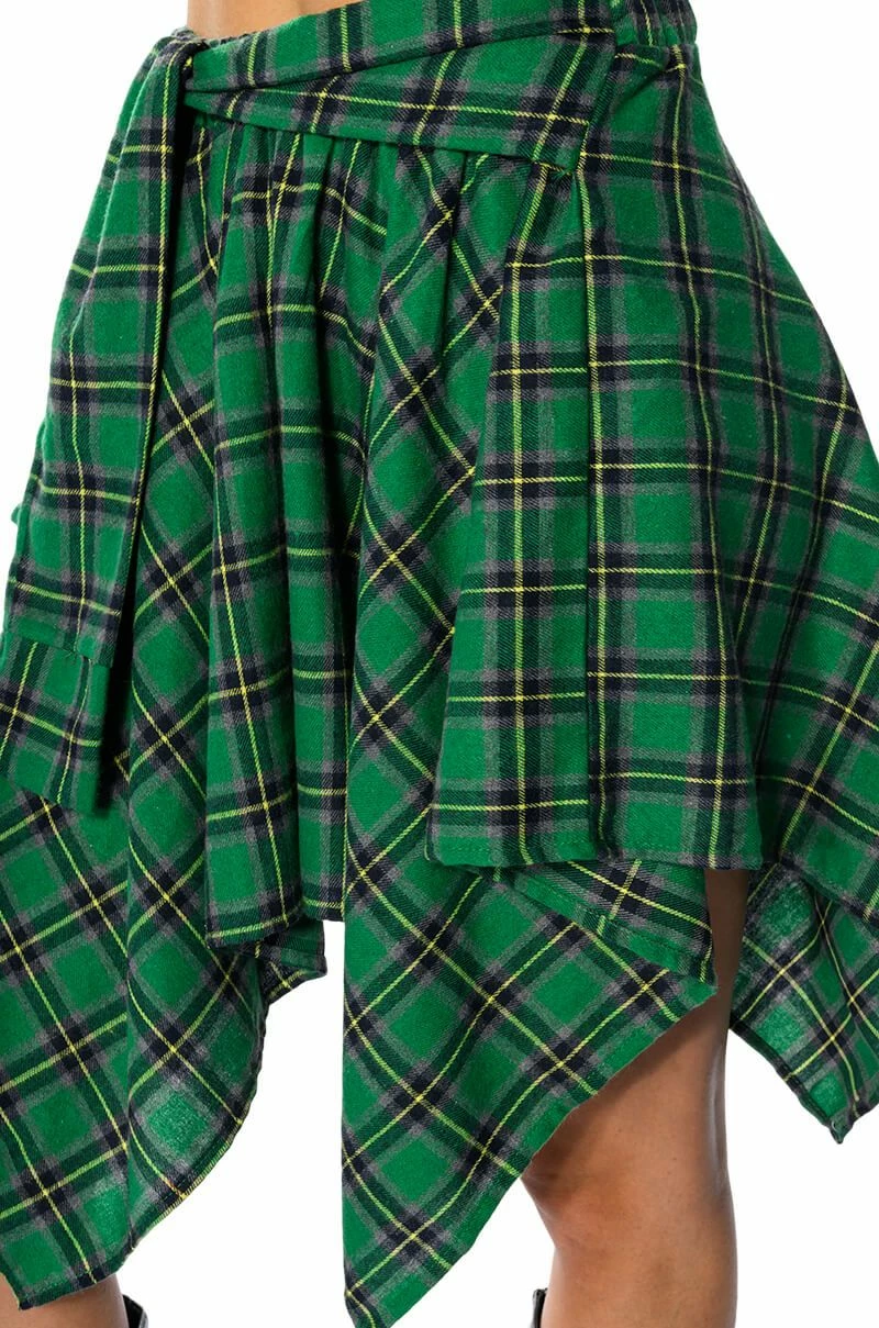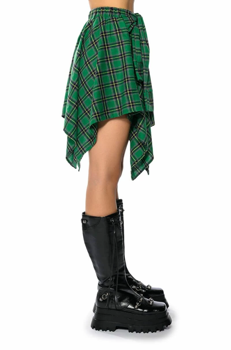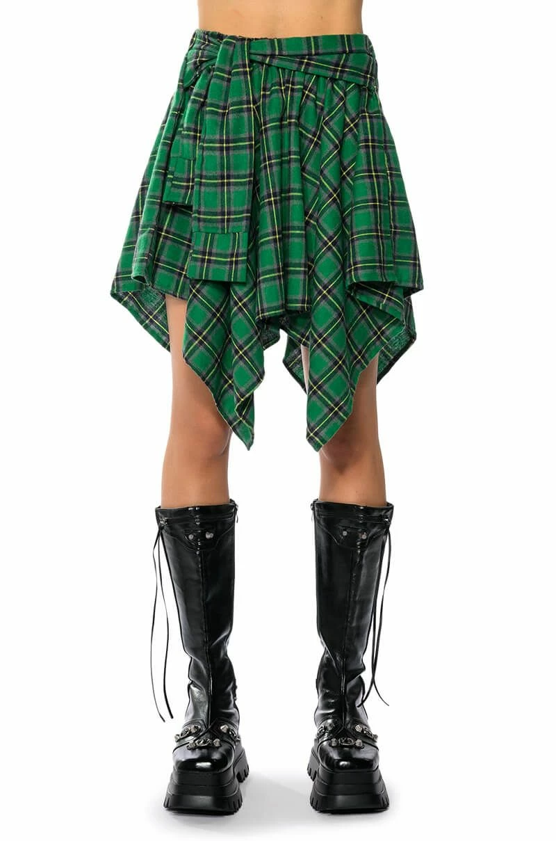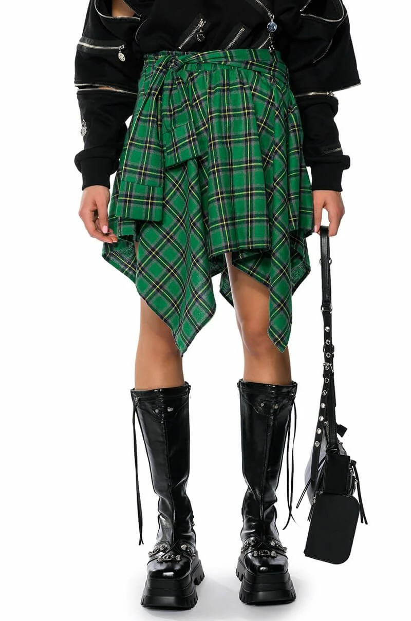 The AKIRA Label Charly Mini Plaid Skirt is a mini skirt complete with handkerchief hems and a soft, plaid fabrication. It features an elastic waistband, a front-tie band, and a slip-on fit. This piece will look adorable with your seasonal neutrals, or with a cropped tee, moto jacket, and booties.