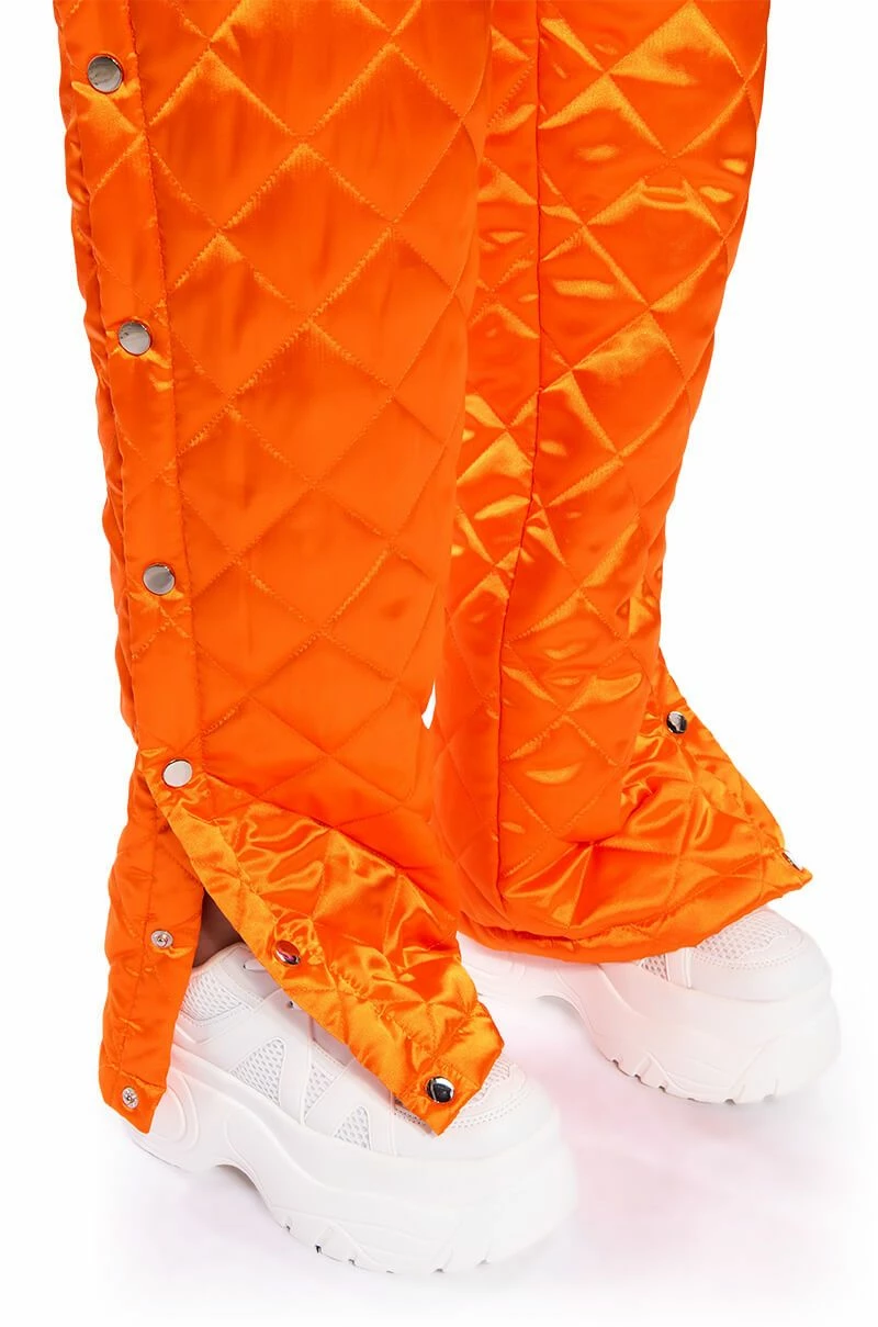 Comfort never looked so cute! The AKIRA Label Cozy Mode Quilted Satin Breakaway Jogger features a quilted satin fabrication, a high rise waist, a ruched elastic waistband, straight pant legs, silver metallic hardware, and breakaway pop button sides. Pair this piece with the coordinating AKIRA Label Cozy Mode Quilted Satin Vest for a complete look.