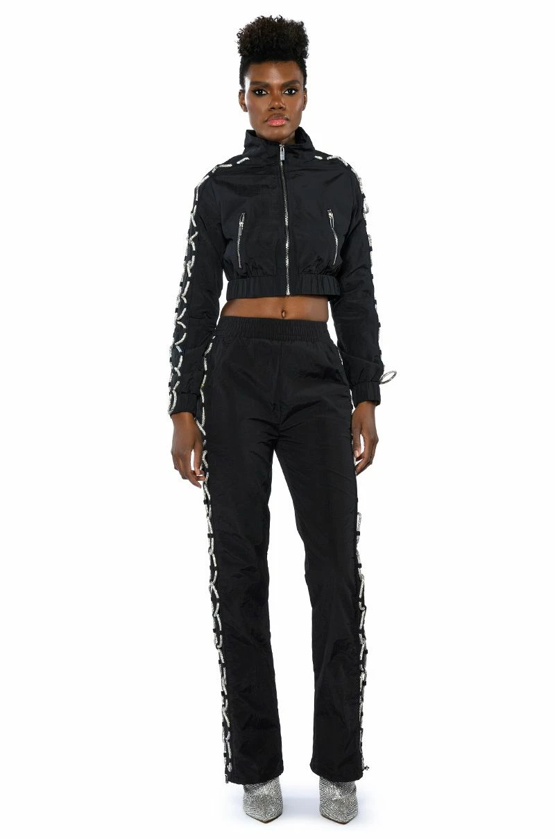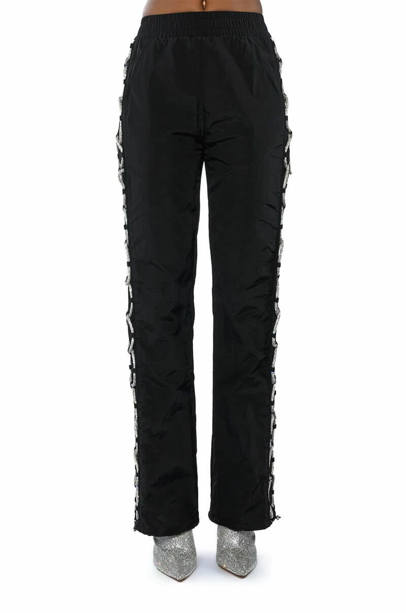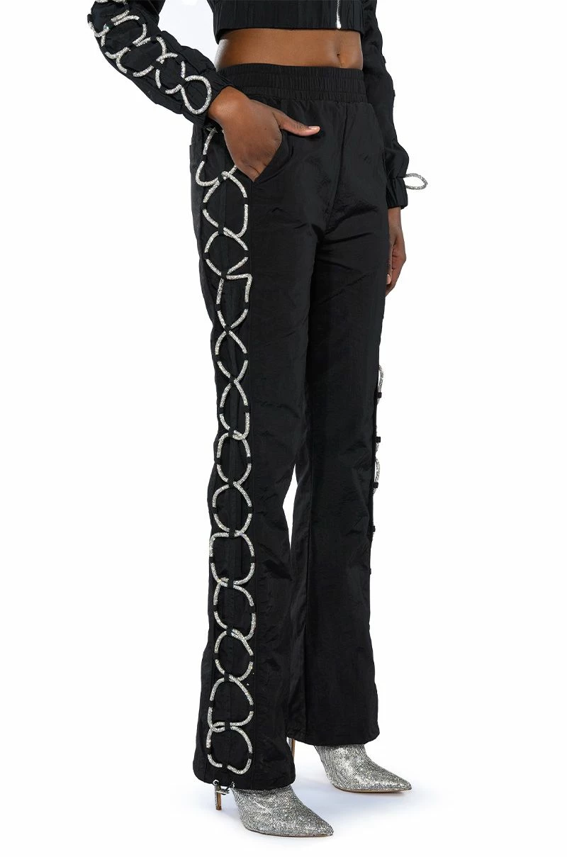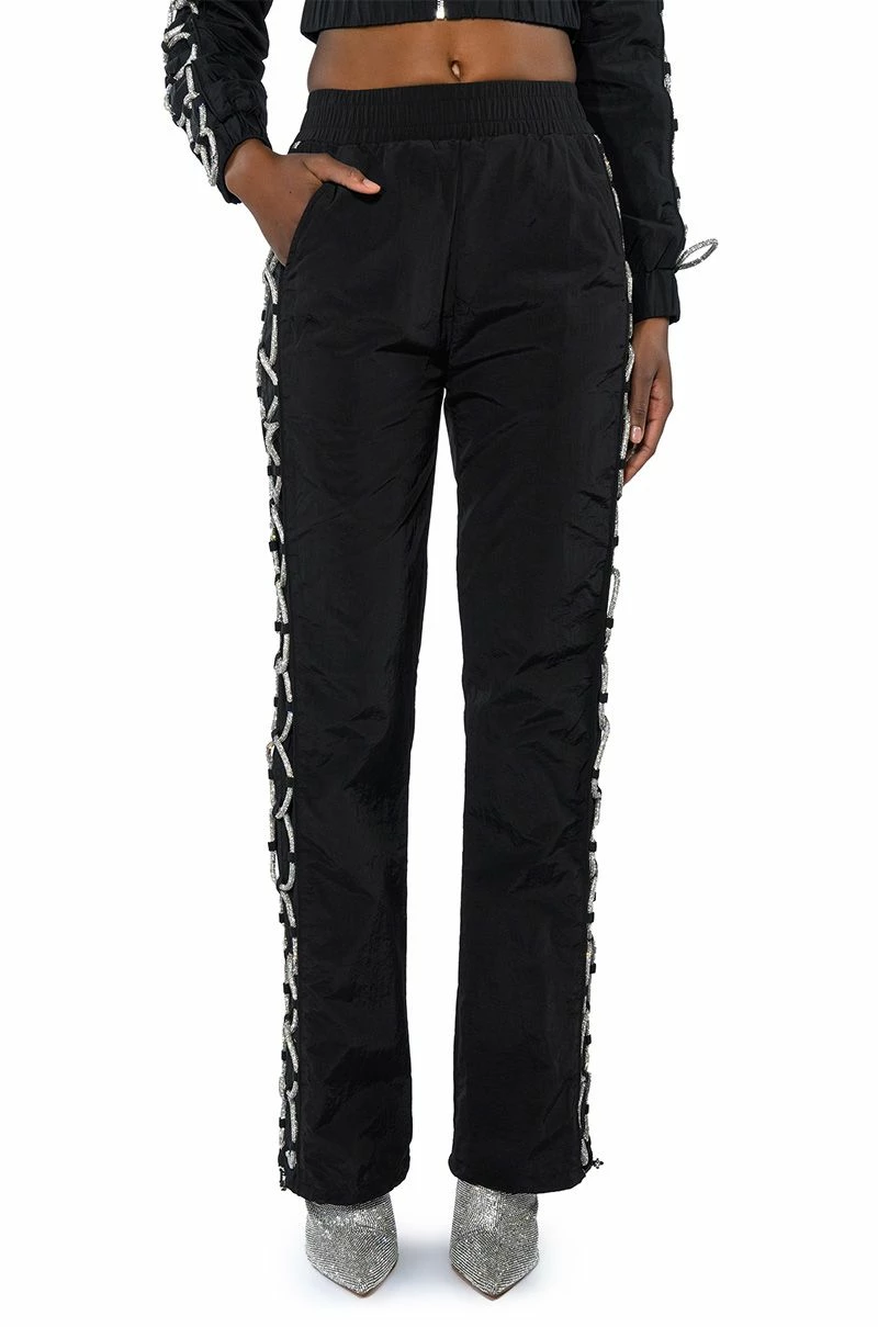 The AKIRA Label Diamond Lace Up Track Pant is made from a nylon fabrication and is complete with front pockets, a high rise elastic waistband, pull-on silhouette, mock back pockets, drawstring ankle details, and rhinestone lace up side detailing. Pair this piece with the coordinating AKIRA Label Diamond Lace Up Up Track Jacket to complete your sparkling athleisure look.