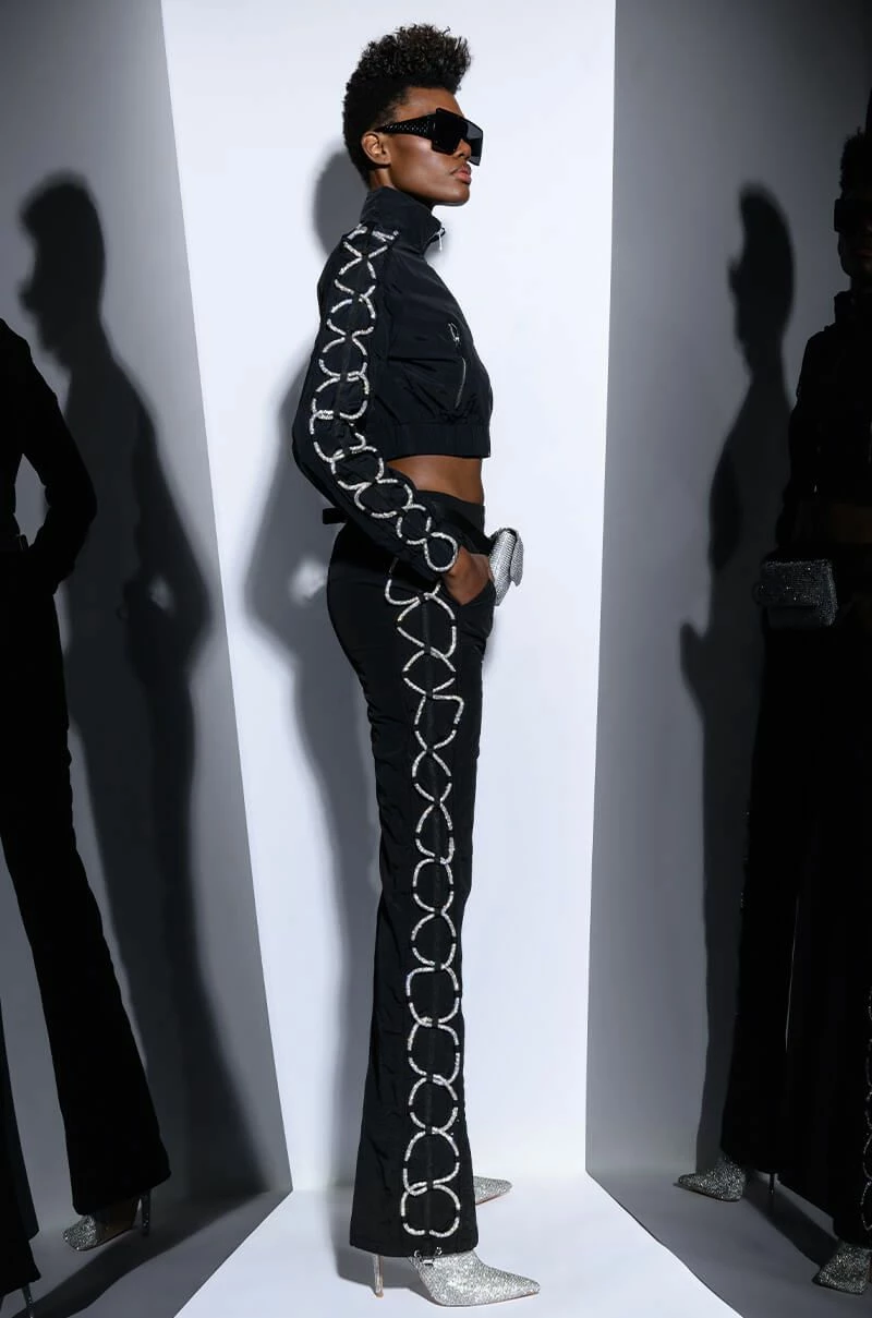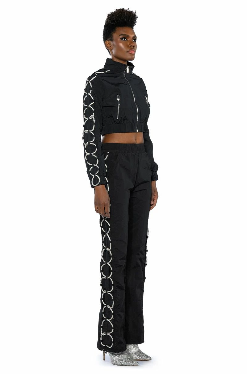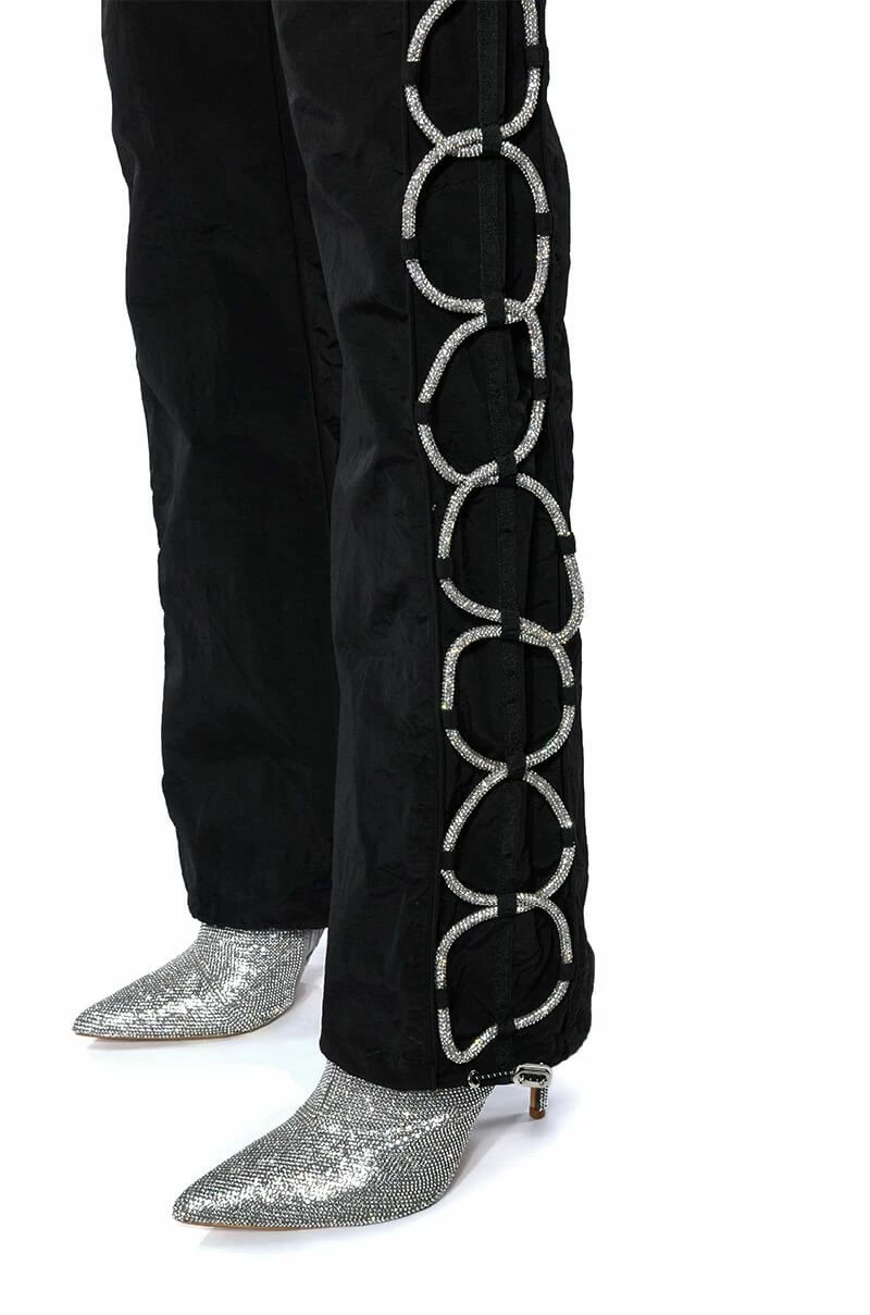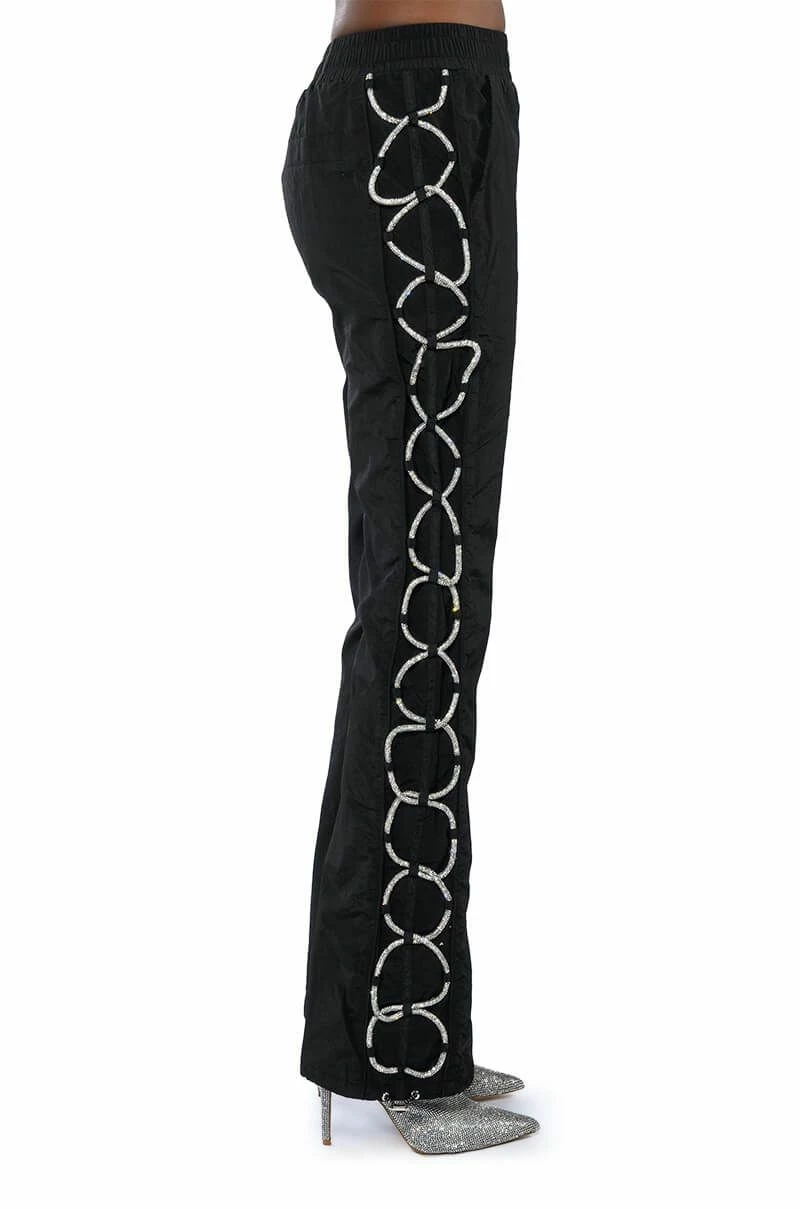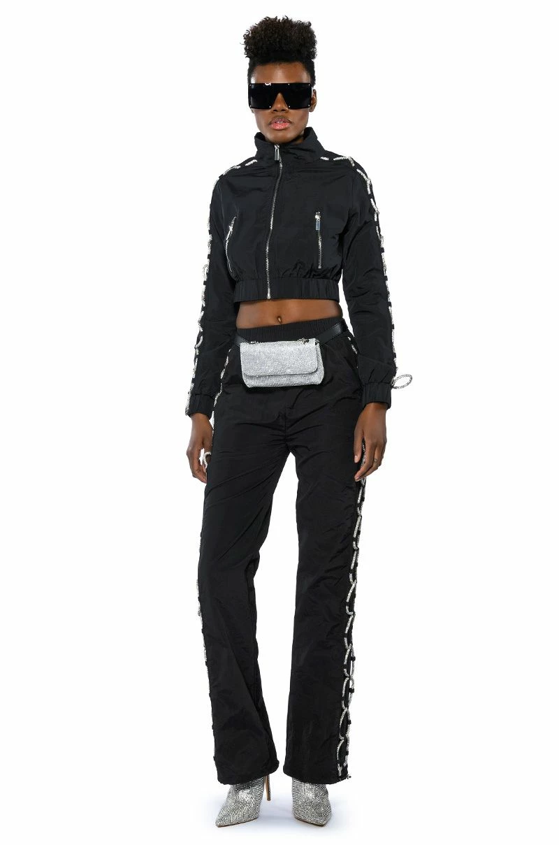 The AKIRA Label Diamond Lace Up Track Pant is made from a nylon fabrication and is complete with front pockets, a high rise elastic waistband, pull-on silhouette, mock back pockets, drawstring ankle details, and rhinestone lace up side detailing. Pair this piece with the coordinating AKIRA Label Diamond Lace Up Up Track Jacket to complete your sparkling athleisure look.