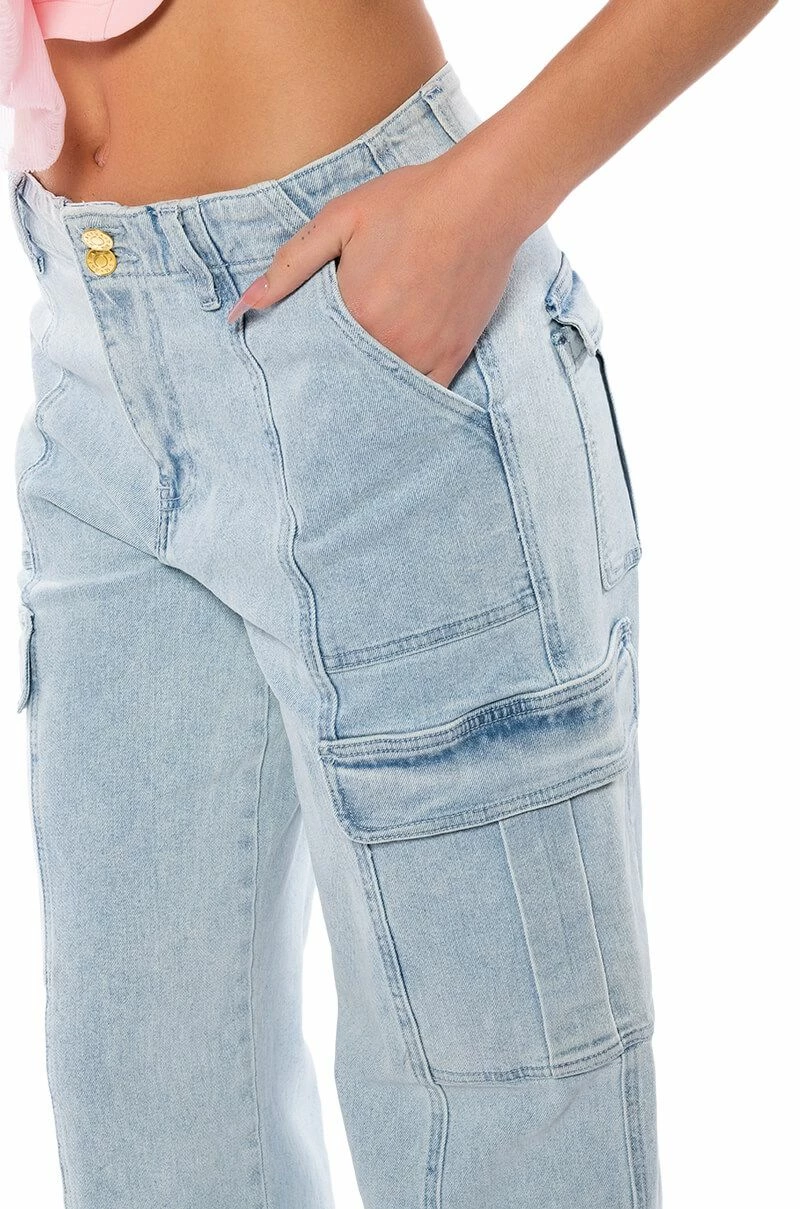 The AKIRA Label Eliza Denim Cargo Pant is made from a washed denim fabrication and features a high rise waist, working belt loops, front pockets, cargo flap back and side pockets, a wide leg silhouette, and a doubled button and zipper front closure. Pair this piece with the matching AKIRA Label Eliza Denim Corset Top and chunky sneakers to complete your look.