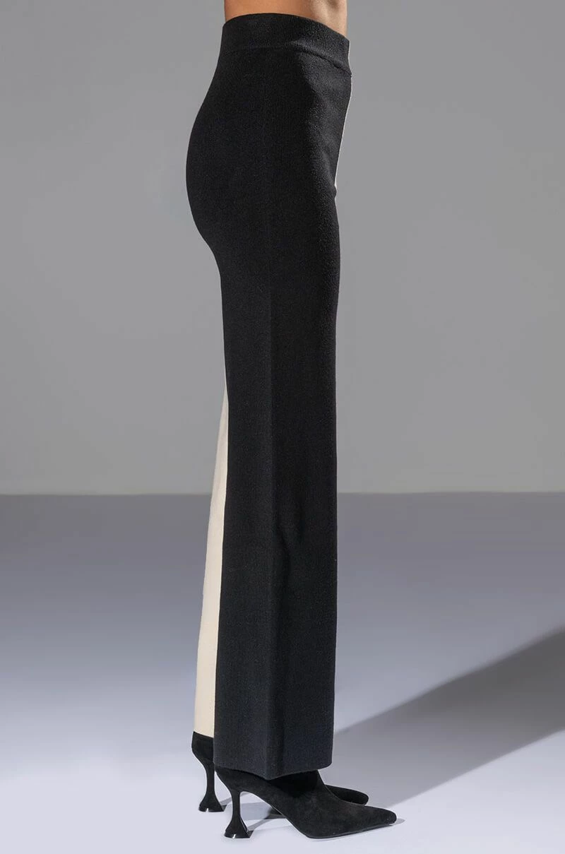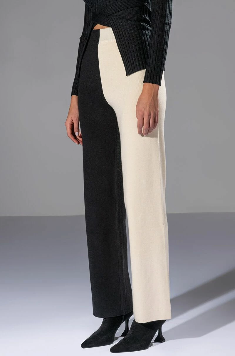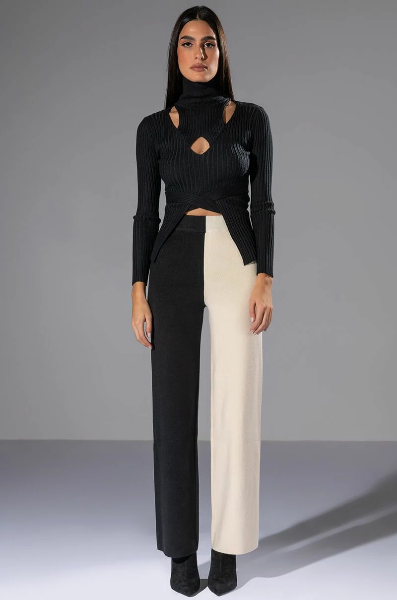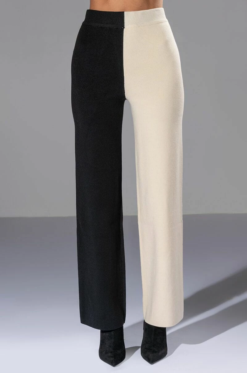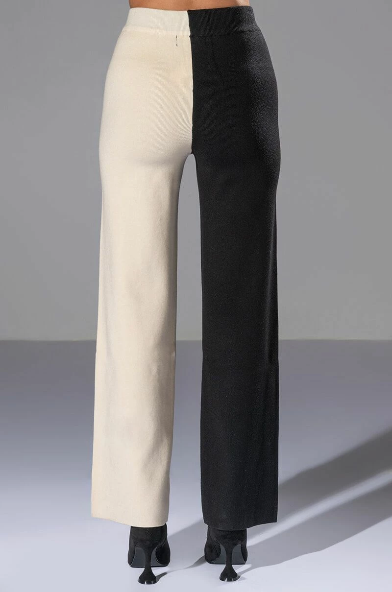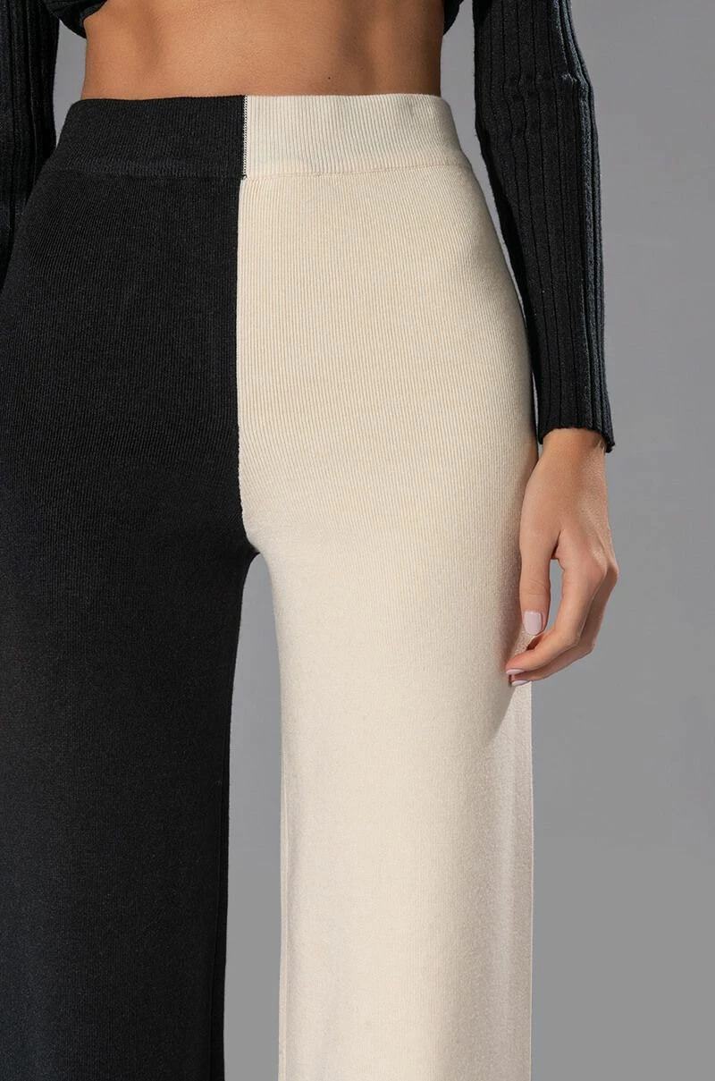 Turn heads with The AKIRA Label Envy Me Colorblocked Knit Wide Leg Pant. This high rise pant features a soft, ribbed knit base, wide legged hems, and a colorblocked two tone design. Pair with a tie front blouse and sky high stilettos for a corporate look, or with a matching cozy sweater and pull on loafers for an effortless day-off look.