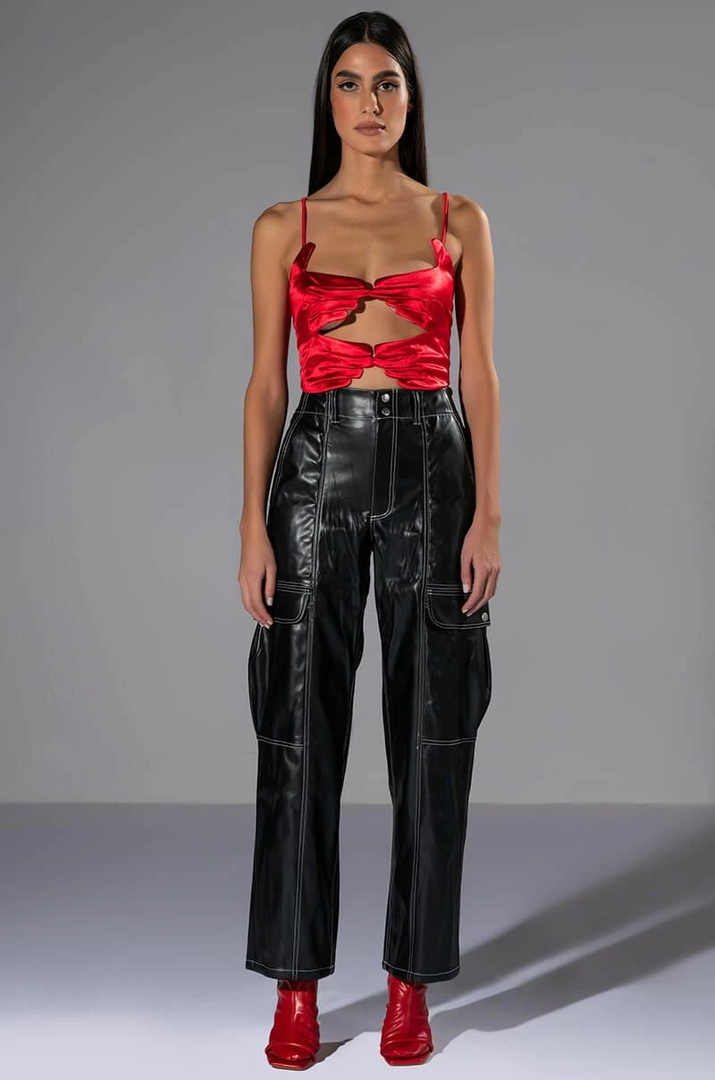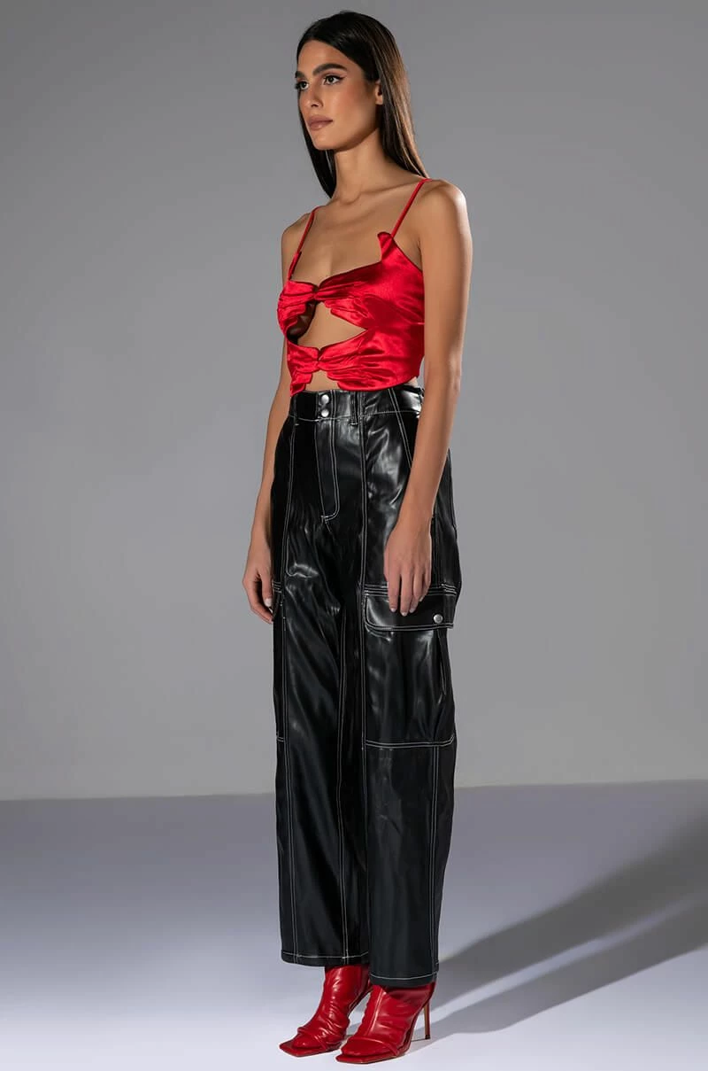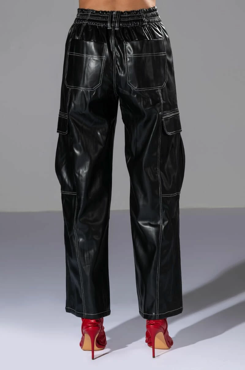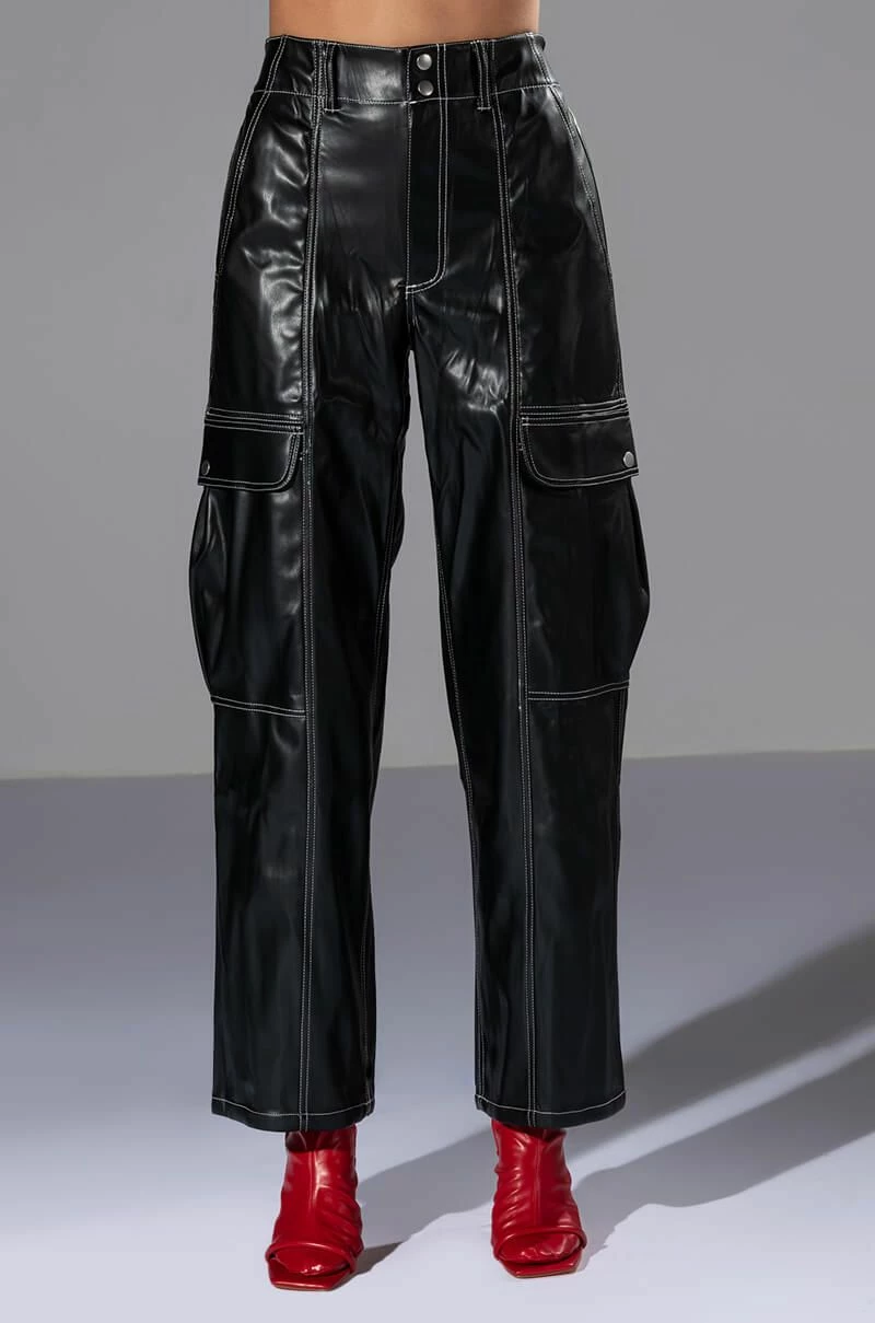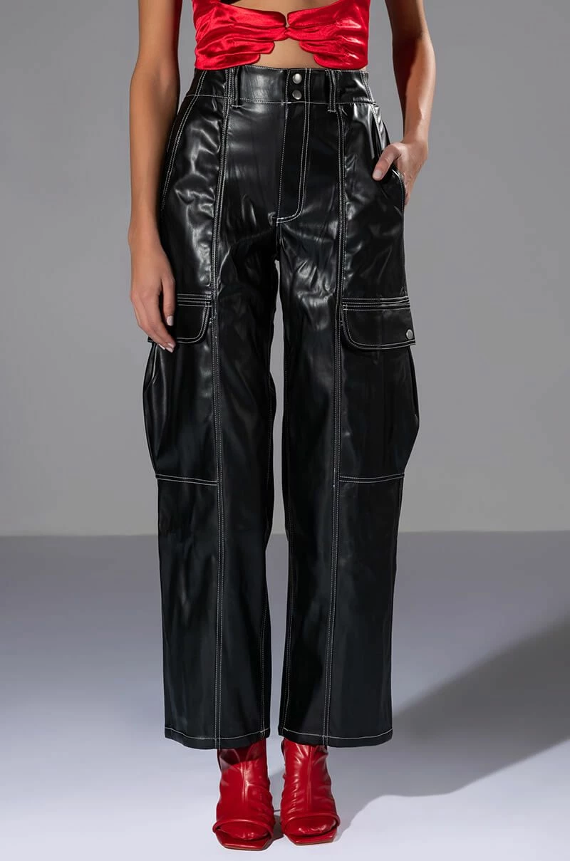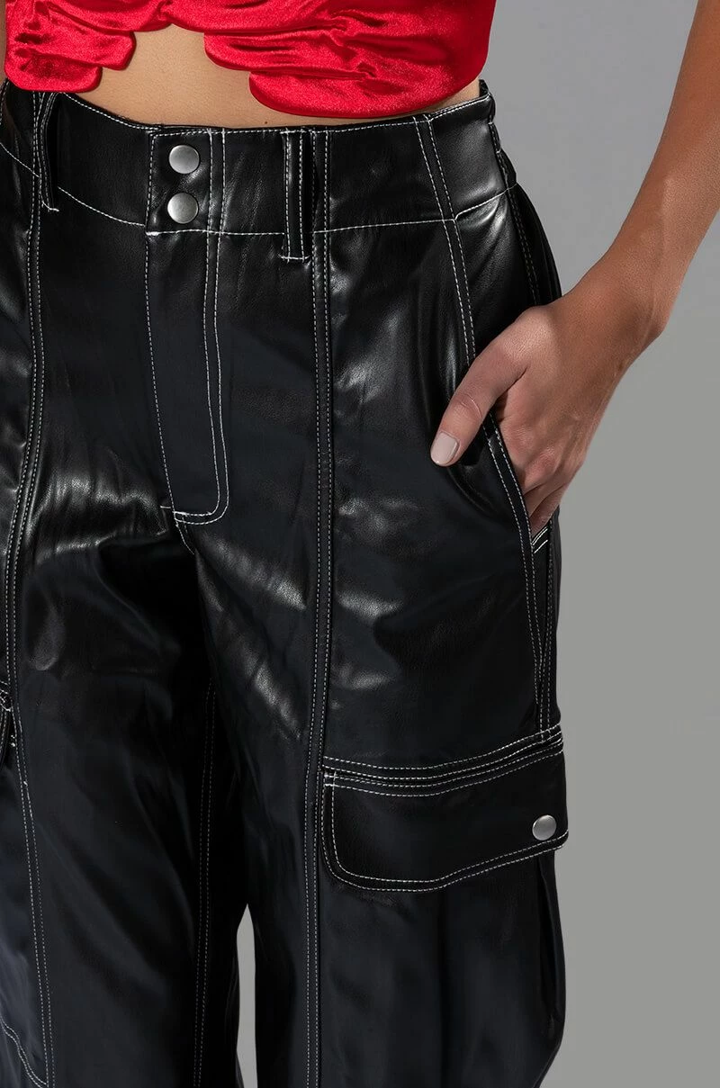 Arrive late but best dressed in The AKIRA Label Fashionably Late Faux Leather Relaxed Fit Pant! These fierce bottoms feature a faux leather fabrication, contrast stitch detailing, a high rise waist, working belt loops, a four-pocket design, large button flap cargo side pockets, and a wide leg silhouette. Complete with a button and zipper front closure. Pair this piece with a baby tee and chunky sneakers to finish off your fresh look.