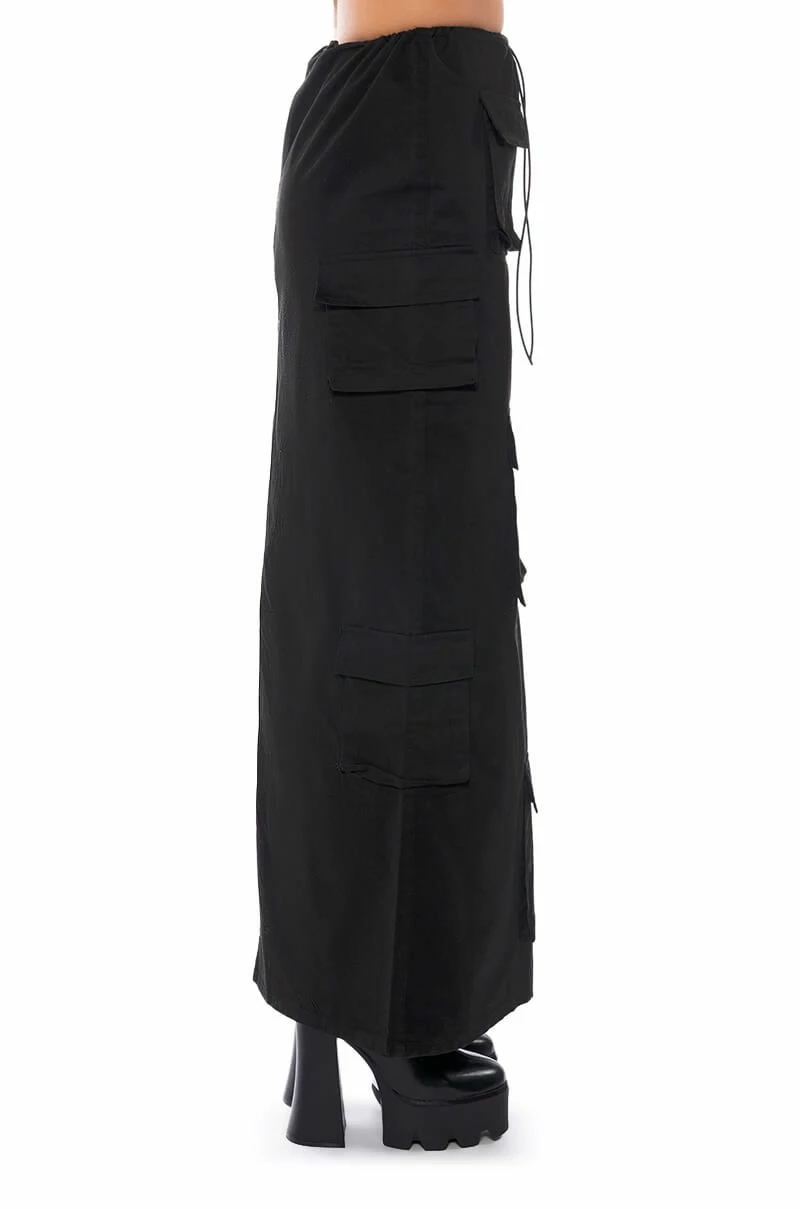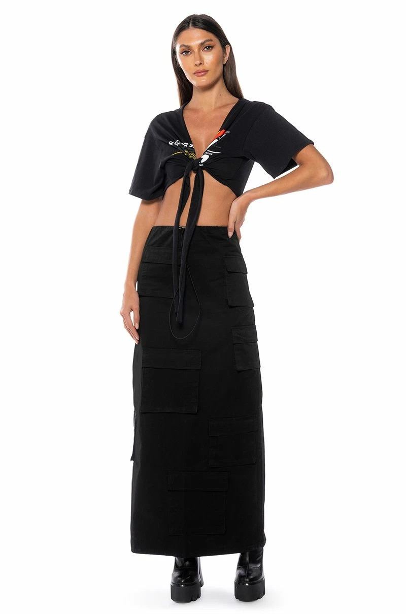 She’s the cargo skirt of our dreams, The AKIRA Label Field Of Dreams Cargo Maxi Skirt in Black is made from a smooth, canvas fabrication, and features a drawstring waistband and an allover cargo flap pockets design. Complete with a high waisted silhouette and a back slit at the bottom hem. Pair these pants with a mesh bodysuit and chunky combat boots for a completed hot girl look!