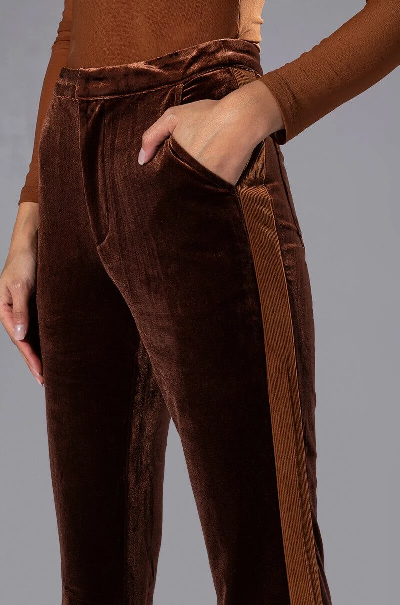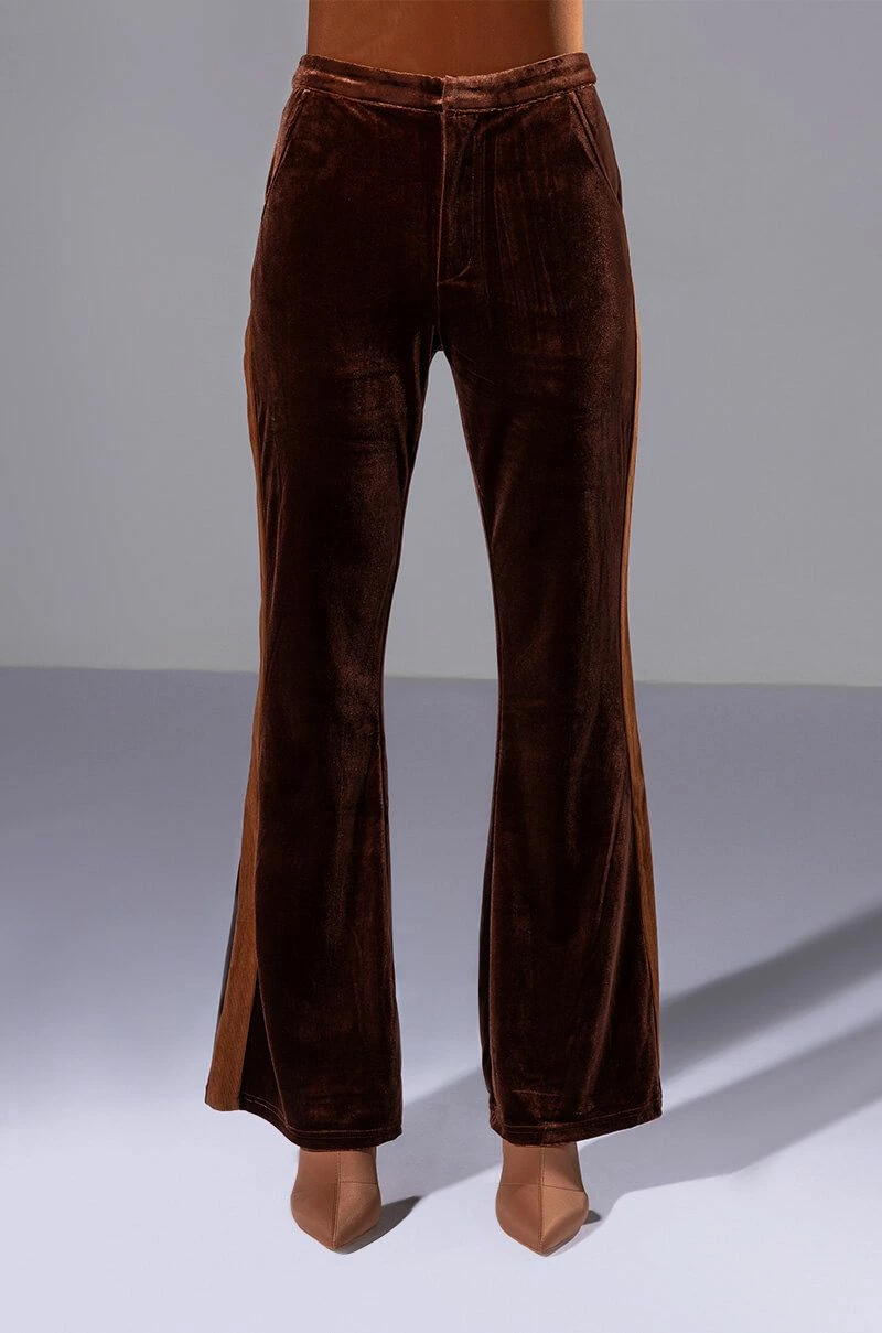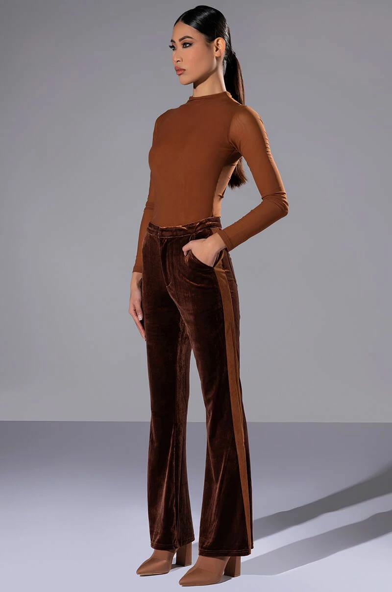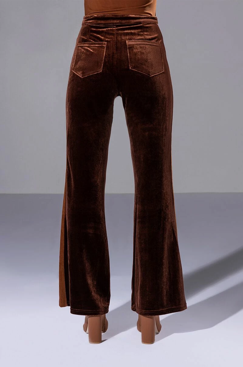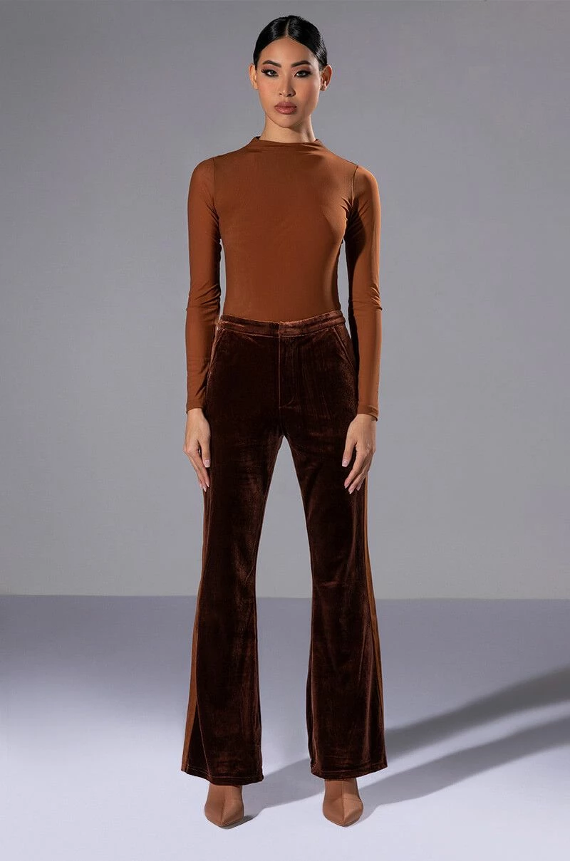 Weβre giving 70βs chic with The AKIRA Label Gabrielle Velvet Flare Trouser! These high-waisted bottoms are made from a velvet fabrication and feature slant side pockets, working back pockets, and a flared leg silhouette. Complete with a tonal corduroy stripe along the sides and a zipper to hook-and-eye front closure. Pair these pants with a cropped tee, moto jacket, and heeled boots for the full fantasy!