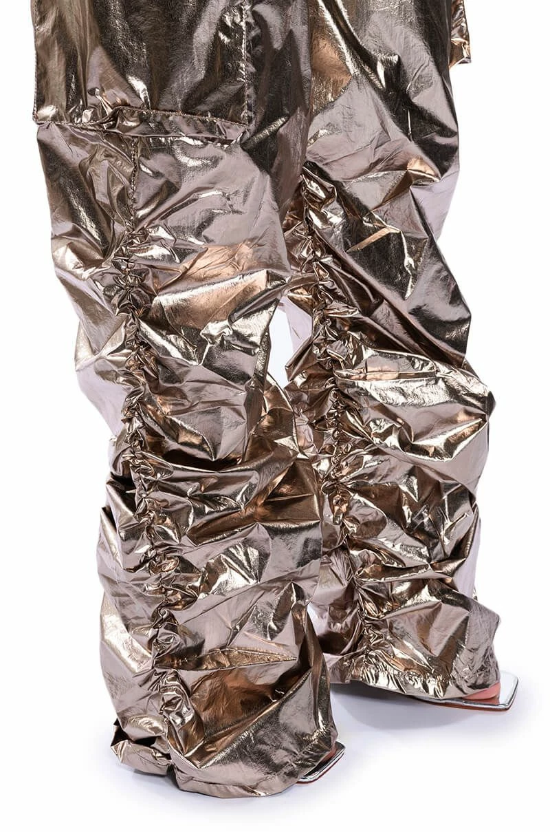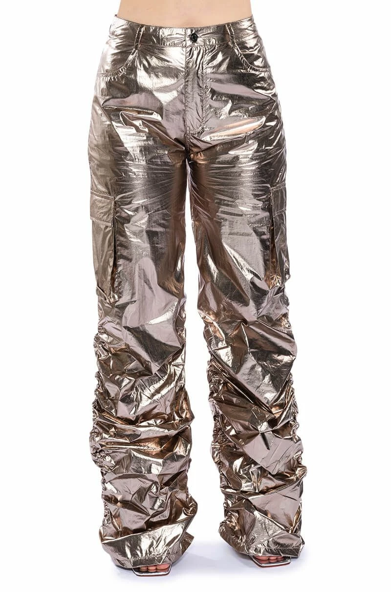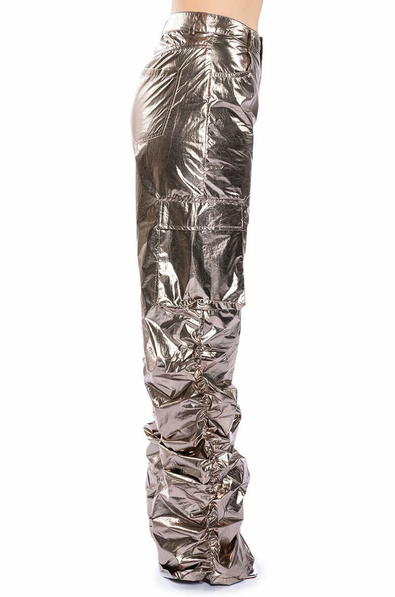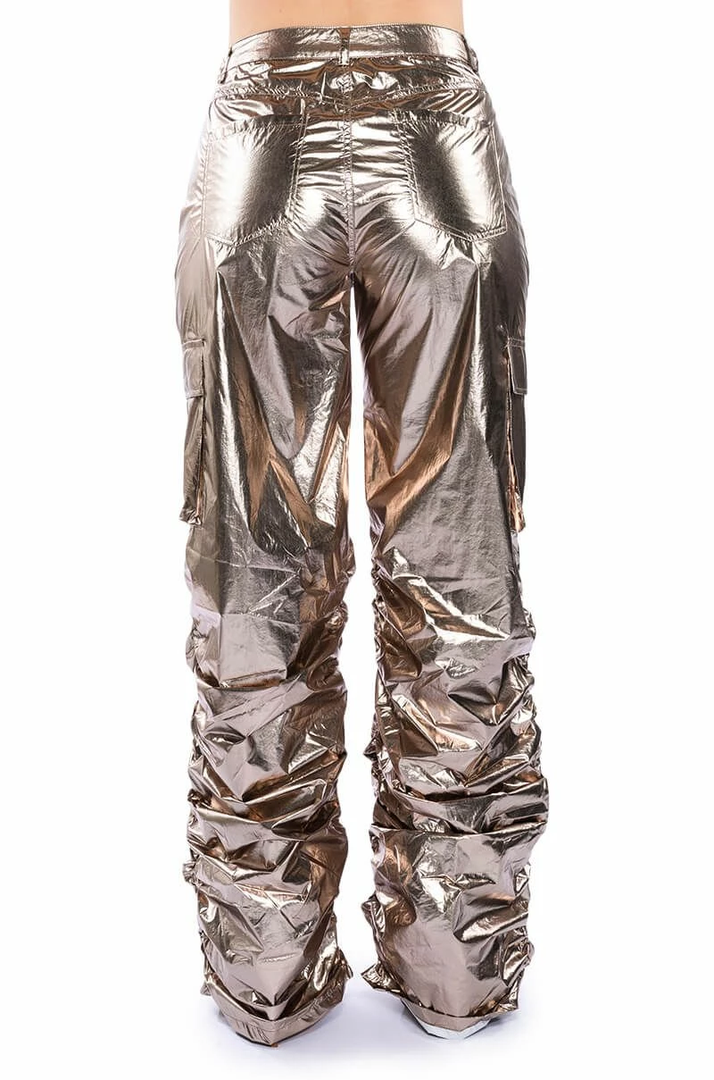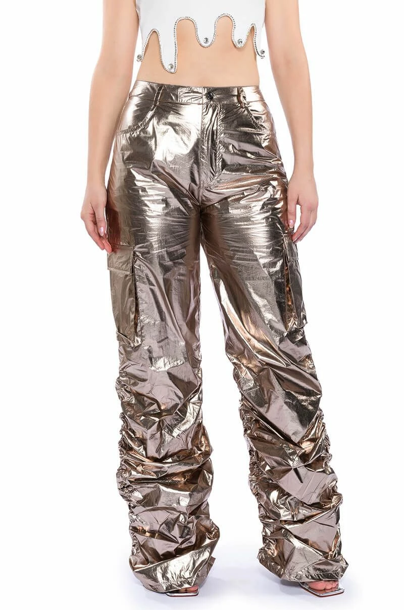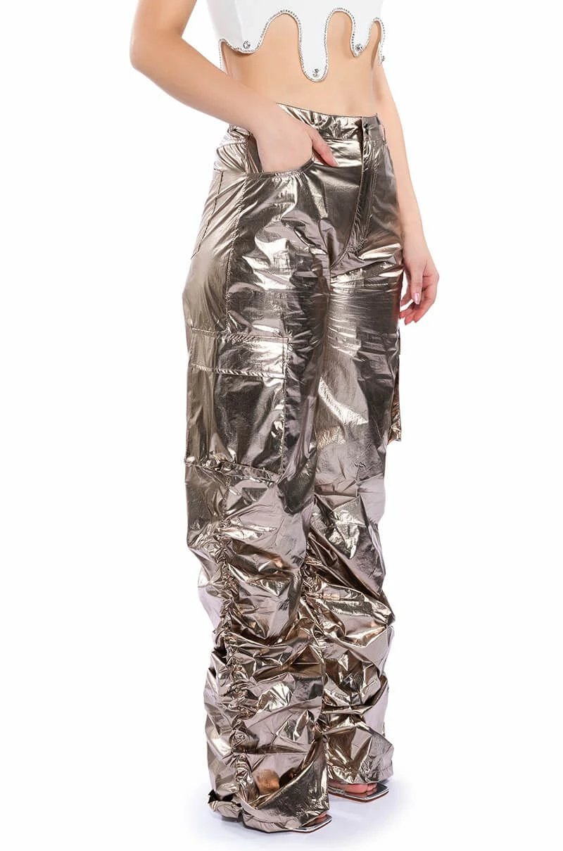 Trendy and sexy, The AKIRA Label Glimpse of Magic Relaxed Metallic Pant is a lightweight fabricated, metallic bottom featuring a high waist rise, a zipper fly button fasten, belt loops, cargo flap side pockets, working back pockets, and a straight leg fit. Complete with ruched side detailing. Pair with your favorite bodysuit and strappy stilettos to complete the look.