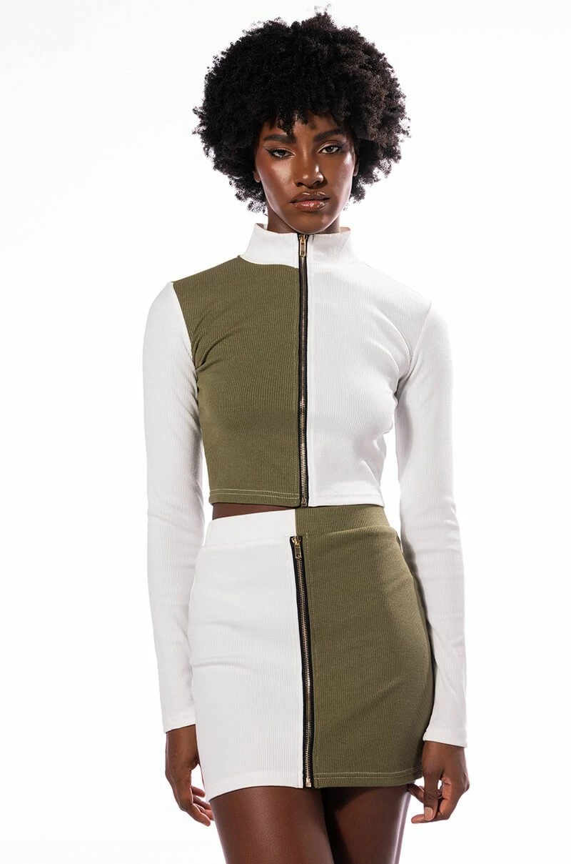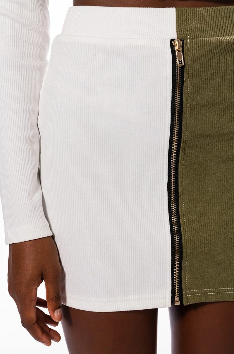 Sweet as cream, The AKIRA Label Half N Half Zipper Skirt is made from a soft ribbed knit fabrication and features a high rise waist with an elastic waistband, a sexy bodycon fit, mini length, a pull-on silhouette, and a front zipper detail. Pair this piece with the coordinating AKIRA Label Half N Half Zipper Top and booties to complete your look.