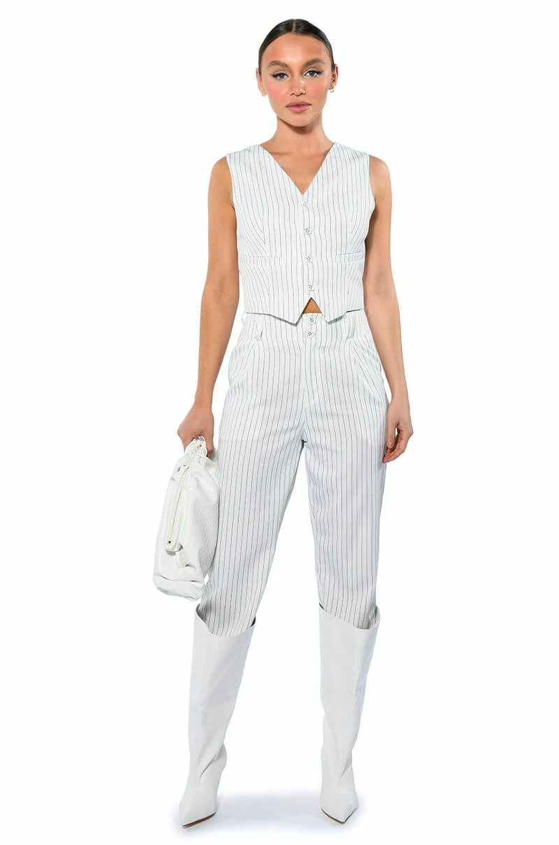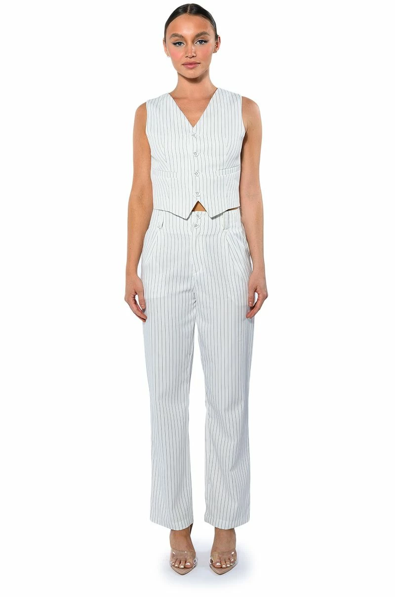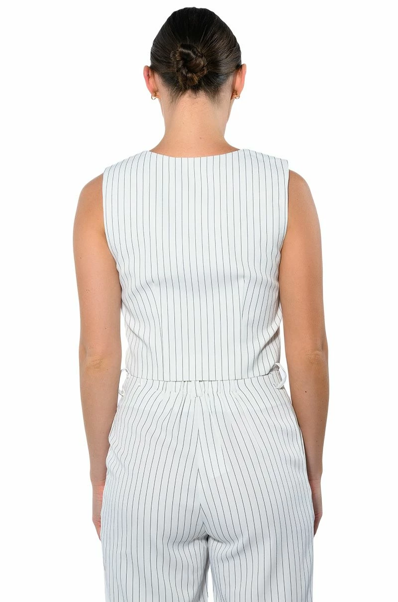 The AKIRA Label Hamburg Street Style Vest is made from a soft woven fabrication and features pinstripe patterning, a V neckline, a sleeveless silhouette, princess seam detailing, mock jetted pockets, light polyester lining, and front button closures. Pair this piece with the matching AKIRA Label Hamburg Street Style Trouser to complete your look.