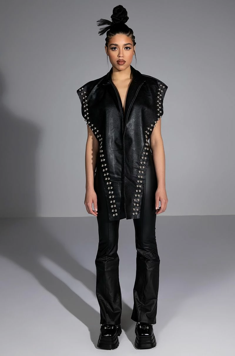 The AKIRA Label I Think Youre Cute Faux Leather Lace Up Flare Pant are a vegan leather-based flare pant featuring a high waist rise, grommet lace up front detailing, flattering front seam detailing, and a tonal back zipper closure. Pair with your favorite lace bodysuit and an oversized denim jacket to complete the look.
