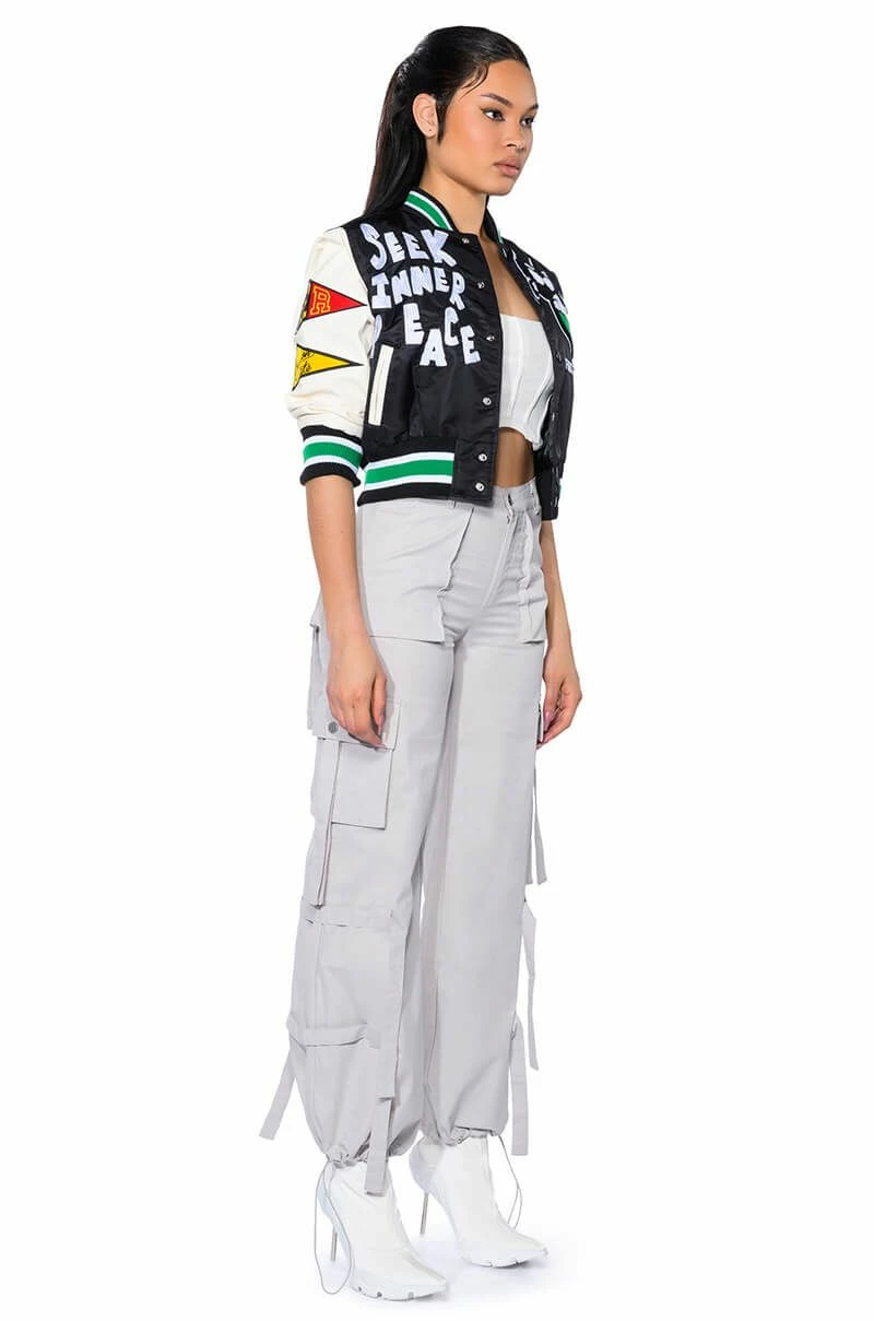 The AKIRA Label It Is Back Cargo Pants are made from a structured cotton fabrication and feature a high rise waist, working belt loops, front patch pockets, tasseled snap button cargo pockets, tie belt detailing, a wide leg silhouette, and toggle drawstring hems. Complete with a button and zipper front closure.