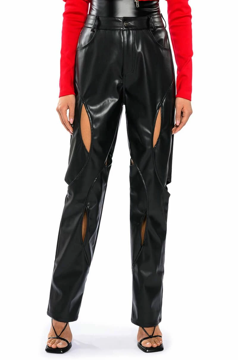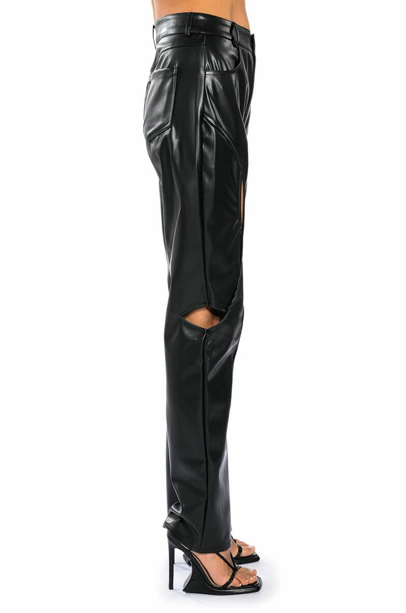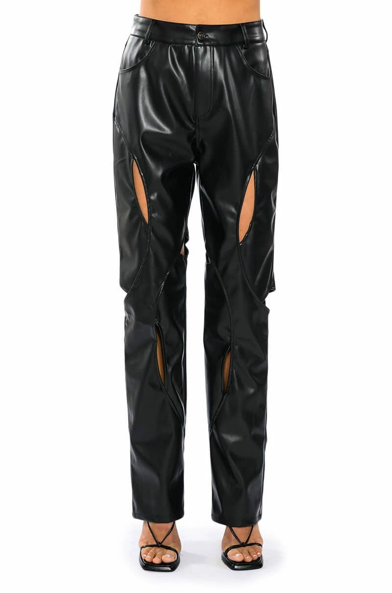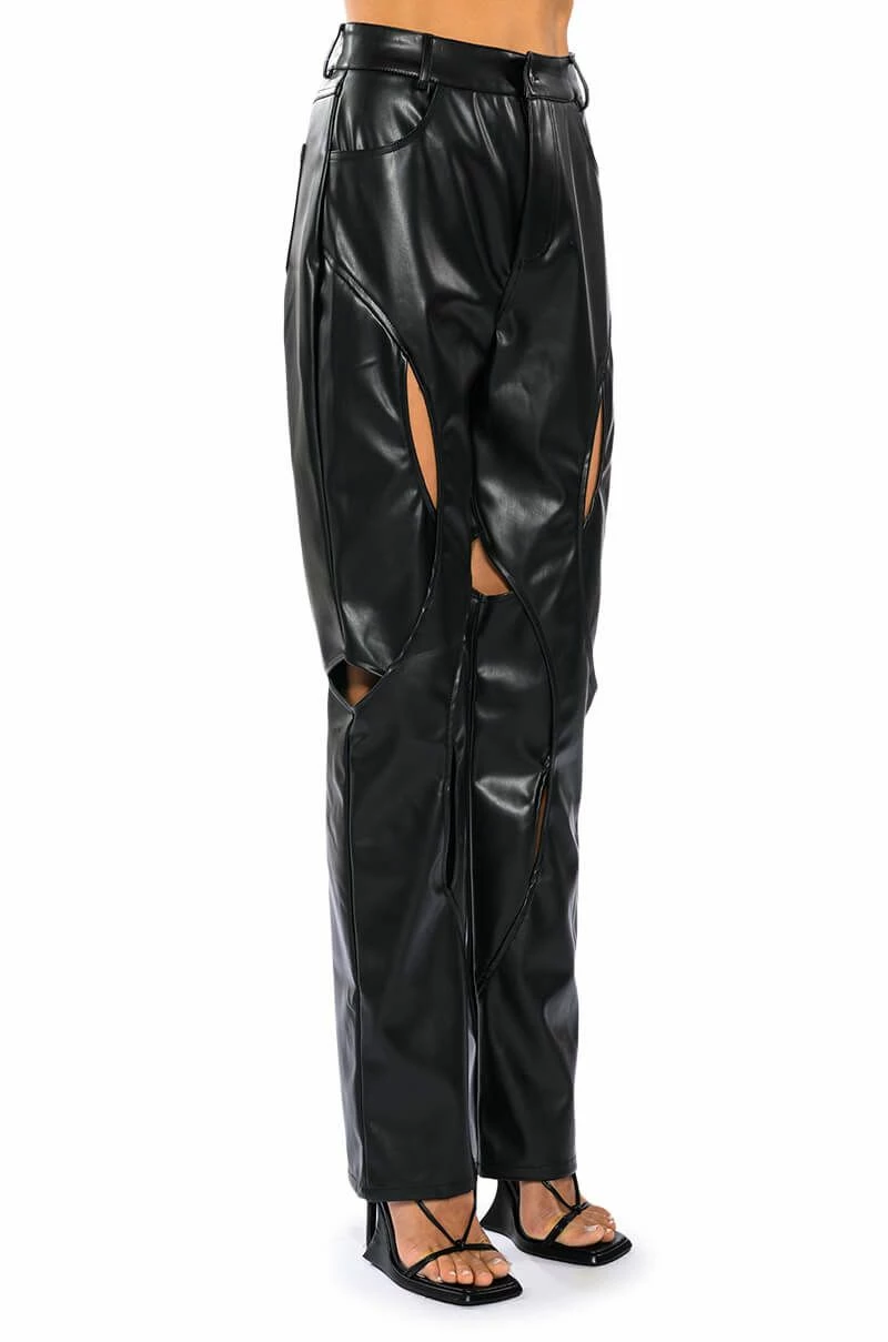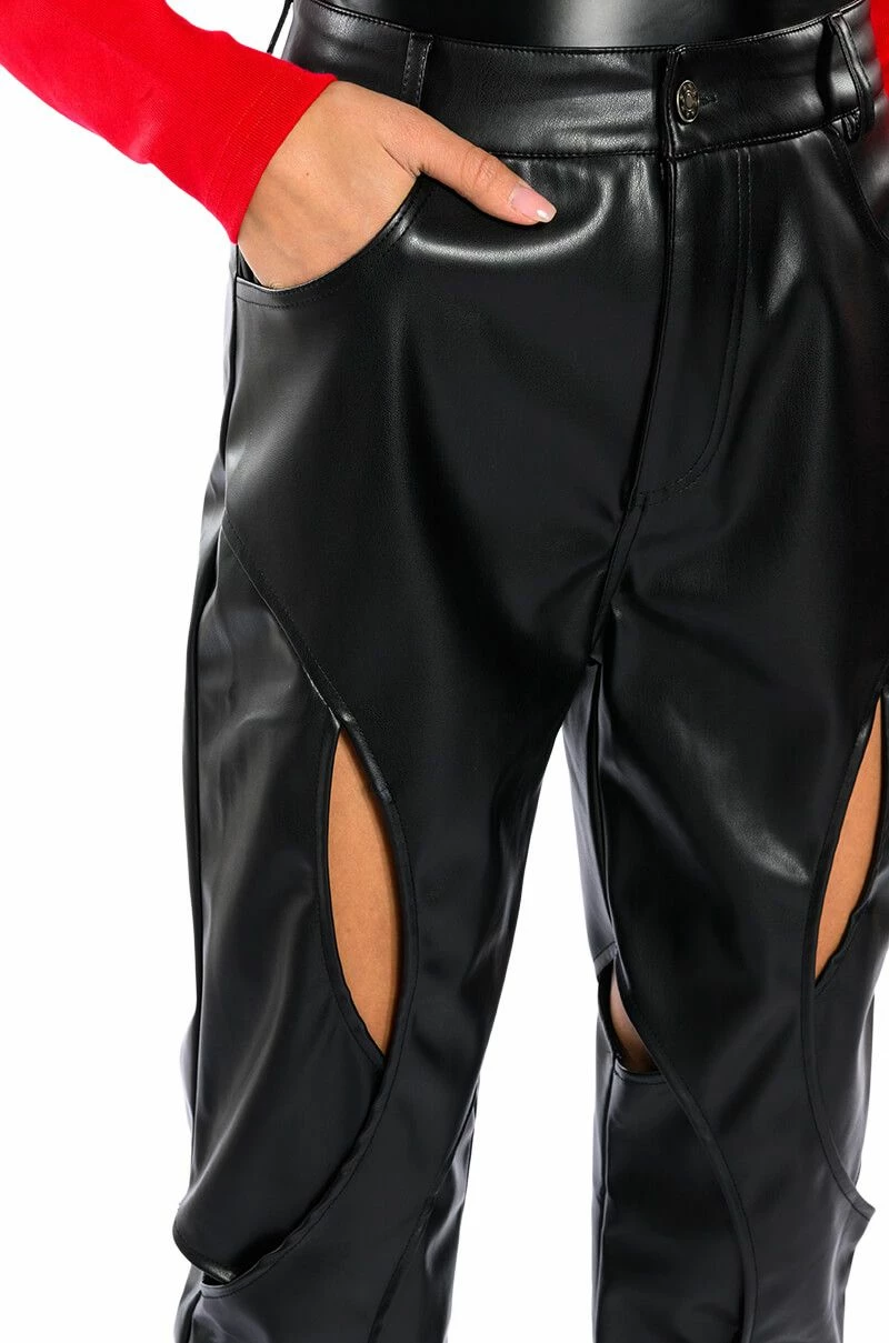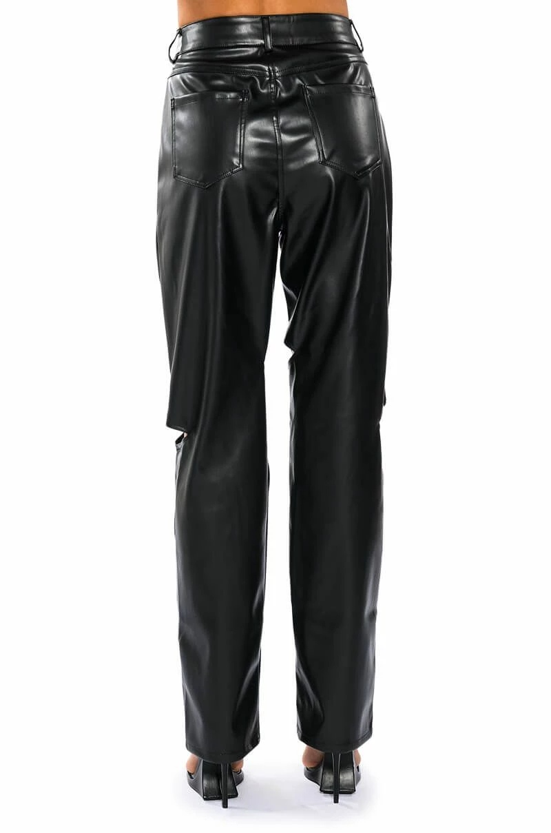 The AKIRA Label Jump Around Relaxed Cutout Faux Leather Pant is a unique high-waisted pant featuring a faux leather fabrication, working belt loops, functional back pockets, and a straight leg silhouette. Complete with a classic zip button closure, cross front seams, vented knee slits, and dual vertical cut outs at the front thighs. Pair these pants with a long sleeved bodysuit and heeled booties for an effortless edge to your look!