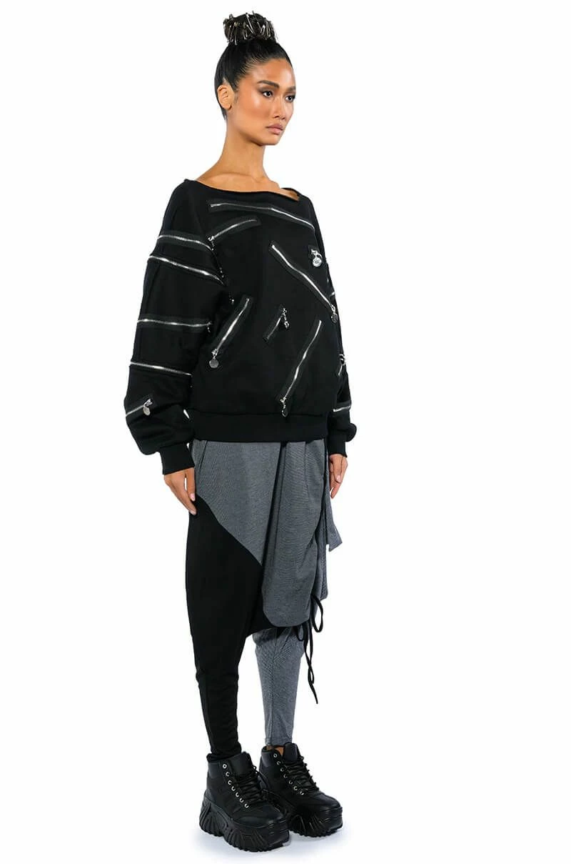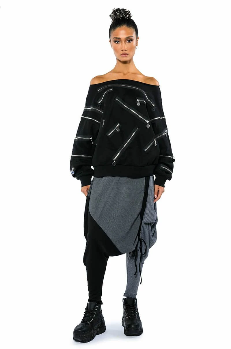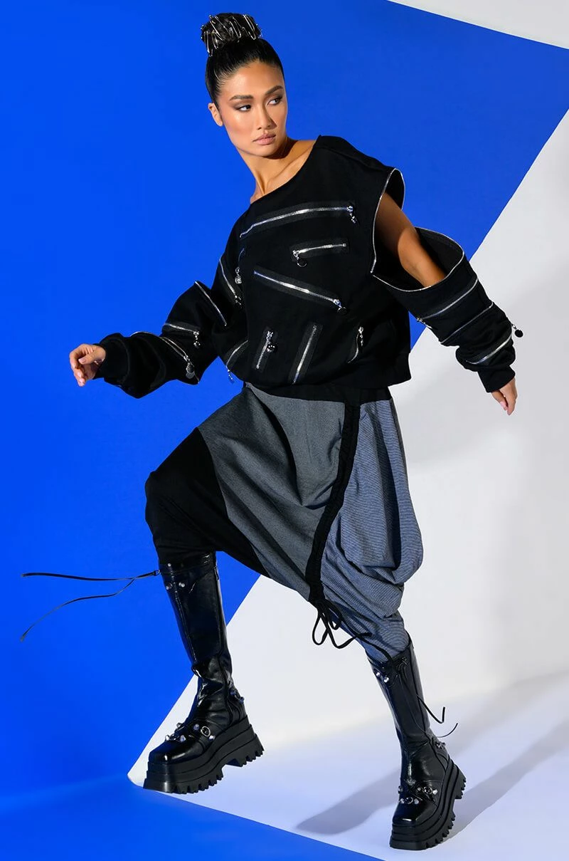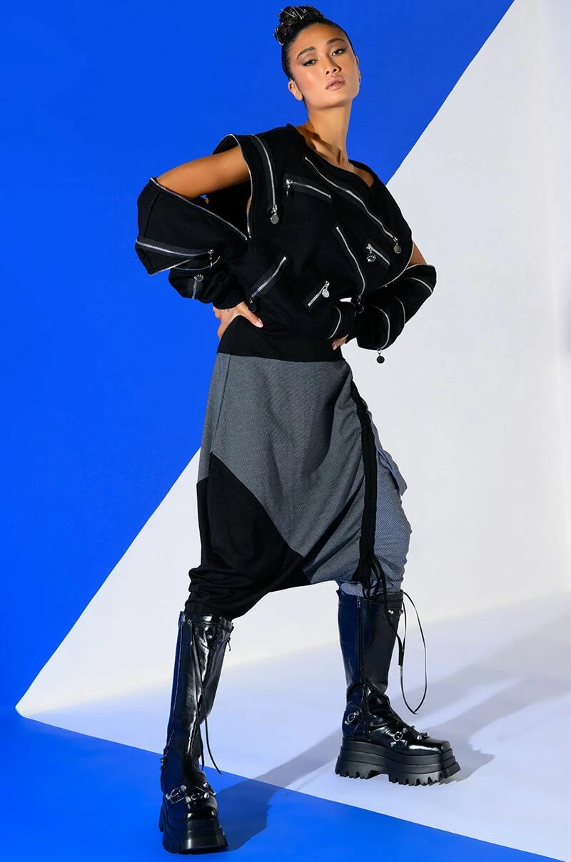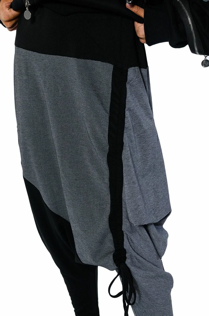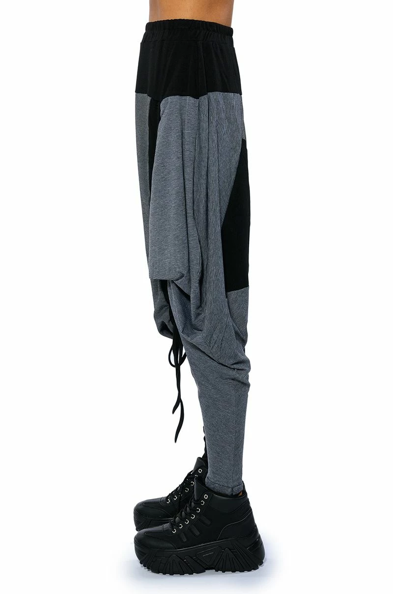 The AKIRA Label Next Lifetime Cinched Asymmetrical Drop Waist Joggers are a cozy cotton blend pant featuring a drop crotch design, a ruched elastic waistband, voluminous hip detailing, a tapered leg silhouette, and colorblock stripe print patterning. Complete with an adjustable, asymmetrical ruched side accent with drawstring closure. Pair with a cozy hoodie and flatform sneakers..