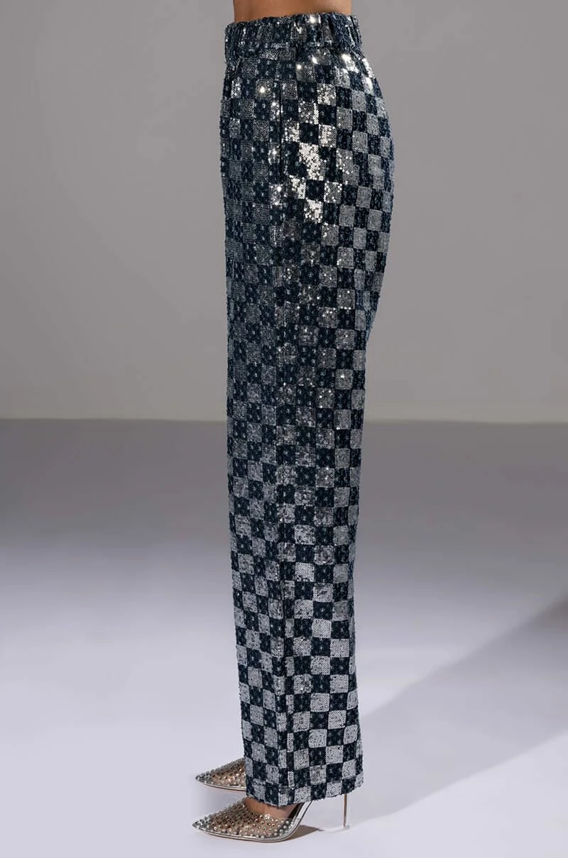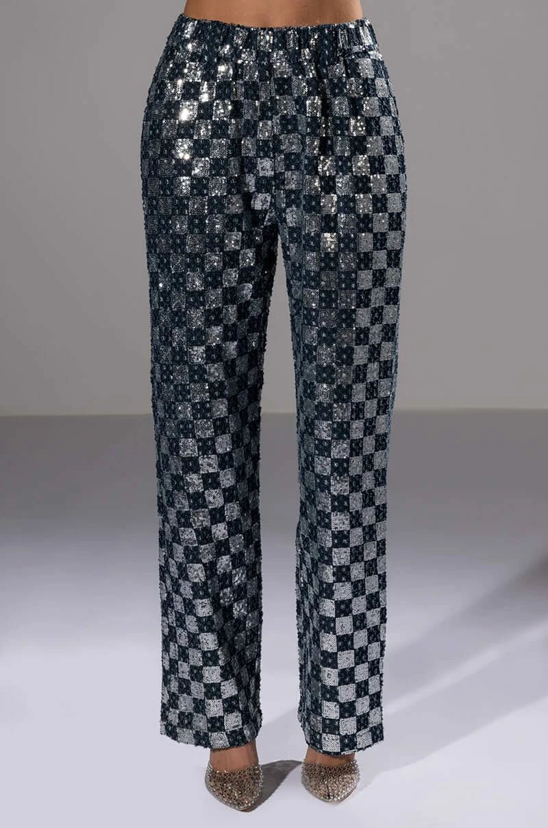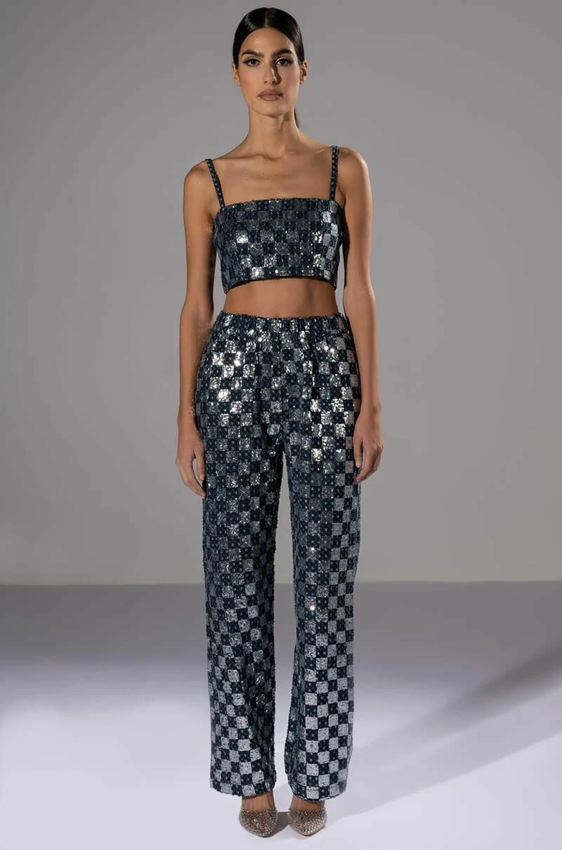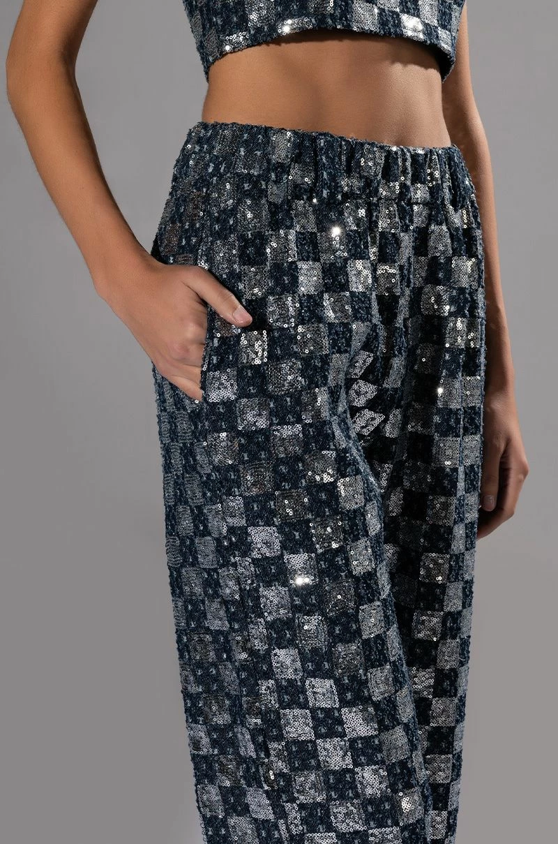Speaking of glam, The AKIRA Label Leah Wide Leg Trouser is ready to steal the show! These high waisted pants are made with a denim base fabrication, featuring an allover square patchwork sequin design and an elastic band waist. Complete with a wide leg fit, side pockets and a back zipper closure. Pair with coordinating The AKIRA Label Leah Bandeau Crop Top, Leah Oversized Button Down Blouse, and heels to complete this effortlessly flawless look!