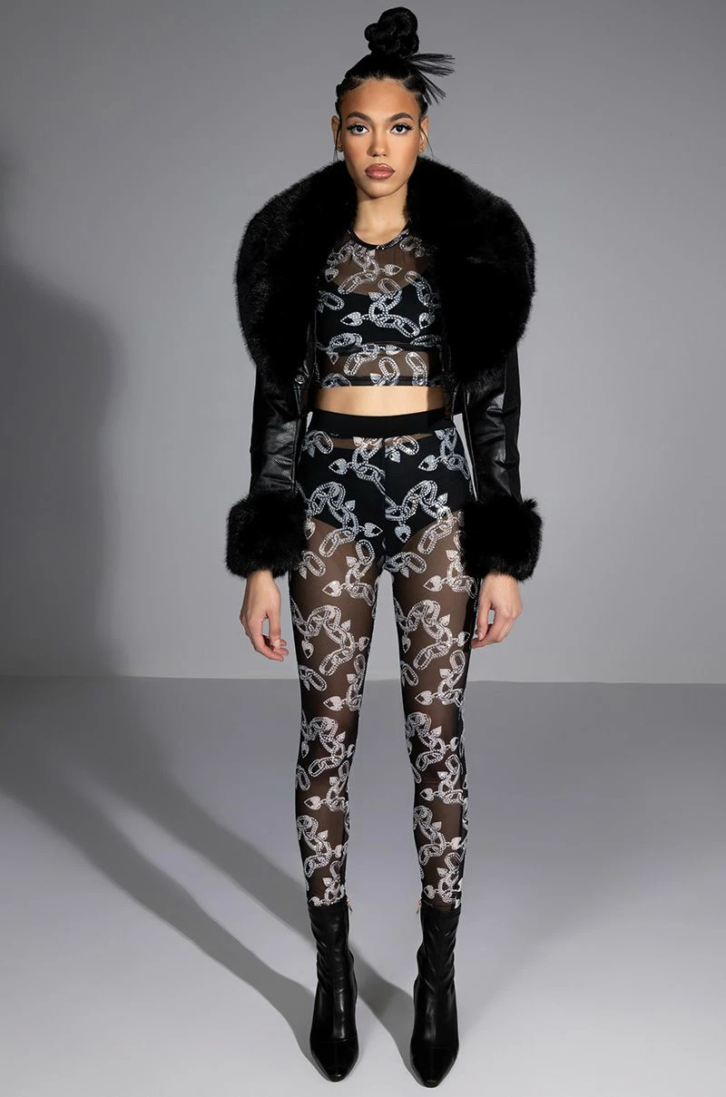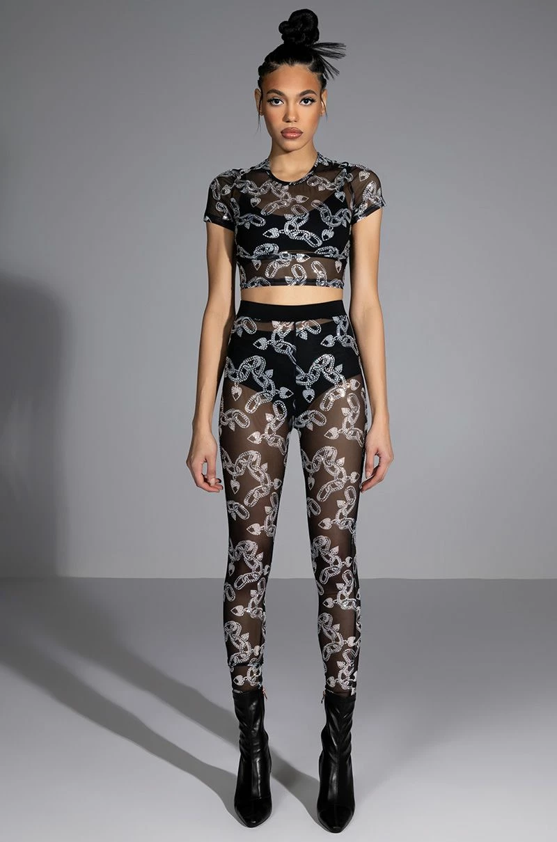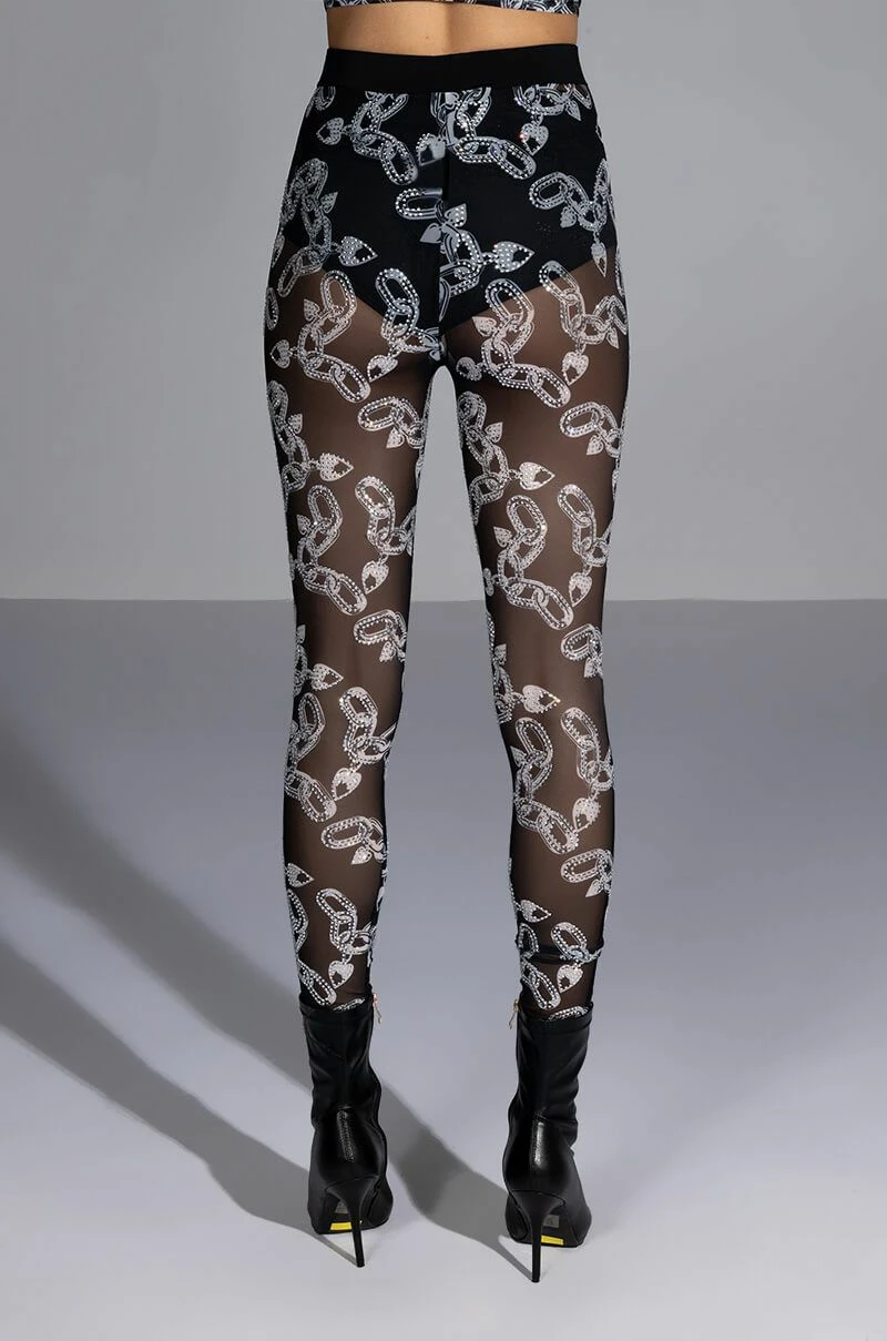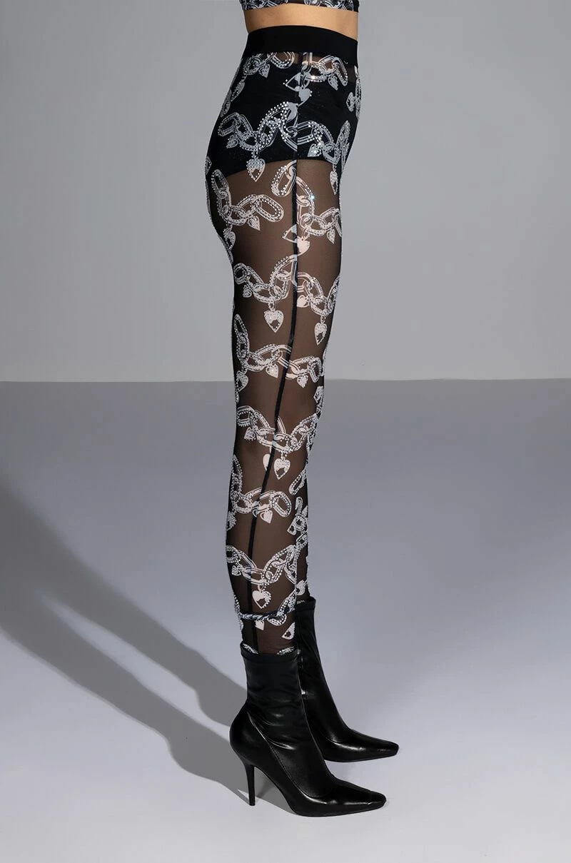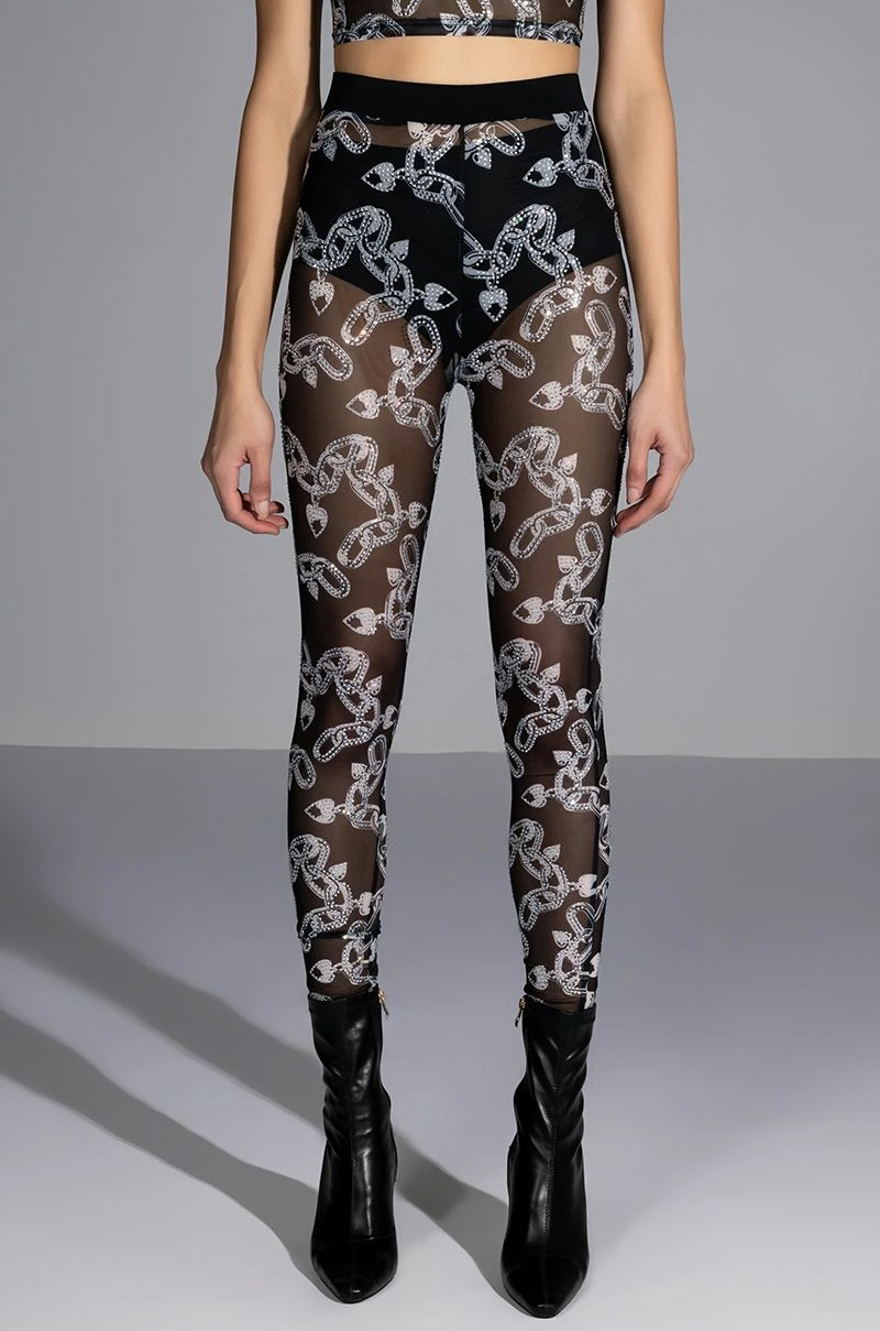 The AKIRA Label Love On Lockdown Mesh Legging is made from a sheer mesh fabrication and features a rhinestone-detailed love lock and chains print, a high rise waist with elastic waistband, and a skinny leg fit. Style this piece with the matching AKIRA Label Love On Lockdown Mesh Top to complete your blinged-out graphic look.