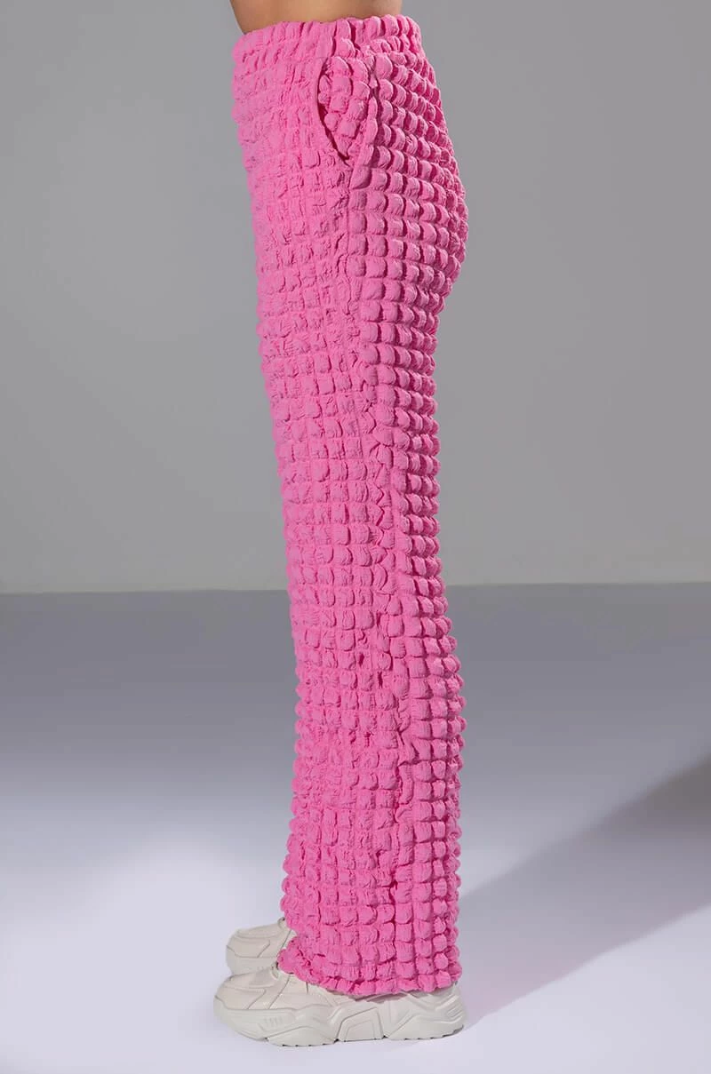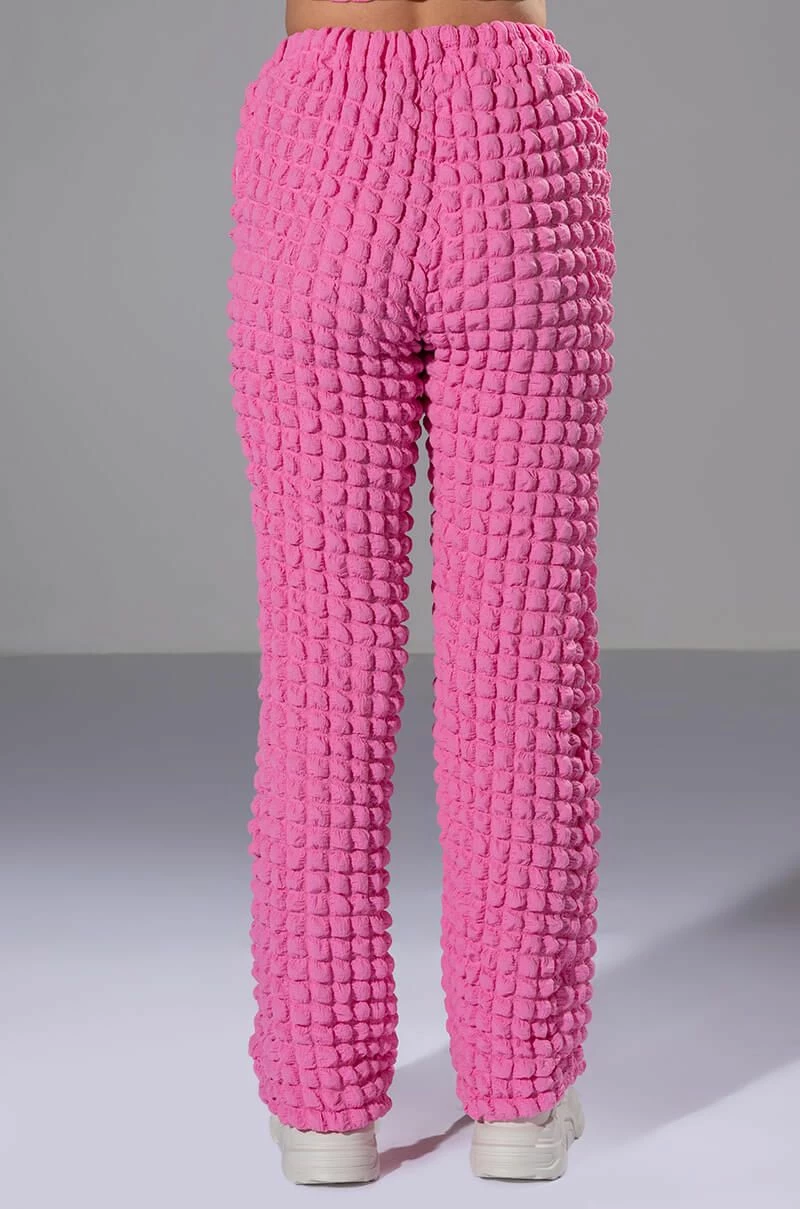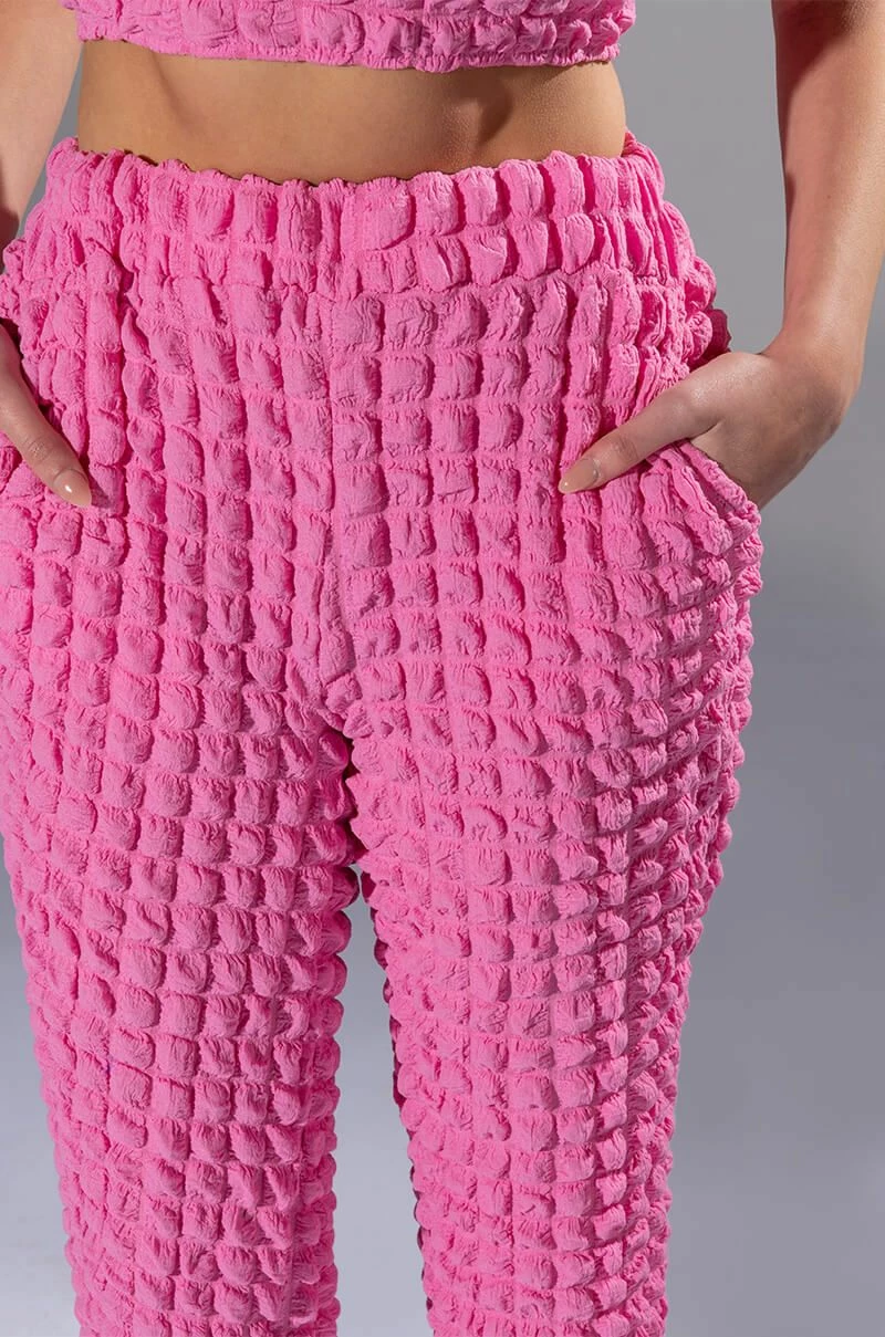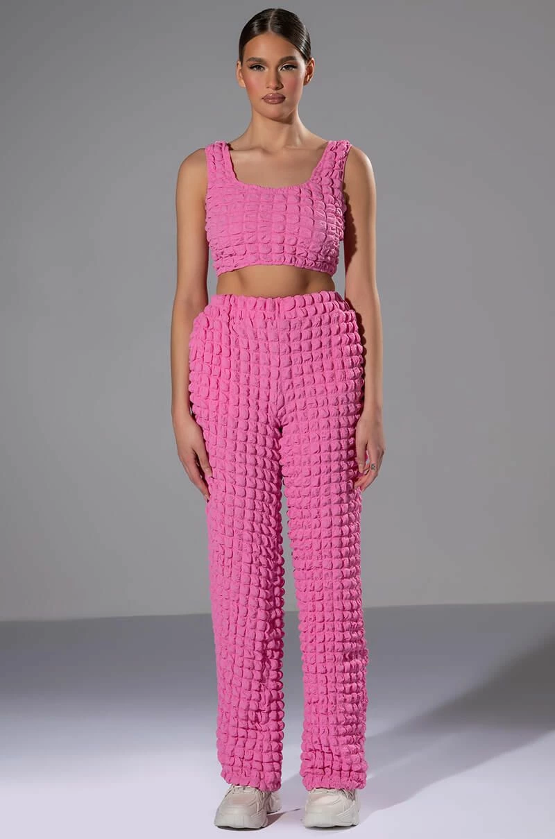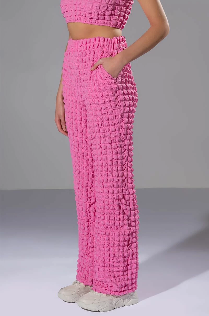 The AKIRA Label Lucy Textured Wide Leg Pant is made from a stretchy popcorn fabrication and features a high rise waist, a wide elastic waistband, slant side pockets, a wide leg silhouette, and a pull-on fit. Pair this piece with the matching AKIRA Label Lucy Textured Button Down Blouse and Lucy Textured Crop Tank Top to complete your look.