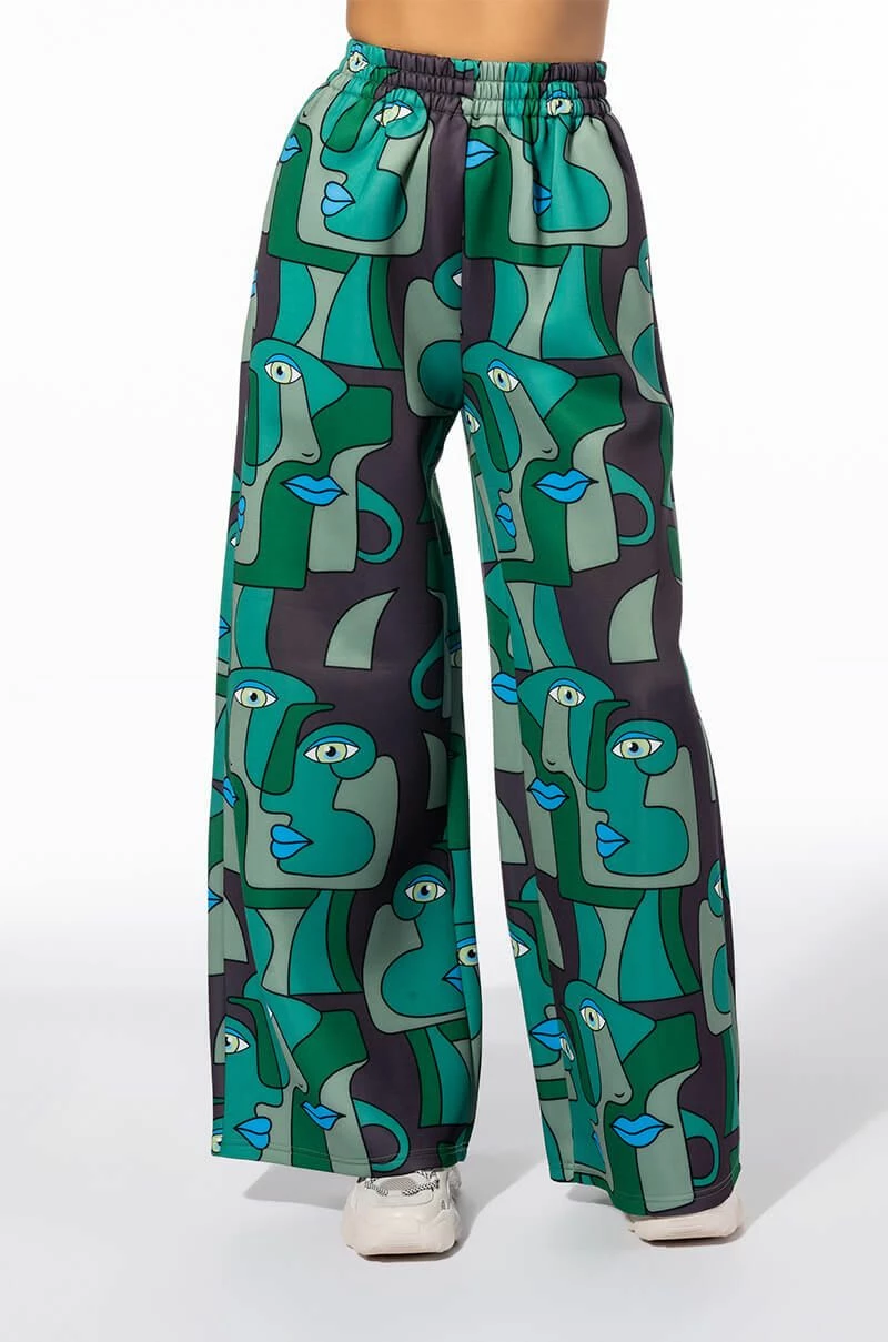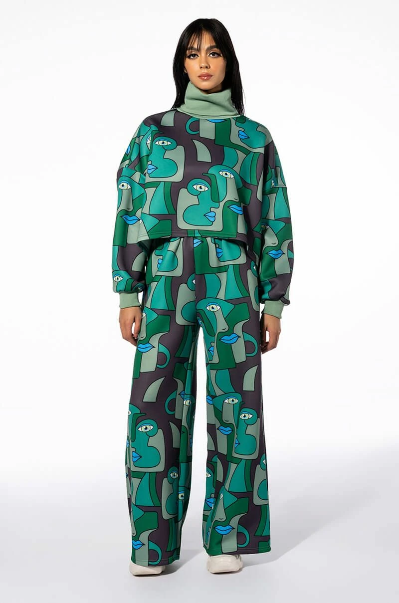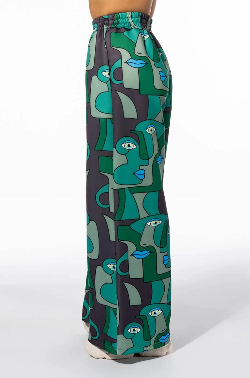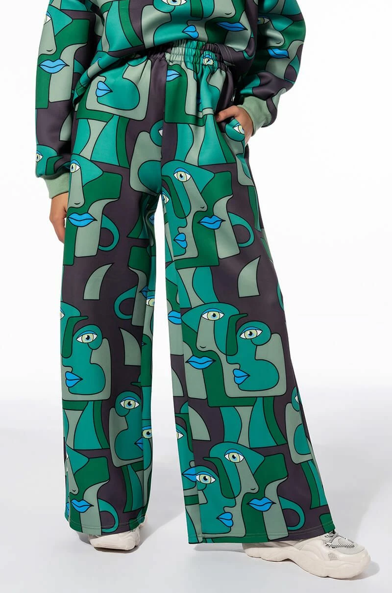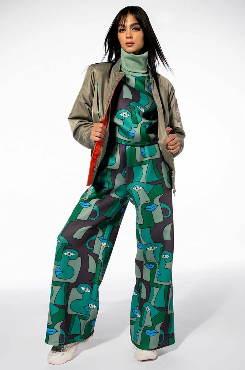 Enchant onlookers with The AKIRA Label Medusa Wide Leg Scuba Sweatpants. This graphic piece is made from a slick scuba knit fabrication and features an artsy print of abstract shapes and faces, a high rise waist with a ruched elastic waistband, slant side pockets, and a wide leg silhouette. Pair this piece with the coordinating AKIRA Label Medusa Turtleneck Scuba Sweatshirt to complete your look.