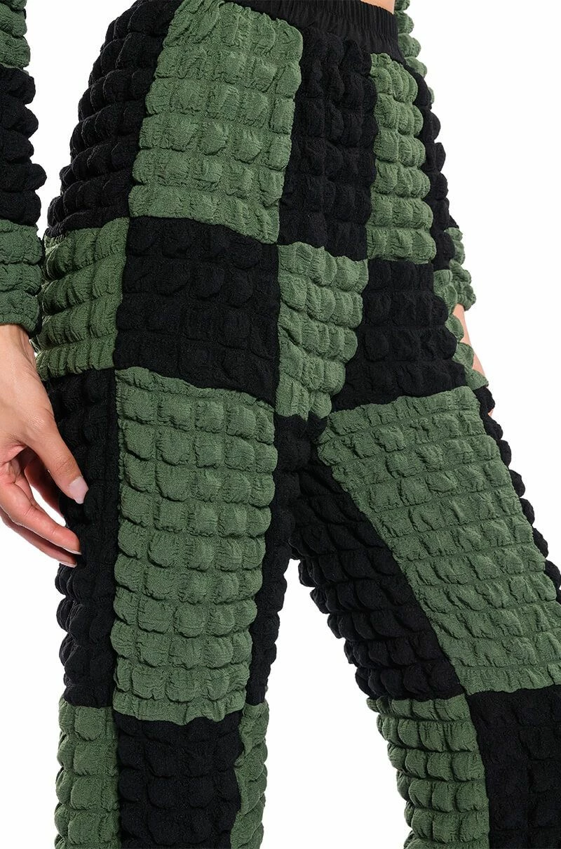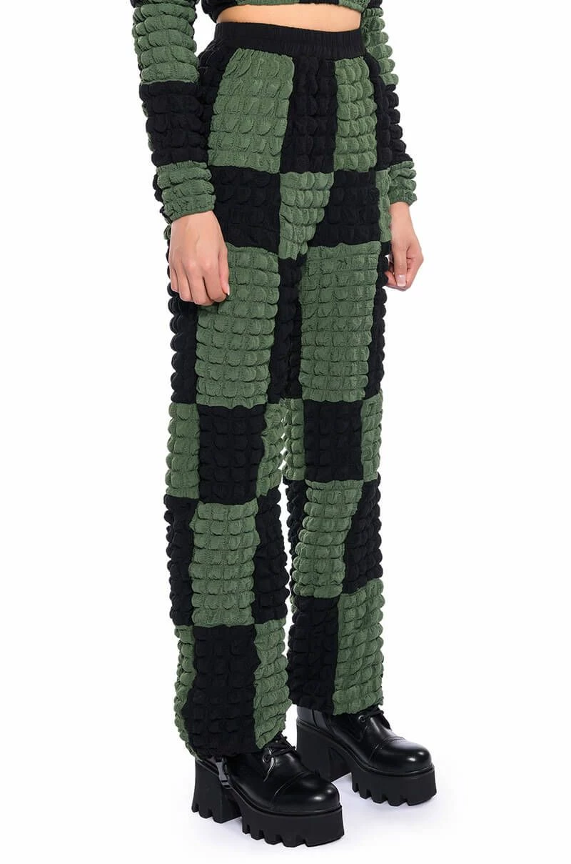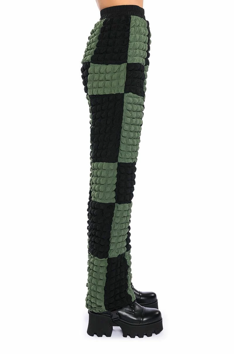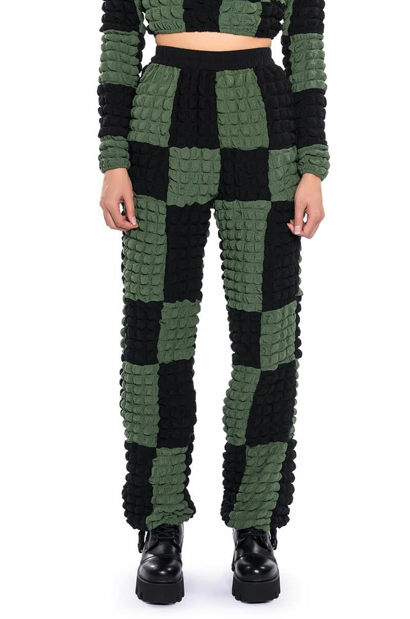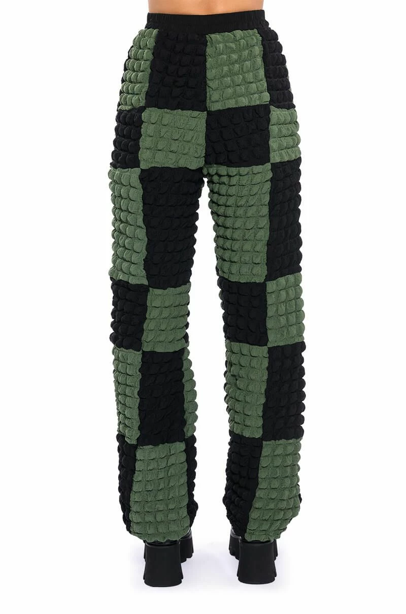The AKIRA Label Meet You In San Francisco Colorblock Puff Wide Leg Pant is made from a stretchy popcorn fabrication and features colorblock checker patterning, a high rise waist, a wide elastic waistband, a wide leg silhouette, and a pull-on fit. Sizes S-XL: Pair this piece with the matching AKIRA Label Meet You In San Francisco Colorblock Puff Crop Top and booties to complete your look.