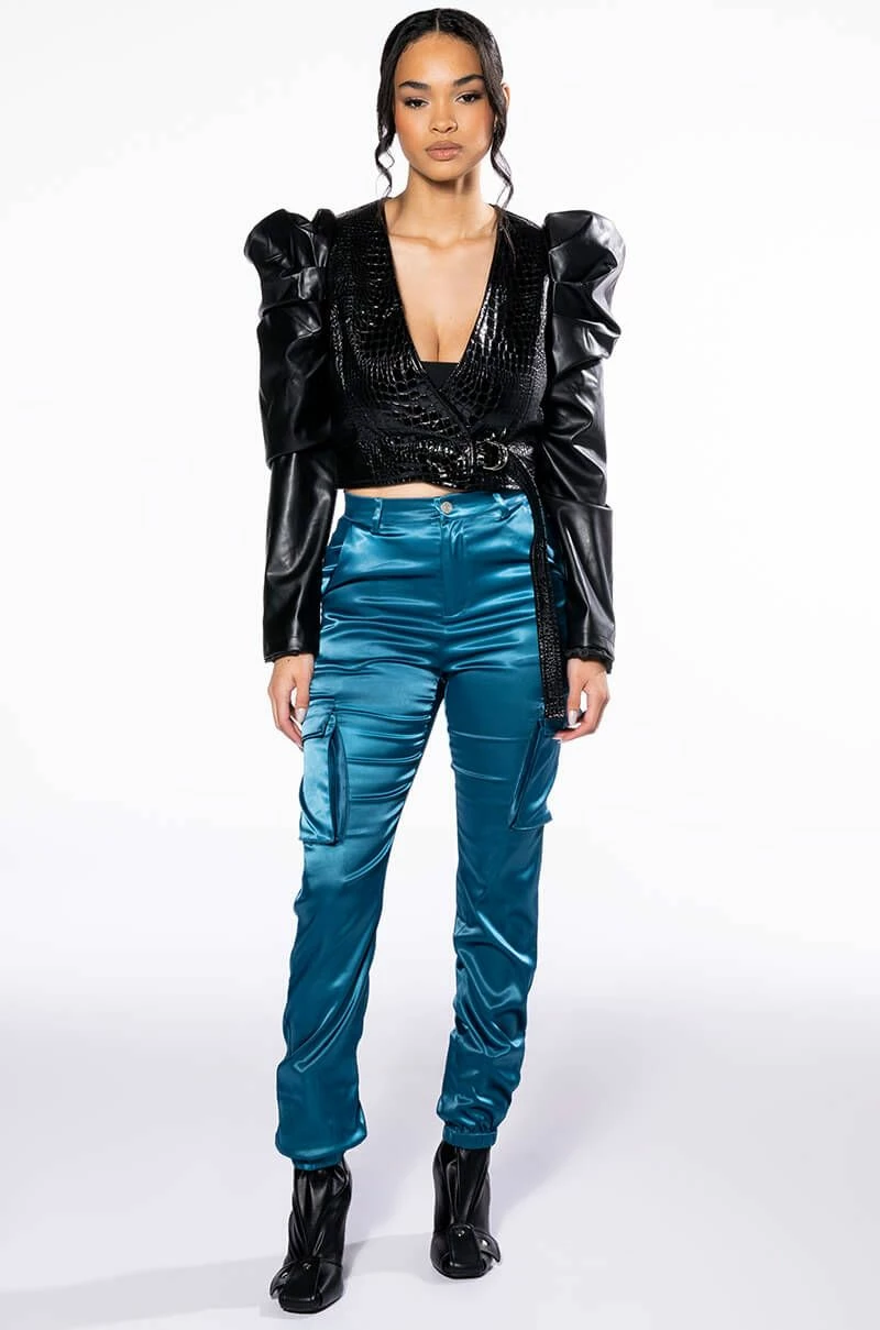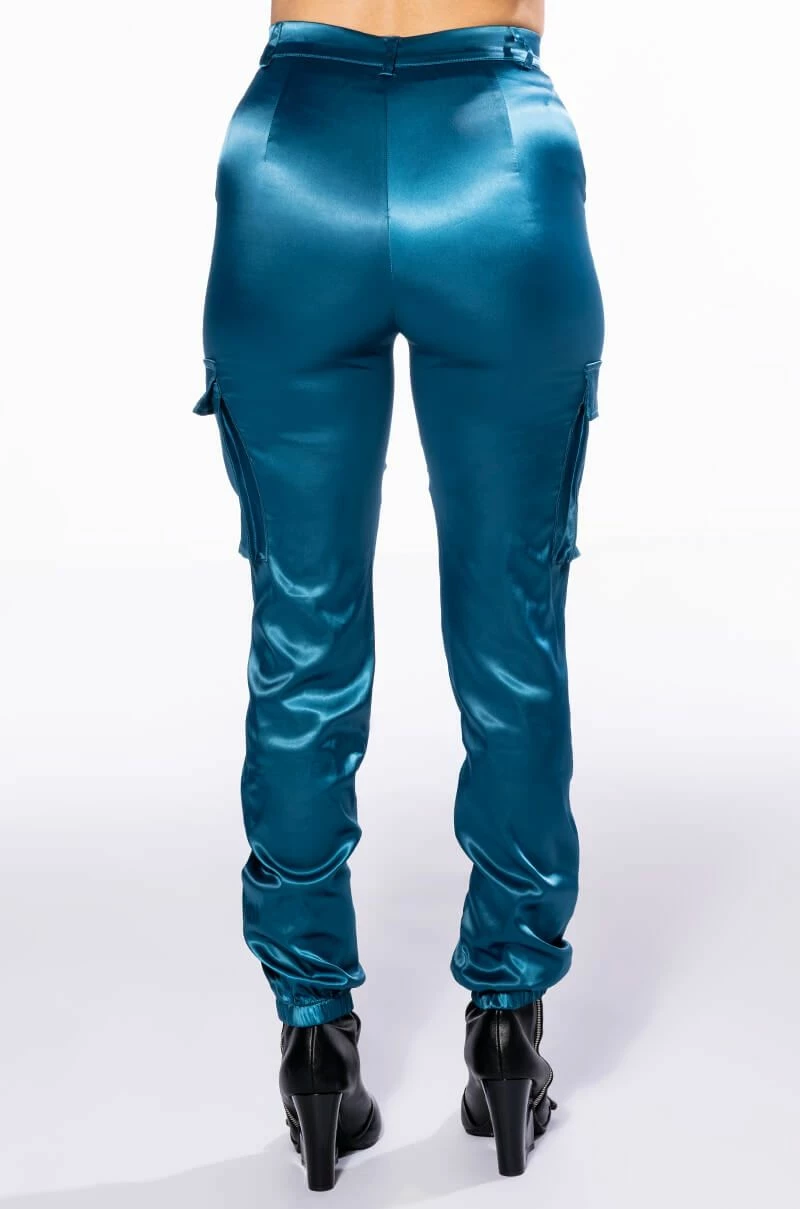 The AKIRA Label Mission Impossible Satin Cargo Jogger is a sleek and chic pant complete with a mid waist rise, zipper fly button fasten, cargo inspired side pockets, a subtle metallic sheen and cinched ankle hems.