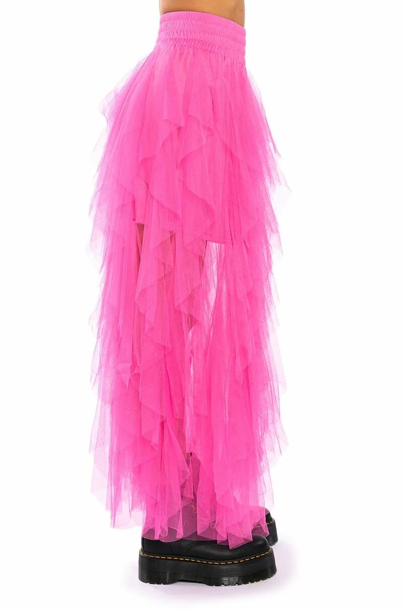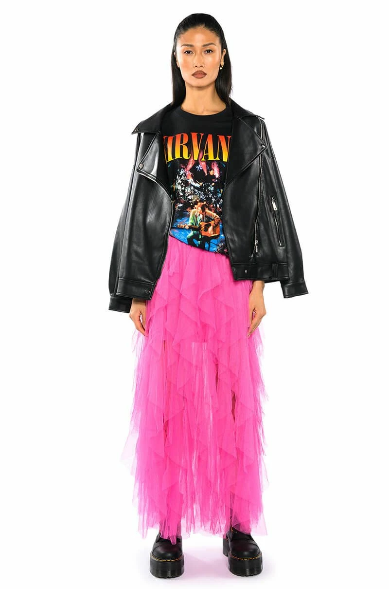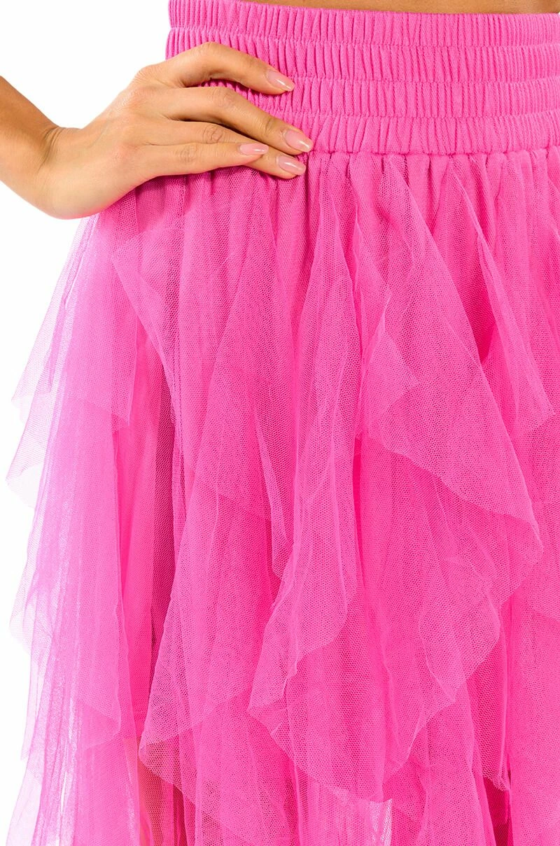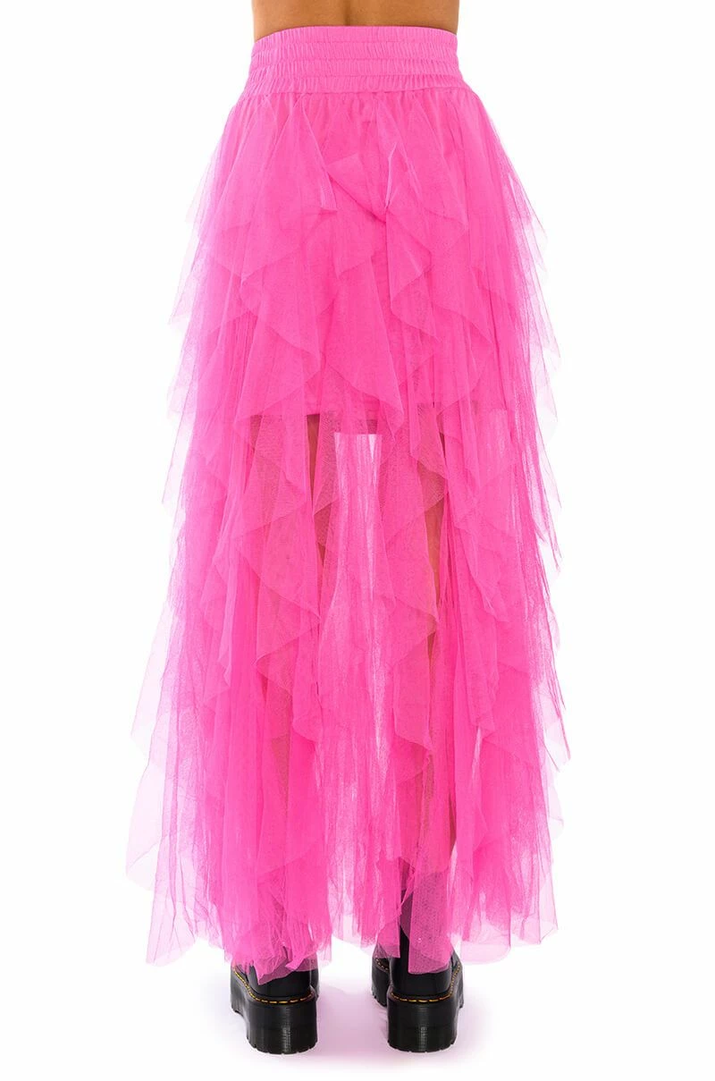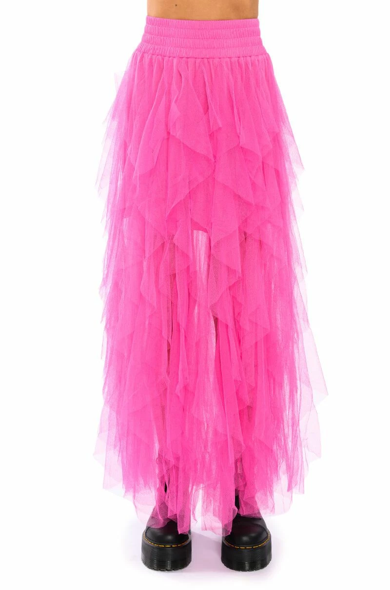 The AKIRA Label Modern Royalty Layered Mesh Maxi Skirt is made from a mesh fabrication and features a high rise waist, a wide, shirred elastic waistband, dramatic layered mesh overlay, short lining, a maxi-length hem, and a pull-on silhouette. Pair with a bodysuit and strappy heels for a finished look.