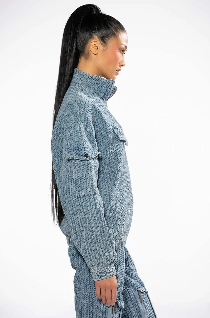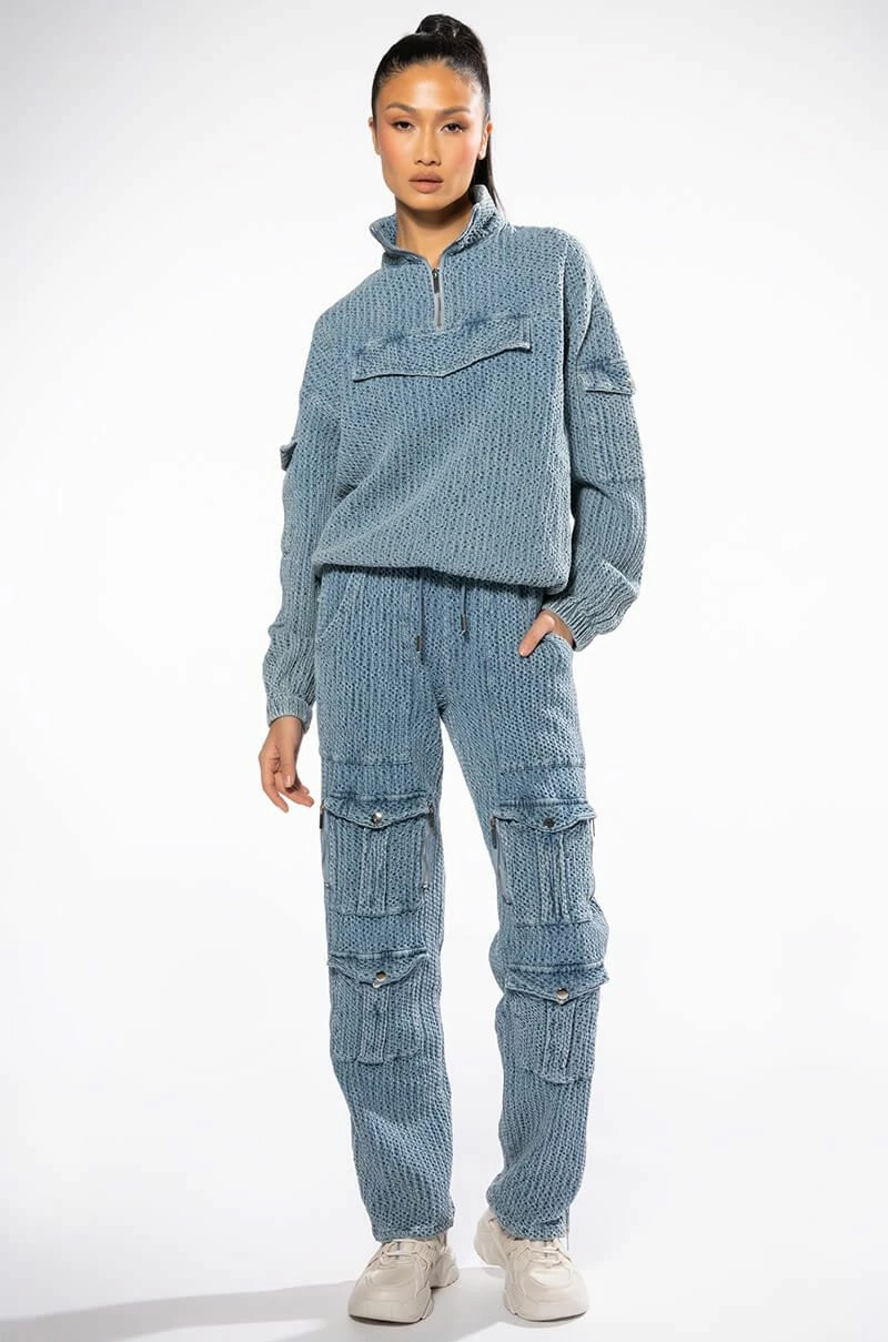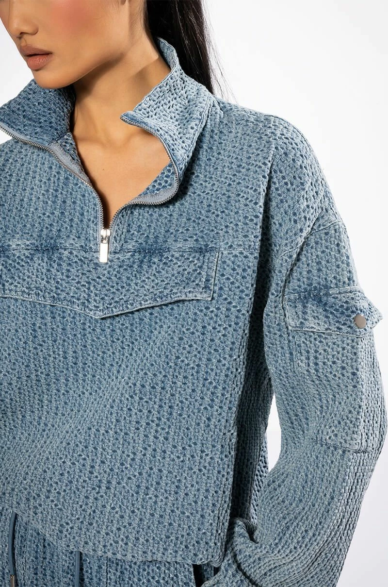 The AKIRA Label Monte Cozy Pocket Detail Half Zip Sweatshirt is made from a textured knit fabrication and features a standing collar, long sleeves with snap button pockets and ribbed elastic wrists, a center mock pocket detail, a boxy fit, and a ribbed elastic hem. Complete with a half zip front closure. Pair this piece with the coordinating AKIRA Label Monte Cozy Knit Pocket Detail Jogger to complete your look.
