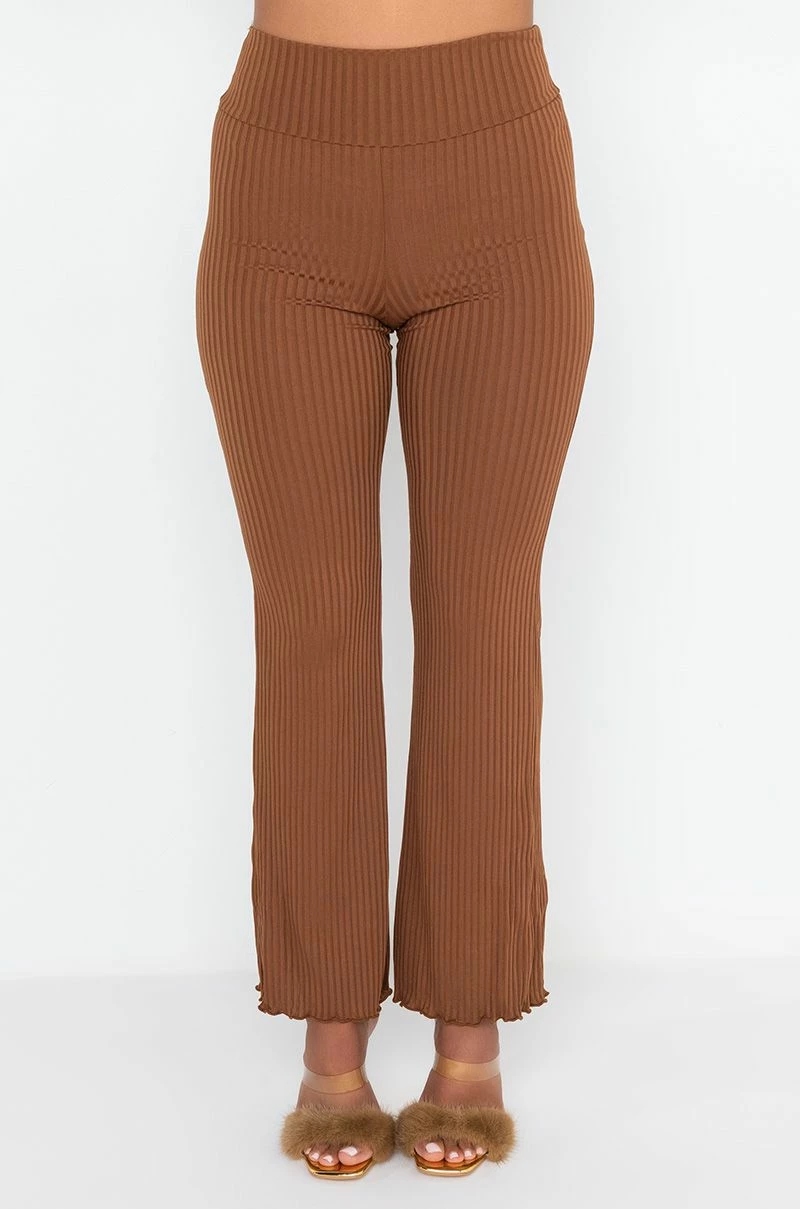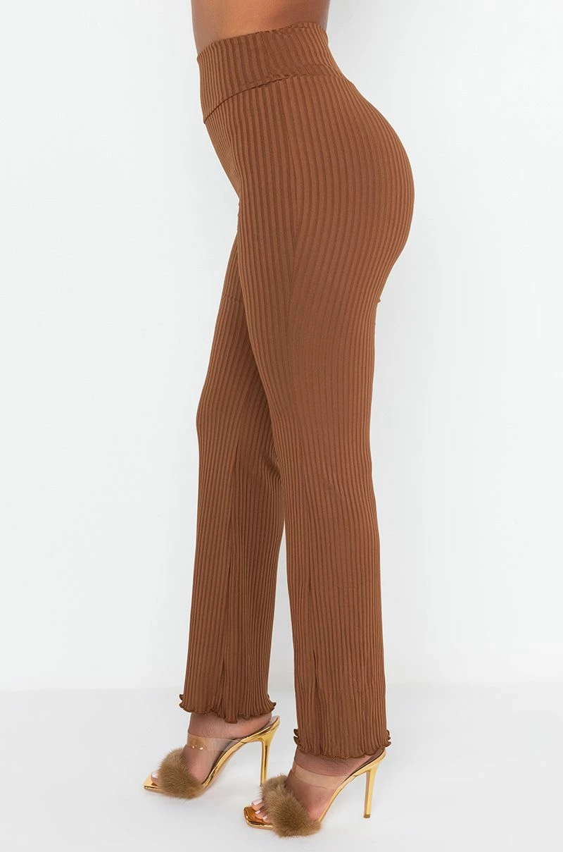 The AKIRA Label My Clarity Wide Leg Ruffle Pant is made from a ribbed fabrication, and is complete with wide pant legs, a lettuce trim hemline, and a stretchy high rise waistline.