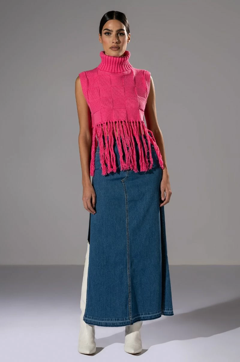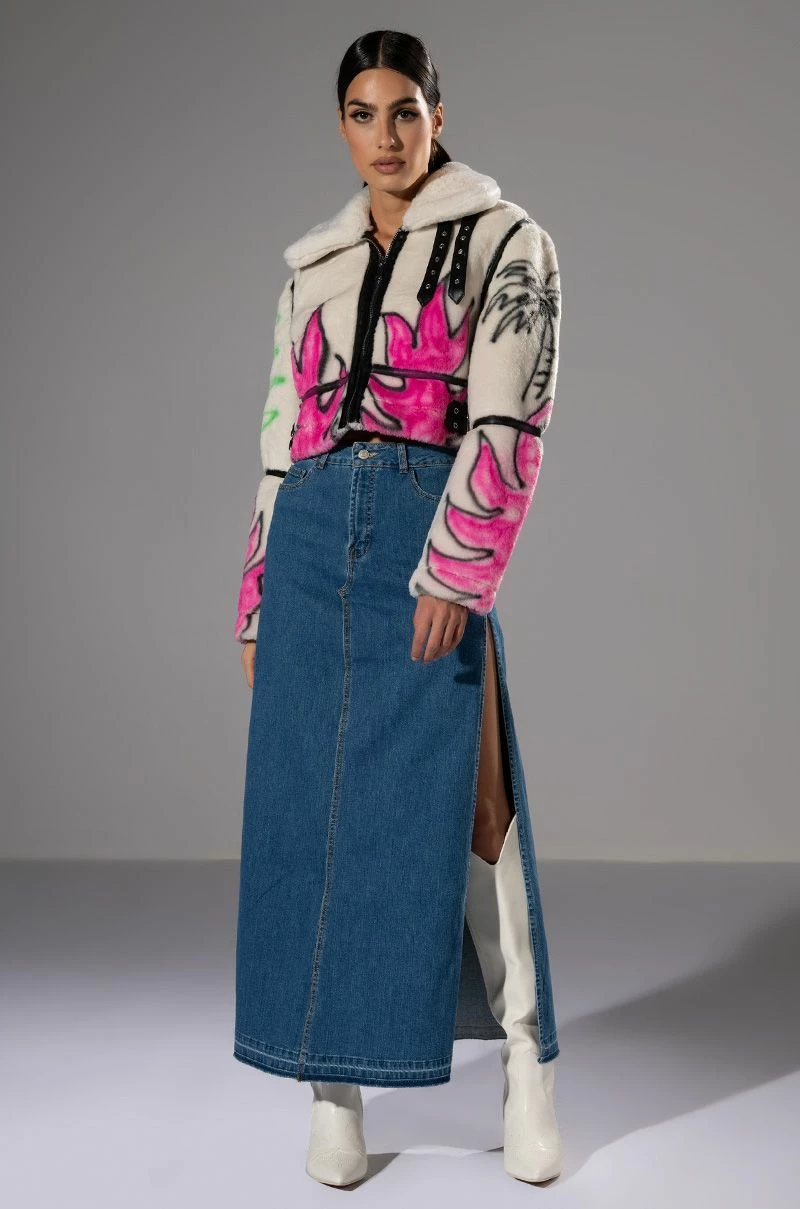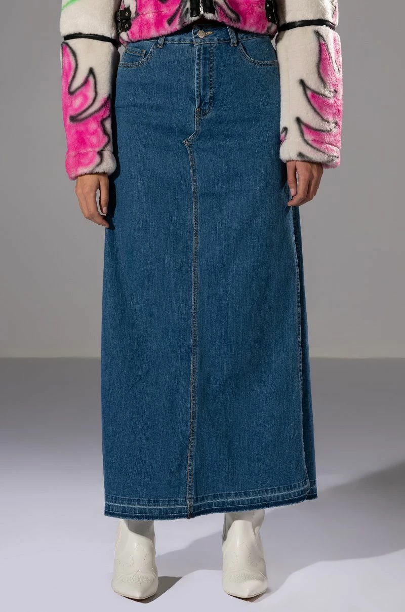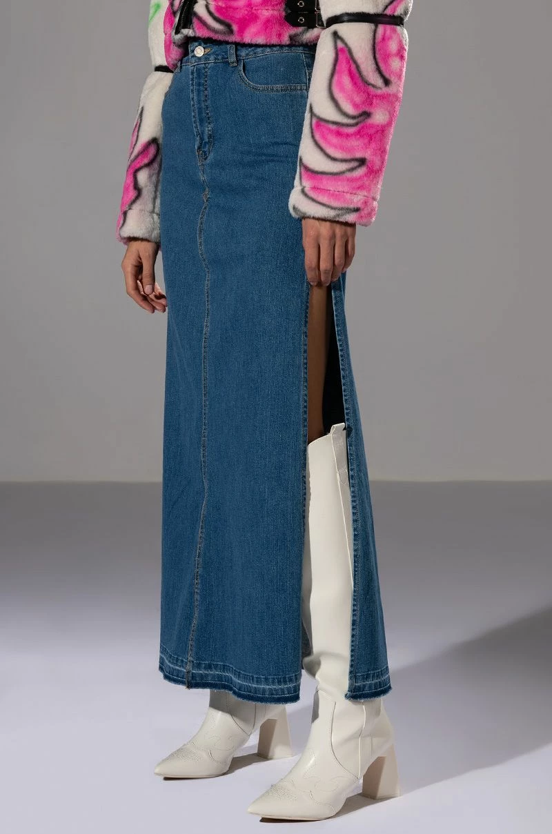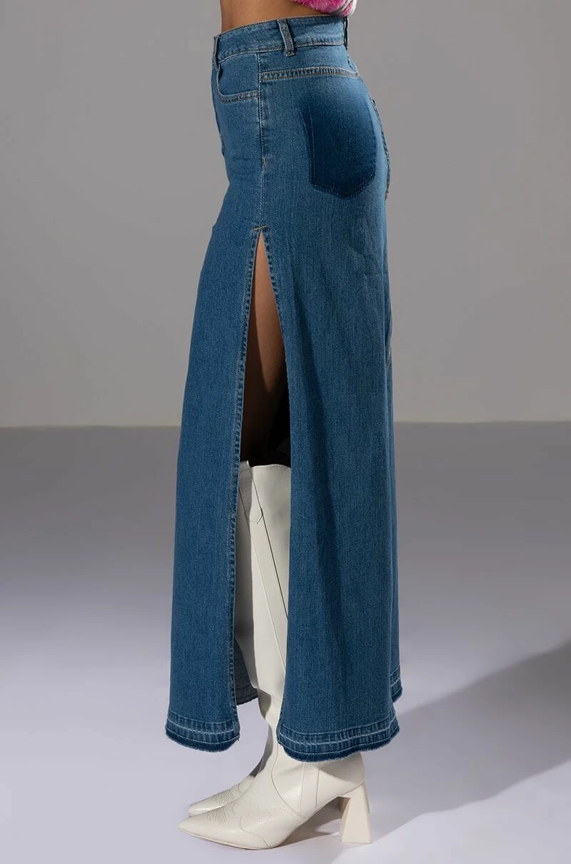 The Natalie Double Side Slit Denim Skirt is made from a denim fabrication and features a high rise waist, belt loops, one working back pocket design, high side slits, and a front button and zipper closure. Pair with a white cropped tee, square toe mules, and shades for an everyday look.
