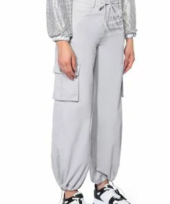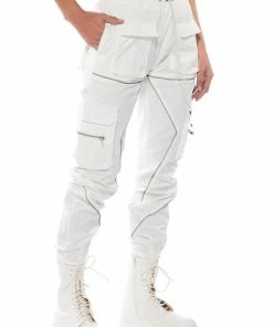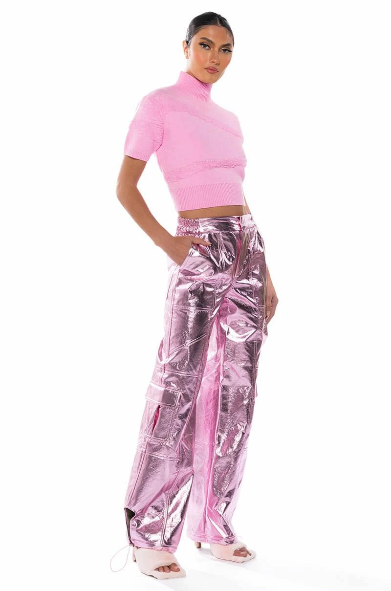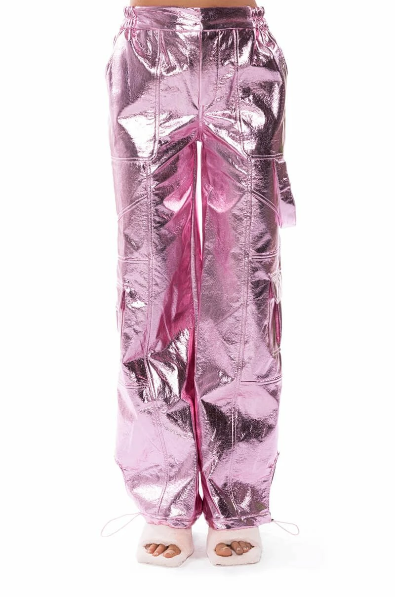 Star girl vibes. The AKIRA Label Out Of This World Metallic Cargo Pant is a textured metallic faux leather bottom featuring a high waist rise, a zipper fly hook and eye fasten, cargo flap side pockets, working back pockets, and a straight leg fit. Complete with ruched elastic waist detailing for a comfortable fit and adjustable toggle ankle hems for a convertible look. Pair with your favorite bodysuit and strappy stilettos to complete the ensemble.