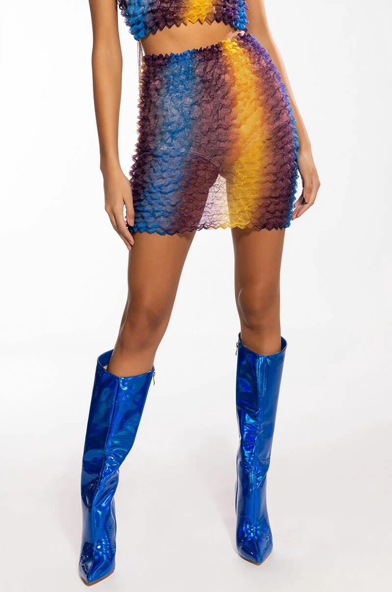 So sweet and refreshing. The AKIRA Label Paloma Textured Mini Skirt features an unlined popcorn textured fabrication, a tri-color base, and a mini length silhouette. Complete with a pull on design and tons of stretch. Style this mini with the coordinating AKIRA Label Paloma Textured One Shoulder Top..