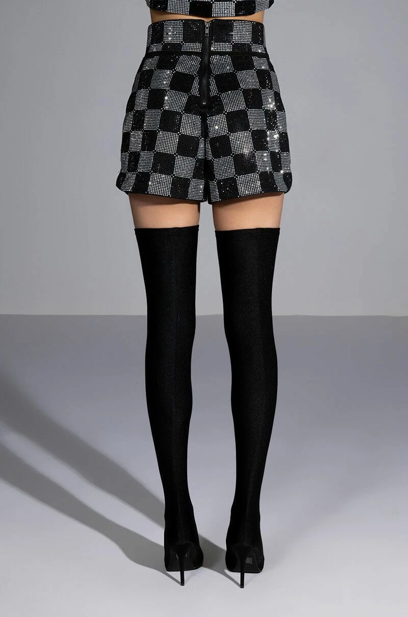Get your choreo ready, itβs time to put on a show in The AKIRA Label Pop Star Checkered Rhinestone Short. This rhinestone-embellished dolphin shorts features a high rise waistline, rhinestone checkered patterning throughout, slant side pockets, and a hot pant silhouette. Complete your look with The Pop Star Checkered Rhinestone Blazer.