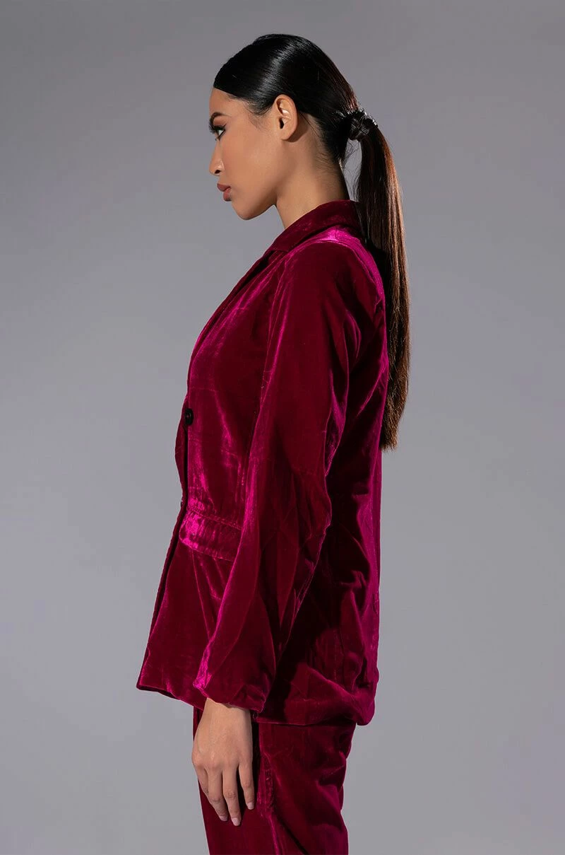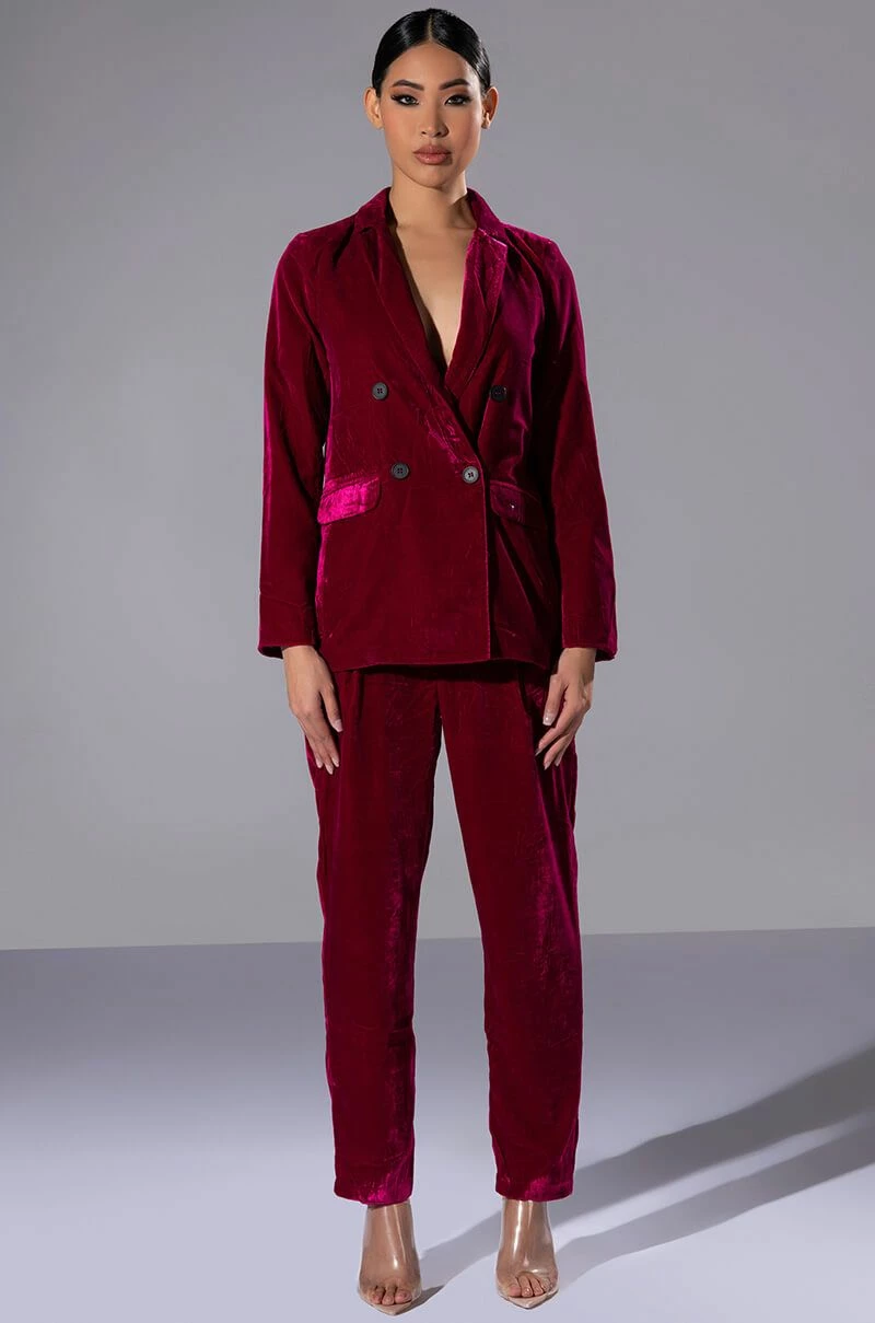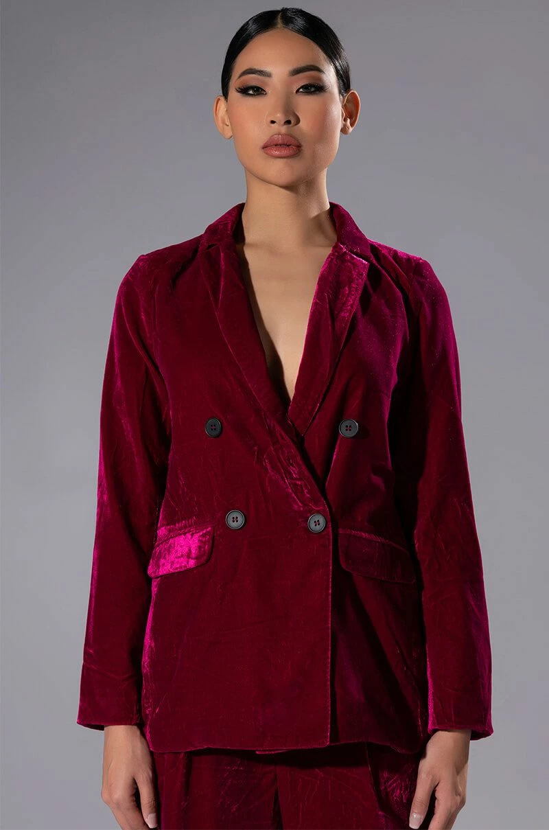 The AKIRA Label Pretty In Velvet Double Breasted Blazer is part of a killer boss babe two-piece set. This fitted blazer is made from a soft, velvet base, featuring a fold over notch collar and two front flap pockets. Complete with a stylish double breasted button front closure and a sleek inner lining. Pair with the coordinating The AKIRA Label Pretty In Velvet Trouser for the completed glam look!