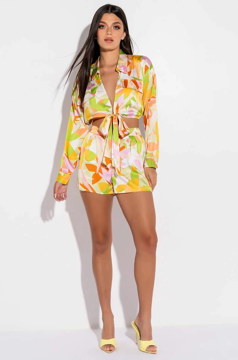 Shake what your mama gave you in The AKIRA Label Put In Work Satin Shorts. These slightly stretchy satin shorts feature a high rise silhouette, a pleat front design, a graphic yet organic print pattern, and a front hook and eye zipper closure. Complete with a cinched elastic back waistband. Pair with the coordinating AKIRA Label Put In Work Tie Front Satin Cropped Blouse.