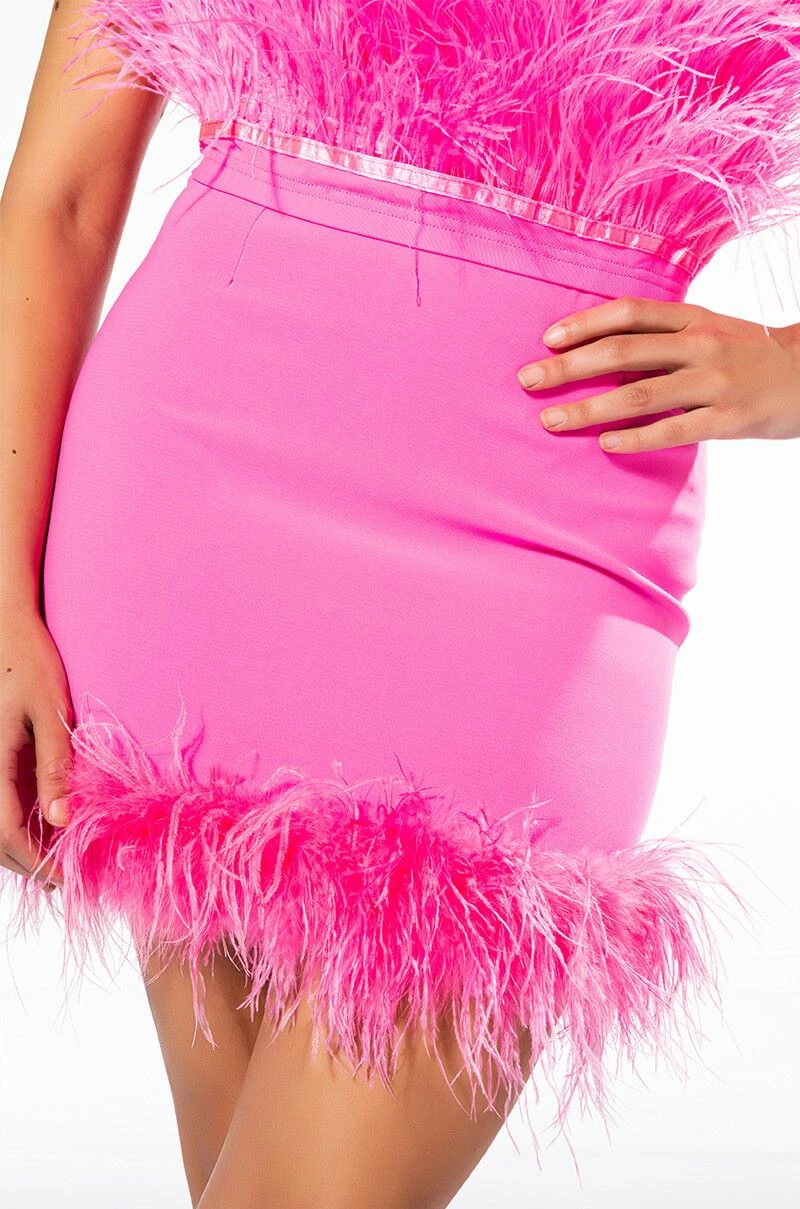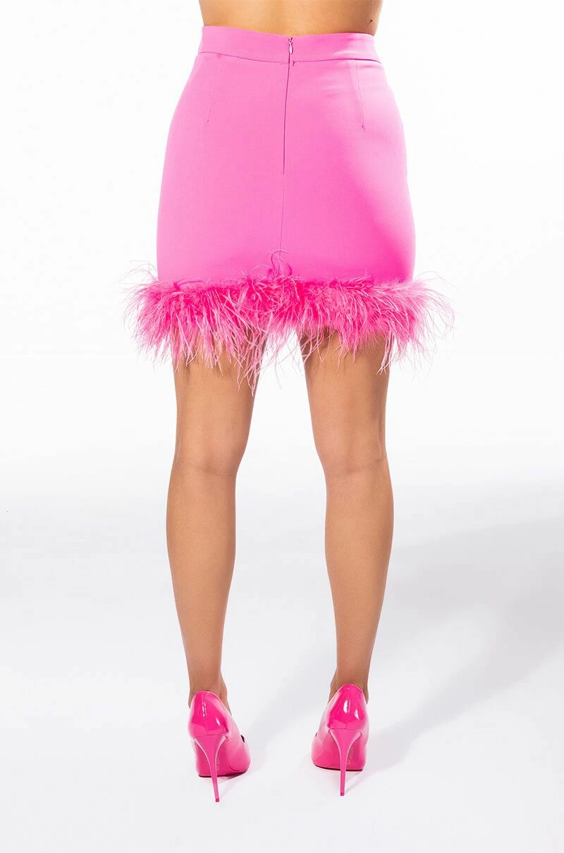Cheers! The AKIRA Label Raise Your Glass Feather Trim Mini Skirt is made from a lightweight blazer fabrication and features a high rise waist, a wide waistband, stitched detailing, a mini length silhouette, a bodycon fit, opulent feather trim along the hem, satiny lining, and a tonal back zipper closure. Pair this piece with the matching AKIRA Label Raise Your Glass Feather Trim Blazer and patent pumps to complete your look.