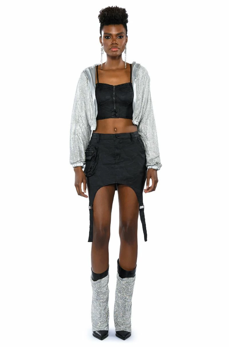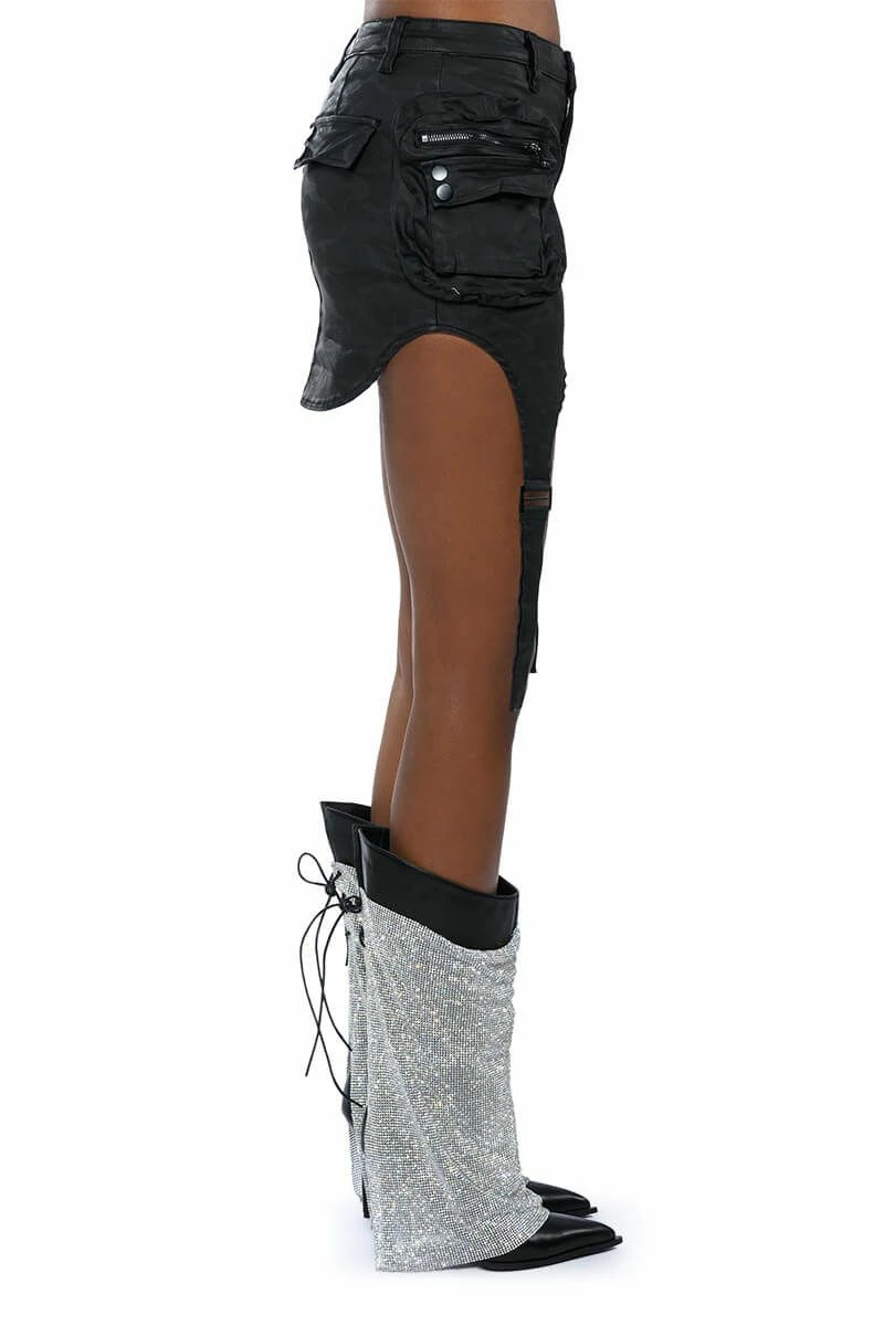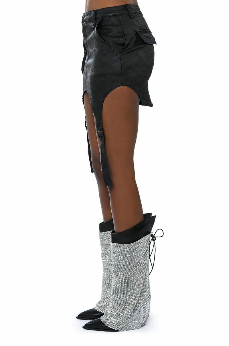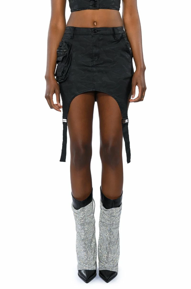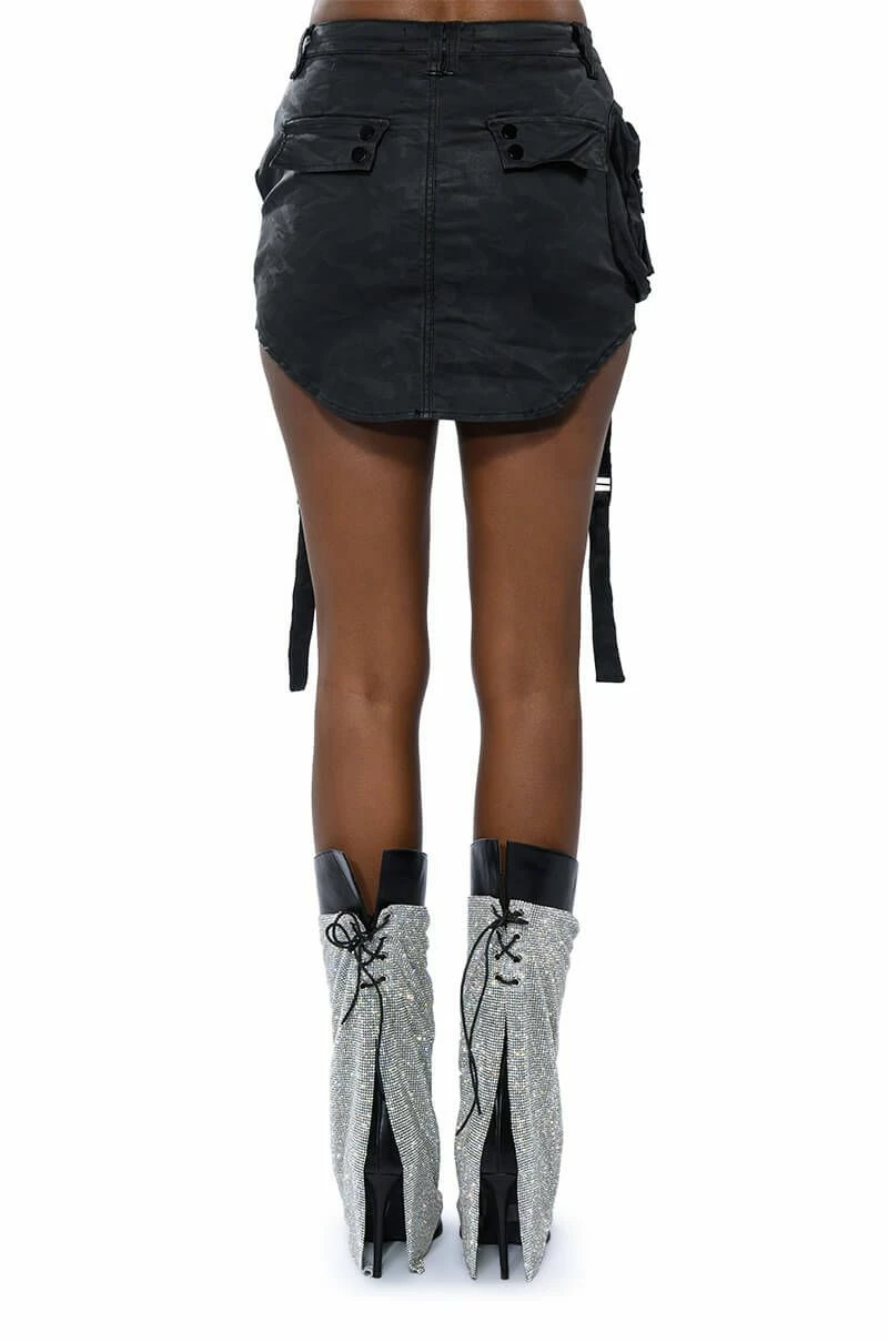 The AKIRA Label Ranger Camo Cargo Mini Skirt is made from a textured, lightweight fabrication and features a subtle camo print, a high rise waist, working belt loops, a slant side pocket, layered zipper and flap cargo side pockets, mock flap back pockets, a rounded hem with buckled garter detailing, a mini length silhouette, and a button and zipper front closure. Pair this piece with the matching AKIRA Label Ranger Camo Corset Crop Top and combat boots to complete your fierce look.