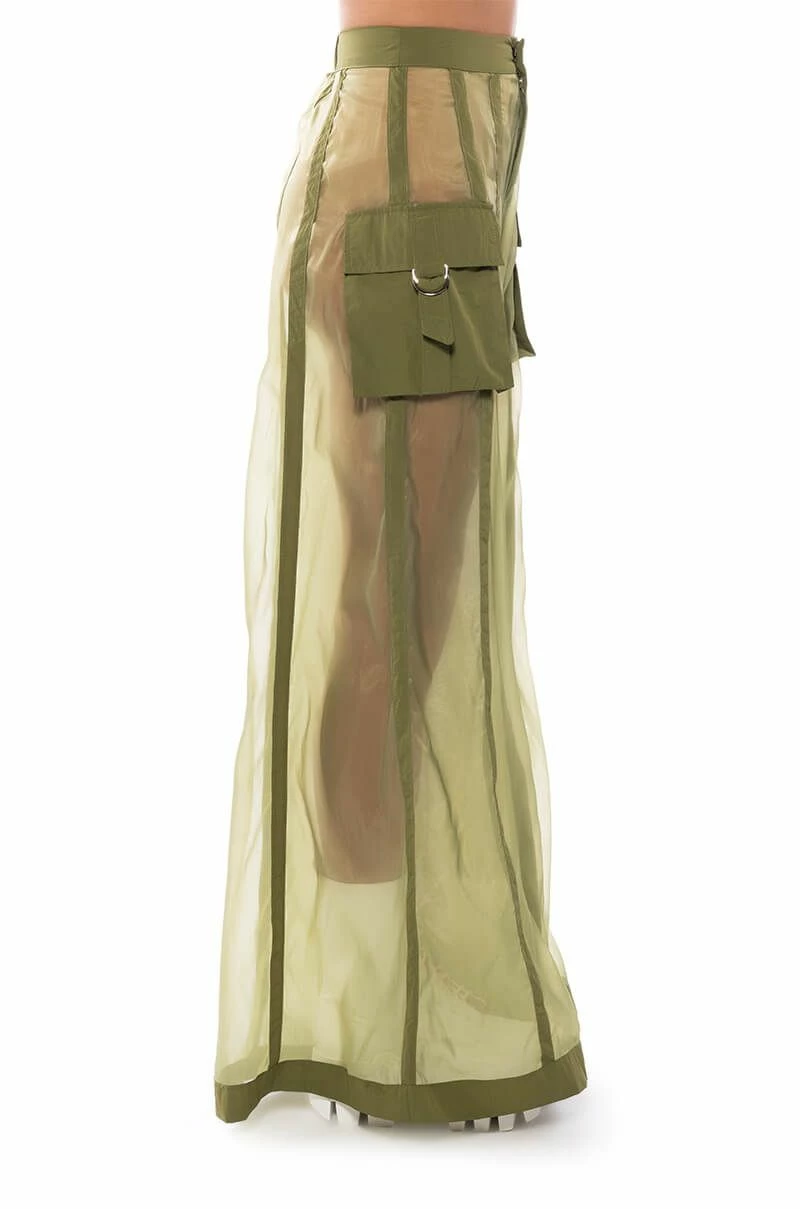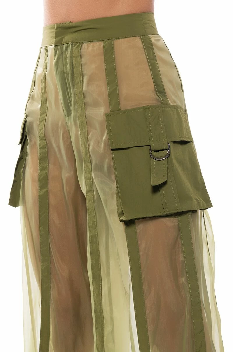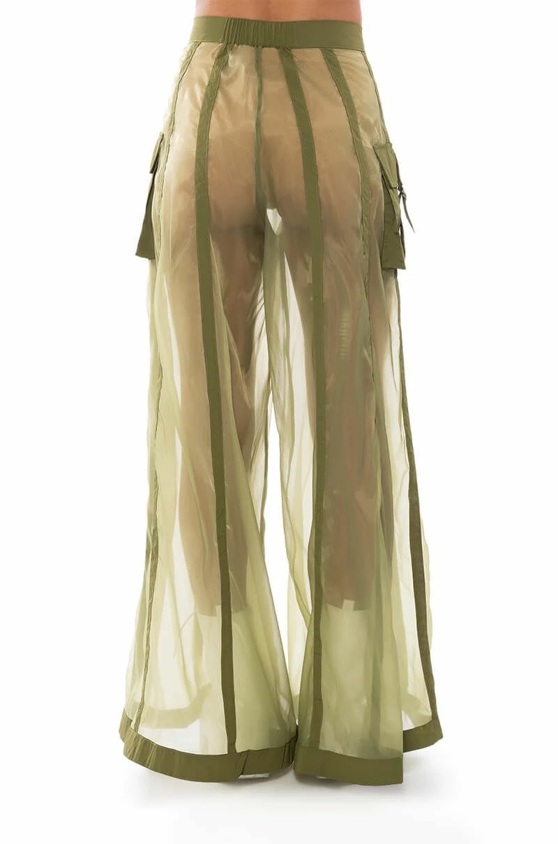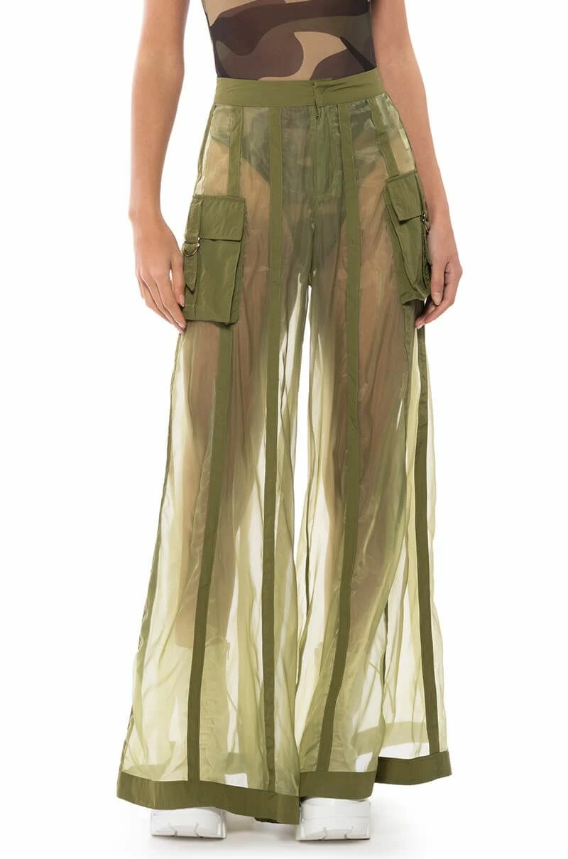 The AKIRA Label Sage Wide Leg Trouser is part of a flowy chic two-piece set, made from a sheer, polyester base fabrication and featuring a striped mesh paneling design, a high waist, buckled cargo flap pockets on the sides, and elastic at the back waist for a more comfortable fit. Complete with an extra wide leg silhouette and a zip-up to hook-and-eye front closure. Style with the coordinating top, The AKIRA Label Sage Button Down Shirt, for a finished look.