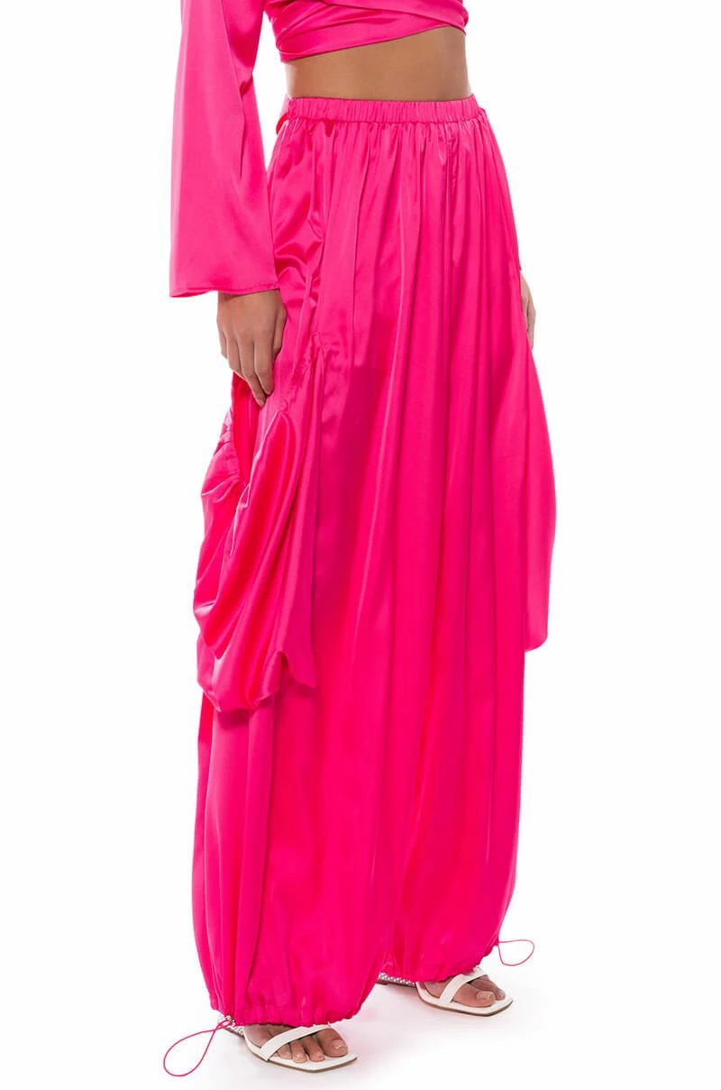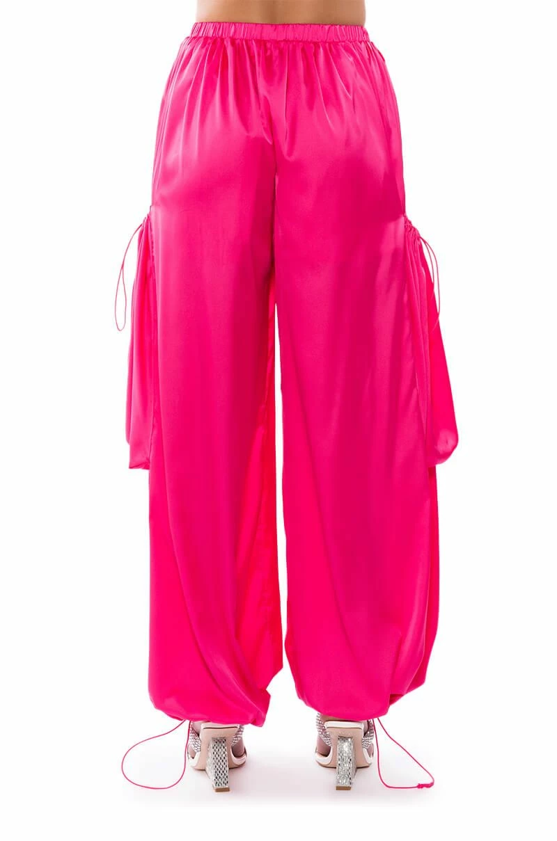 Who knew baggy pants could be this sexy? The AKIRA Label Saucy Baggy Cargo Pants are part of a luxe, satin two-piece set, featuring a high waist, ruched elastic waistband, large baggy drawstring side pockets, and adjustable drawstring bottom hems. Complete with a slip-on fit and a parachute pant silhouette. Style with the coordinating top, The AKIRA Label Saucy VNeck Wrap Top, and fur-trimmed slides for a chic, loungewear look.