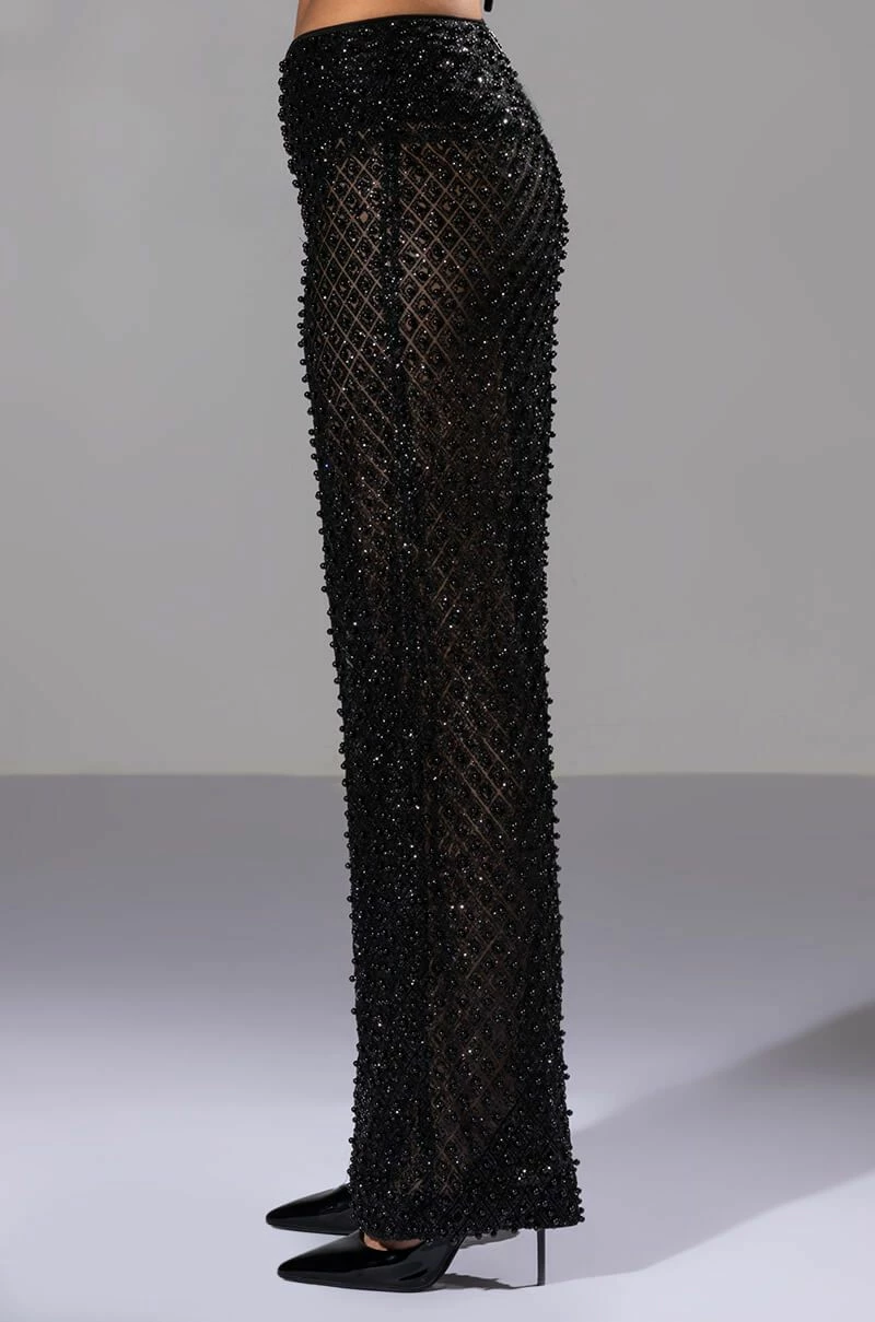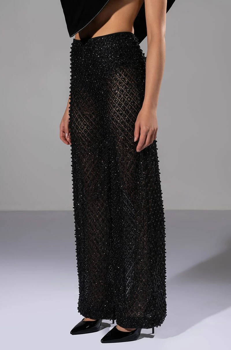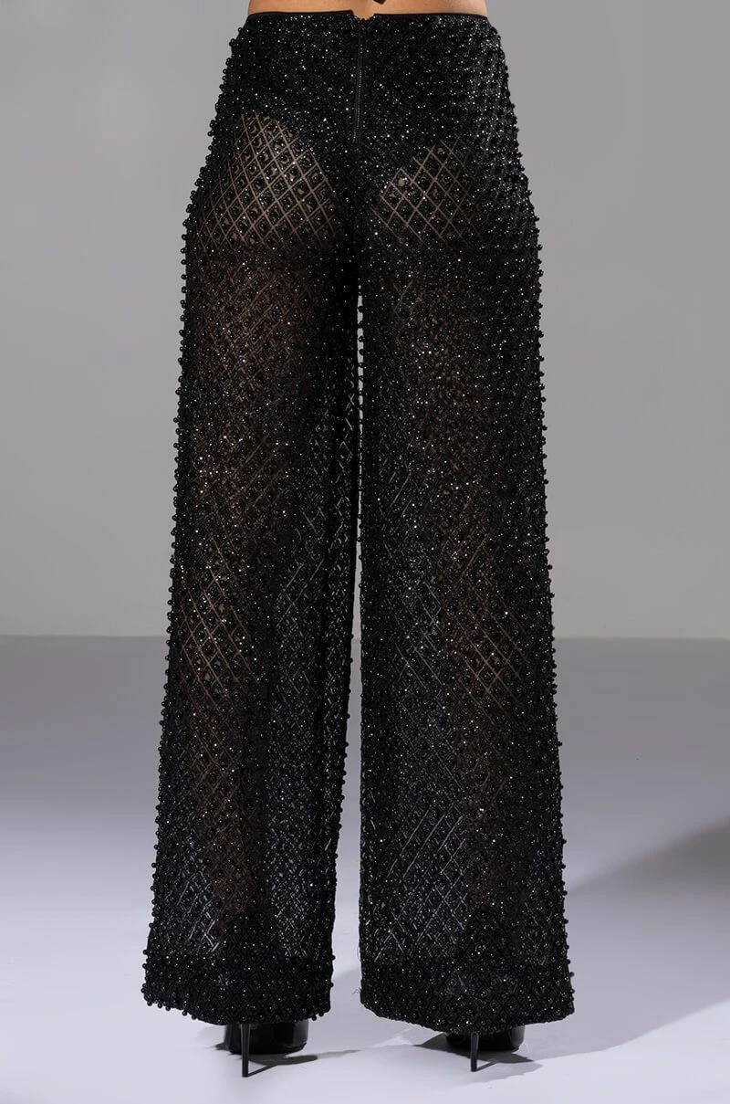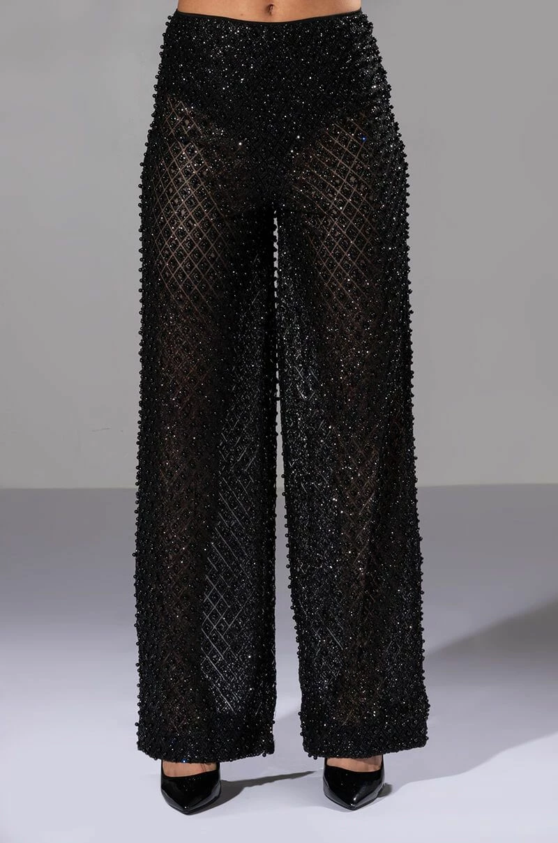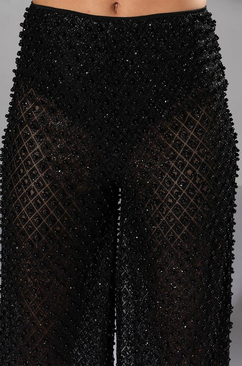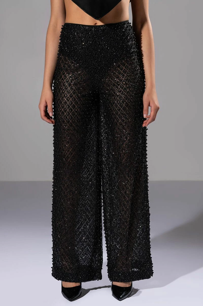 The AKIRA Label Sexy Villain Sheer Wide Leg Glitter Detail Pants features a sheer mesh fabrication, all-over glitter detailing, tonal beaded accents, a high rise waist, and a wide leg silhouette. Complete with a smooth, panty-inspired inner satin lining and an exposed back zip closure