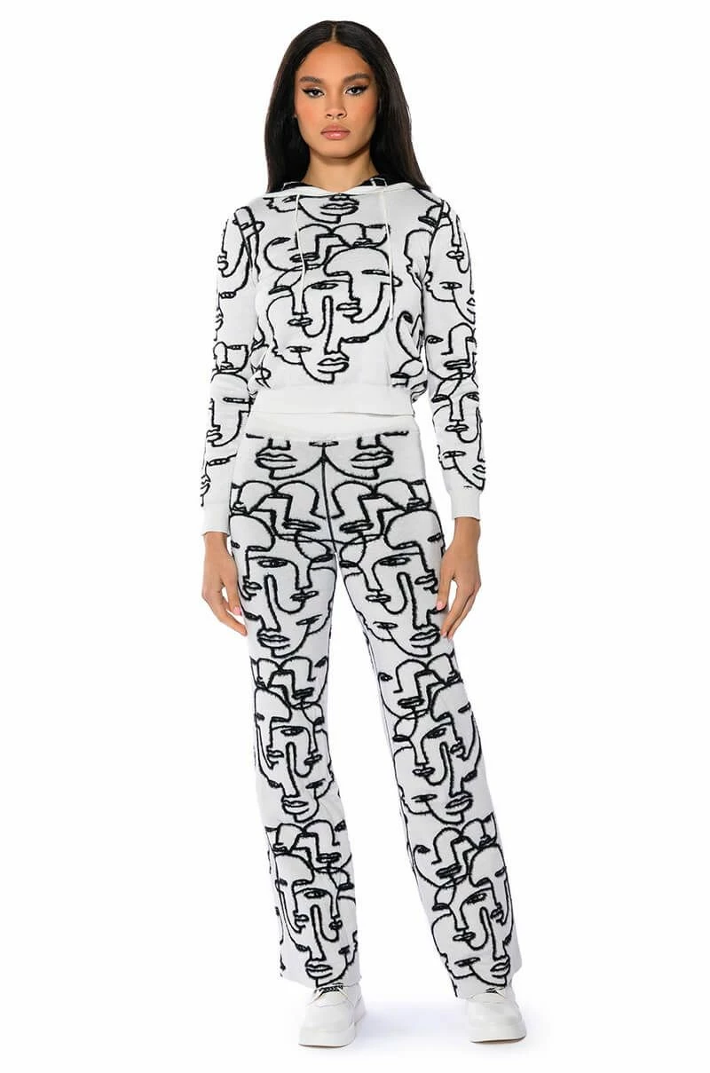 The AKIRA Label She’s Giving Art Reversible Wide Leg Knit Pant is a part of a stylish two-piece athleisure set. Perfect for your New Year’s wardrobe, these high waisted pants are made with a soft, stretch knit base fabrication and an all over fuzzy line art design. Complete with an elastic waistband, raw cut bottom hems, a wide leg silhouette, and a pull-on fit. Turn these pants inside out for the inverse design! Pair with the coordinating AKIRA Label She’s Giving Art Long Sleeve Hooded Sweater and chunky heeled boots for a sleek athleisure look and a night at the museum.