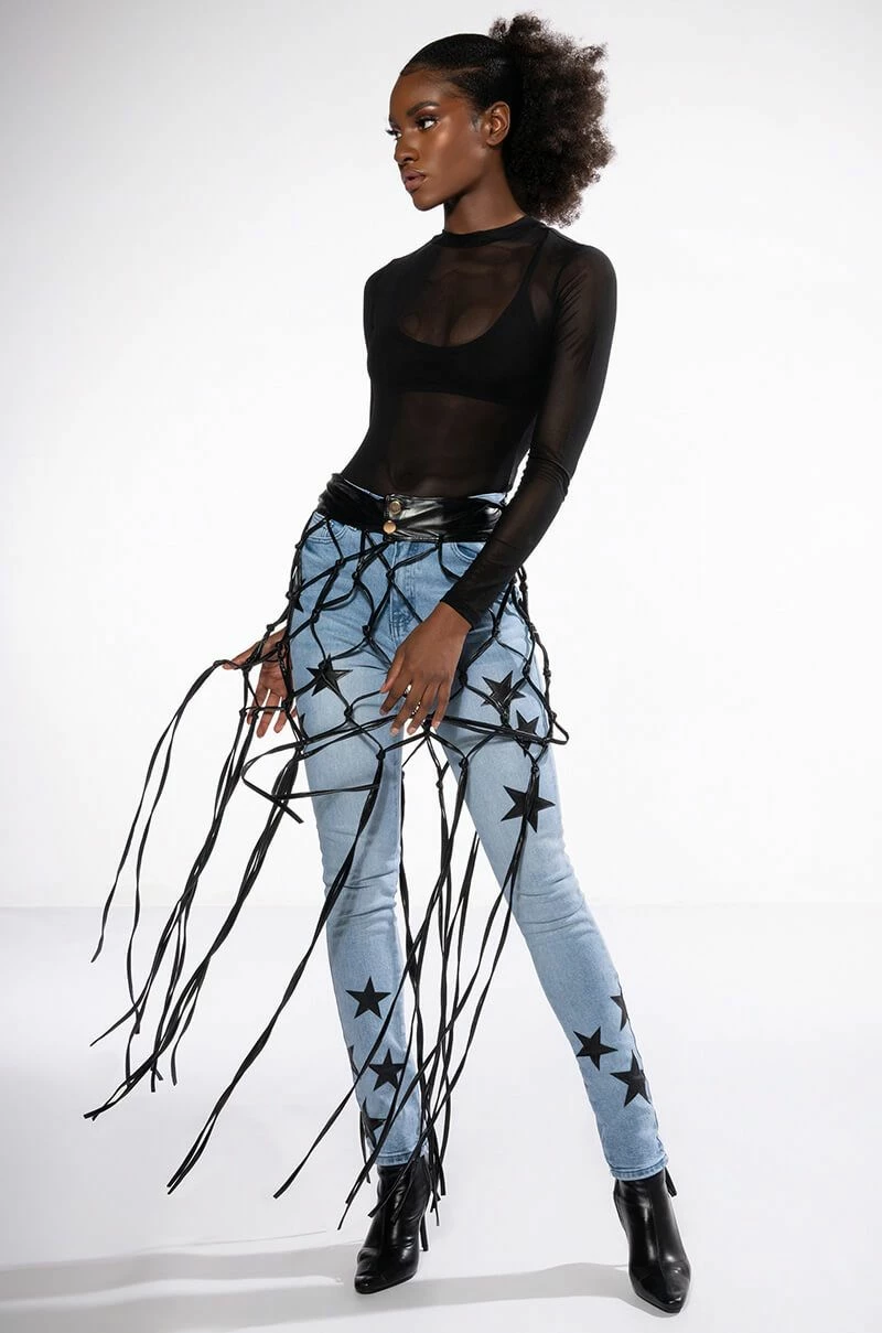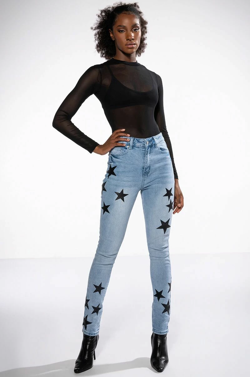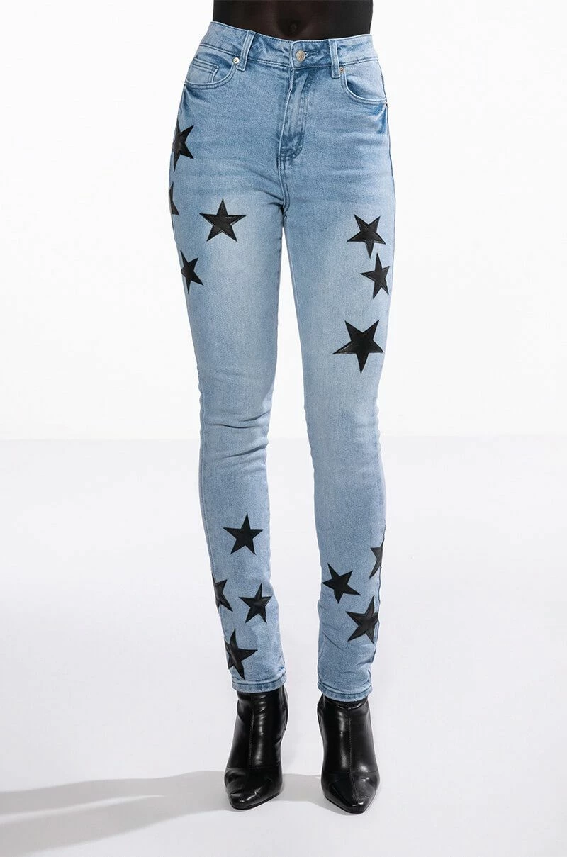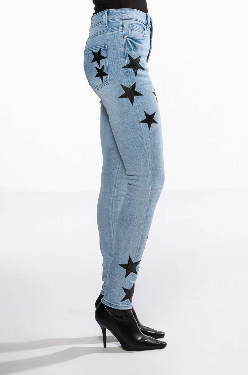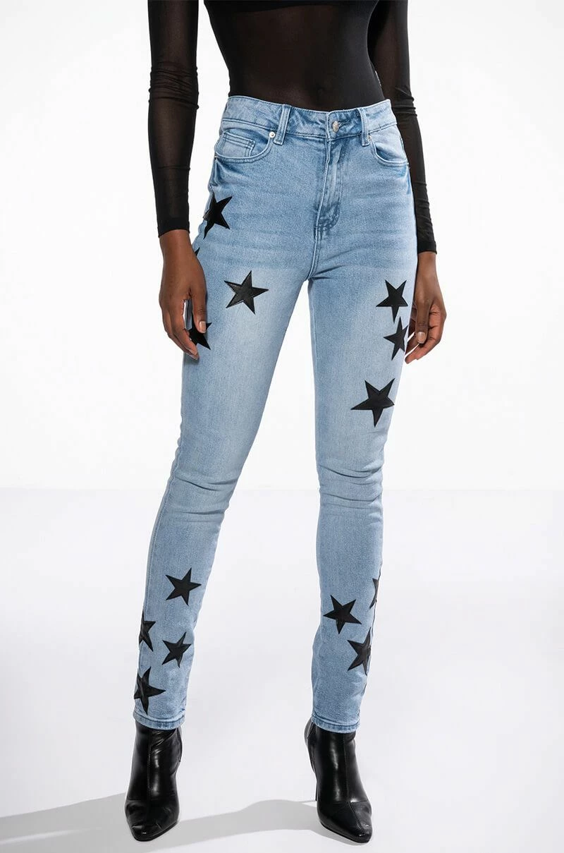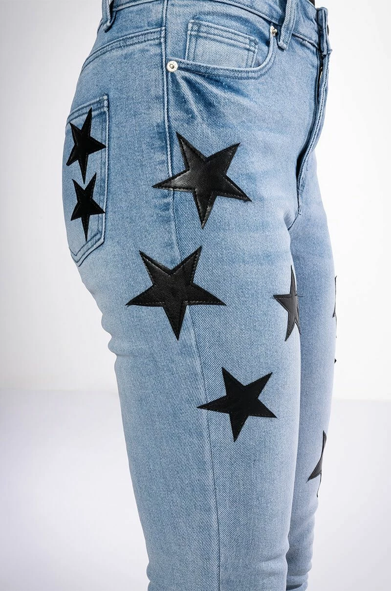 The AKIRA Label Shining Star Patch Detail High Rise Skinny Jean is made from a washed denim fabrication and features a high rise waist, working belt loops, a classic five-pocket design, whiskering on the upper thighs, stitched vegan leather star patch detailing, and a skinny leg silhouette. Complete with a button and zipper front closure.