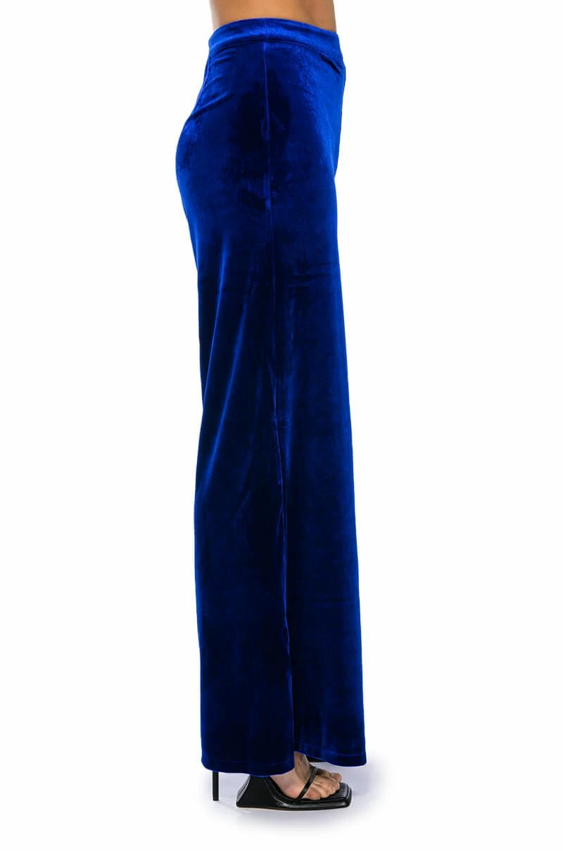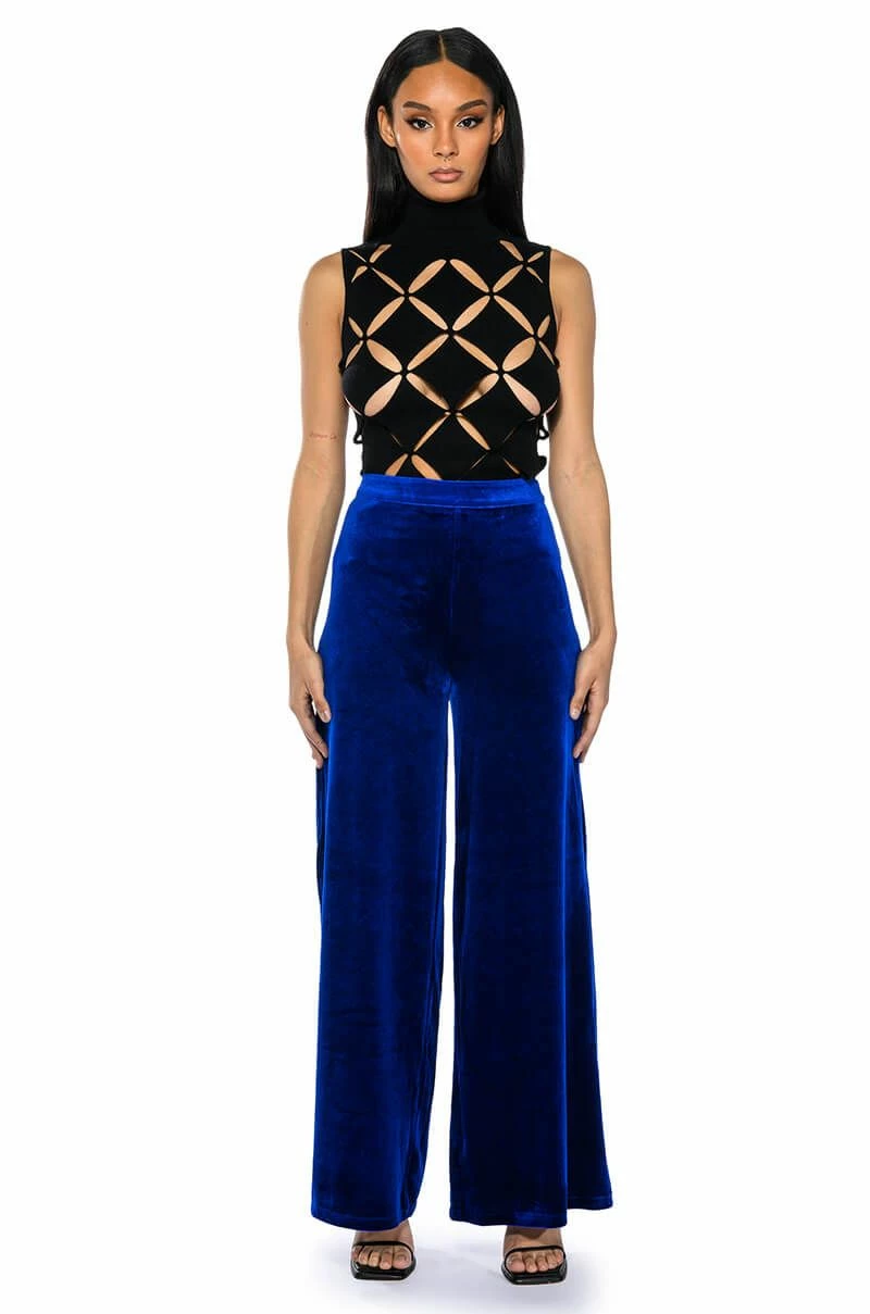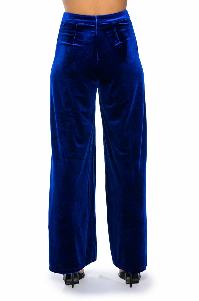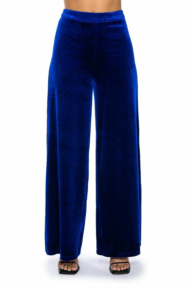 The AKIRA Label Show Me Love Velvet Wide Leg Trouser features a soft, velvet base, a high rise waist, and a wide leg silhouette. Complete with a zipper to hook-and-eye back closure.